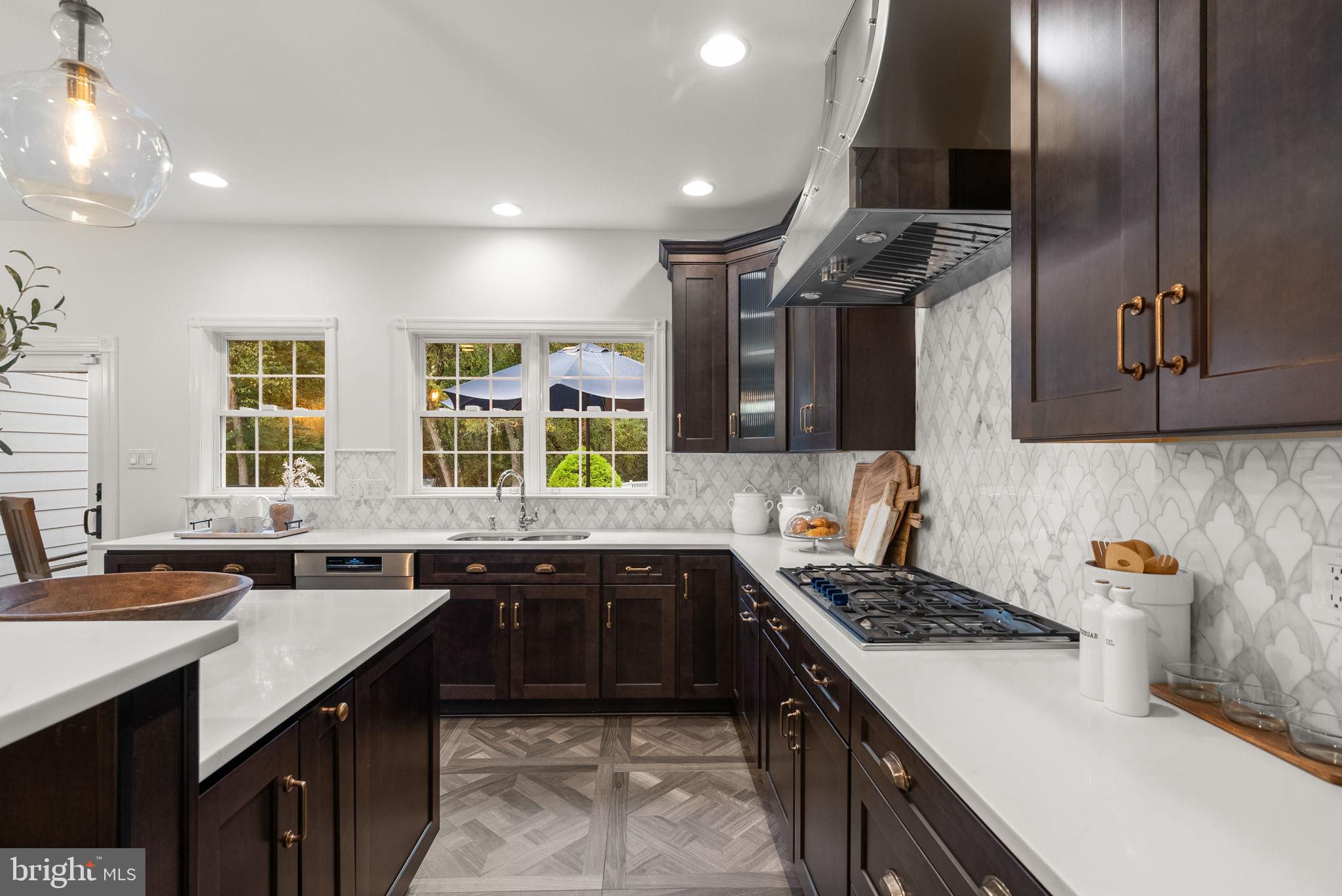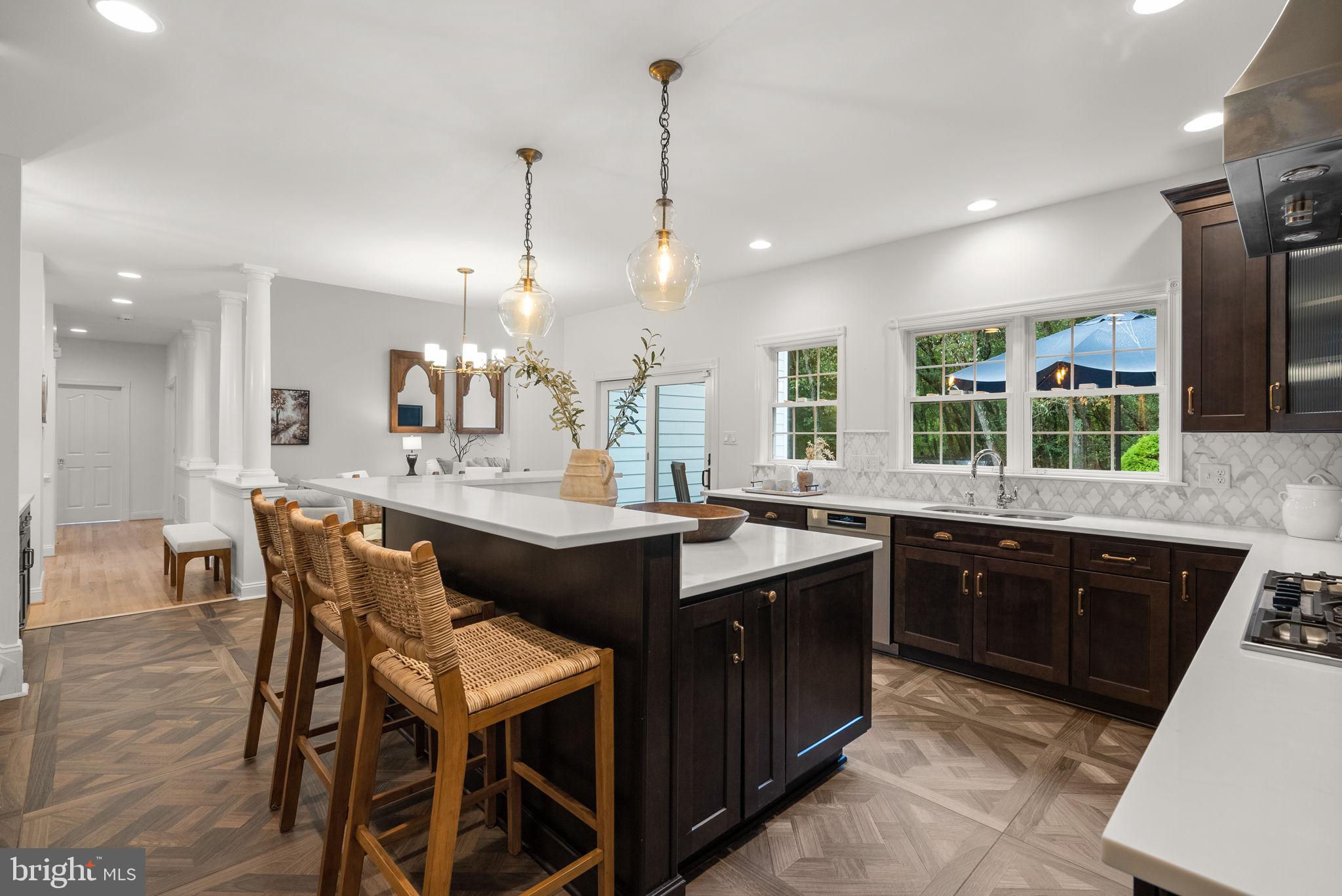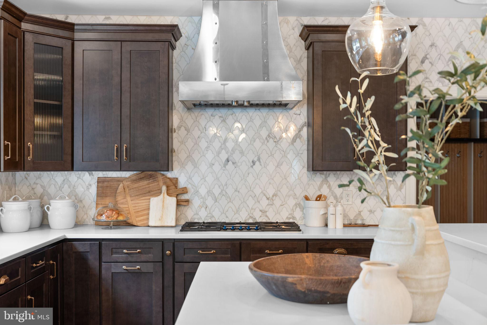 Welcome to The Kingsway Haven, a remarkable residence showcasing an array of indoor and outdoor spaces curated for luxurious living. Completely reimagined and thoughtfully renovated in 2022, this property is truly a haven for clean living with refined upgrades and wellness-driven design. The home backs to forest preserve and is tucked on a 0.7-acre homesite on a quiet cul-de-sac in the desired Kingsbridge community in Howard County’s Centennial School District. This prime location in Ellicott City is convenient to dining, shopping, parks, schools, country clubs, commuter routes, BWI airport, and more. Exterior amenities reflect a resort-style sanctuary. A Trex® deck invites al fresco dining, and overlooks a fenced saltwater pool and spa surrounded by a stone patio and mature landscaping. Meandering stepping-stone pathways lead to the custom garden house or art studio, the stacked stone fire pit area, and the spectacular imported Belgian Orangerie—a truly dreamy space for growing plants, cozying up with a morning coffee, or hosting magical starlit dinners. Inside, hand-sanded oiled oak floors, bespoke built-ins, and soaring windows fill the interior with natural light and elegance. A two-story foyer with a sparkling chandelier opens to the formal living room and the formal dining room with custom inlay floors, wainscoting and dentil mouldings, a tray ceiling, and chandelier. Ahead, the two-story great room unfolds, defined by elegant columns, vaulted ceilings, and a marble mosaic fireplace framed by treetop views through dramatic windows. Continue and find a chic powder room and a study with French doors, elegant mouldings, built-ins, and a bay window. The English-inspired kitchen is a chef’s dream equipped with imported marble mosaics on walls and backsplash, Italian parquet tile floors, an oversized tiered quartz island with breakfast bar seating, rich cabinetry, pendant lighting, and an appliance suite including a Gaggenau® plumbed steam oven, Thermador® 5-burner range, Elica® designer hood, and Bosch® 800 Series refrigerator, oven, and dishwasher. An English café station with a built-in coffee bar and a custom English pantry complete this gourmet space, along with a breakfast area which accesses the deck. Just beyond, a mudroom features built-in cubbies, a built-in laundry station, cabinetry, plus a shower or dogwash station providing practical convenience for days spent enjoying the pool and outdoors. Upstairs, rich hardwoods grace the floors and hallway leading to the Cotswolds-inspired primary suite. This serene retreat boasts two cedar walk-in closets, a tray ceiling, and a sitting room with columns and custom built-ins. The spa-like bath offers indulgent amenities: a copper soaking tub, a steam shower, a dual-sink vanity, a fireplace, a linen closet, and built-in shelving. Three additional bedrooms and beautiful bathrooms complete the upper level—including one with a whimsical built-in reading nook. A secondary rear staircase leads down to the kitchen. Downstairs, the finished lower level is highlighted by wide-plank oak floors, a recreation lounge anchored by a stone-surround fireplace with built-in bookcases, and several defined spaces perfect for dining, entertaining, or playing. A versatile bonus room, a full bath, a walkup to the yard, and a fitness or yoga studio with mirrored walls and built-ins complete this spacious level. This home was updated in 2022 with extensive and expensive upgrades including all new HardiePlank siding and trim, bronze gutters with integrated gutter guards, roof with CertainTeed Landmark Pro Designer architectural shingles with advanced underlayment and flashing, all new shutters throughout, a new Trane HVAC system, a whole-house air filter and humidifier, and a new cast iron sump pump. Move right in and immediately enjoy the wonderful turn-key value and lifestyle. This is more than a residence—it’s a haven for elevated living. Let your new memories begin!