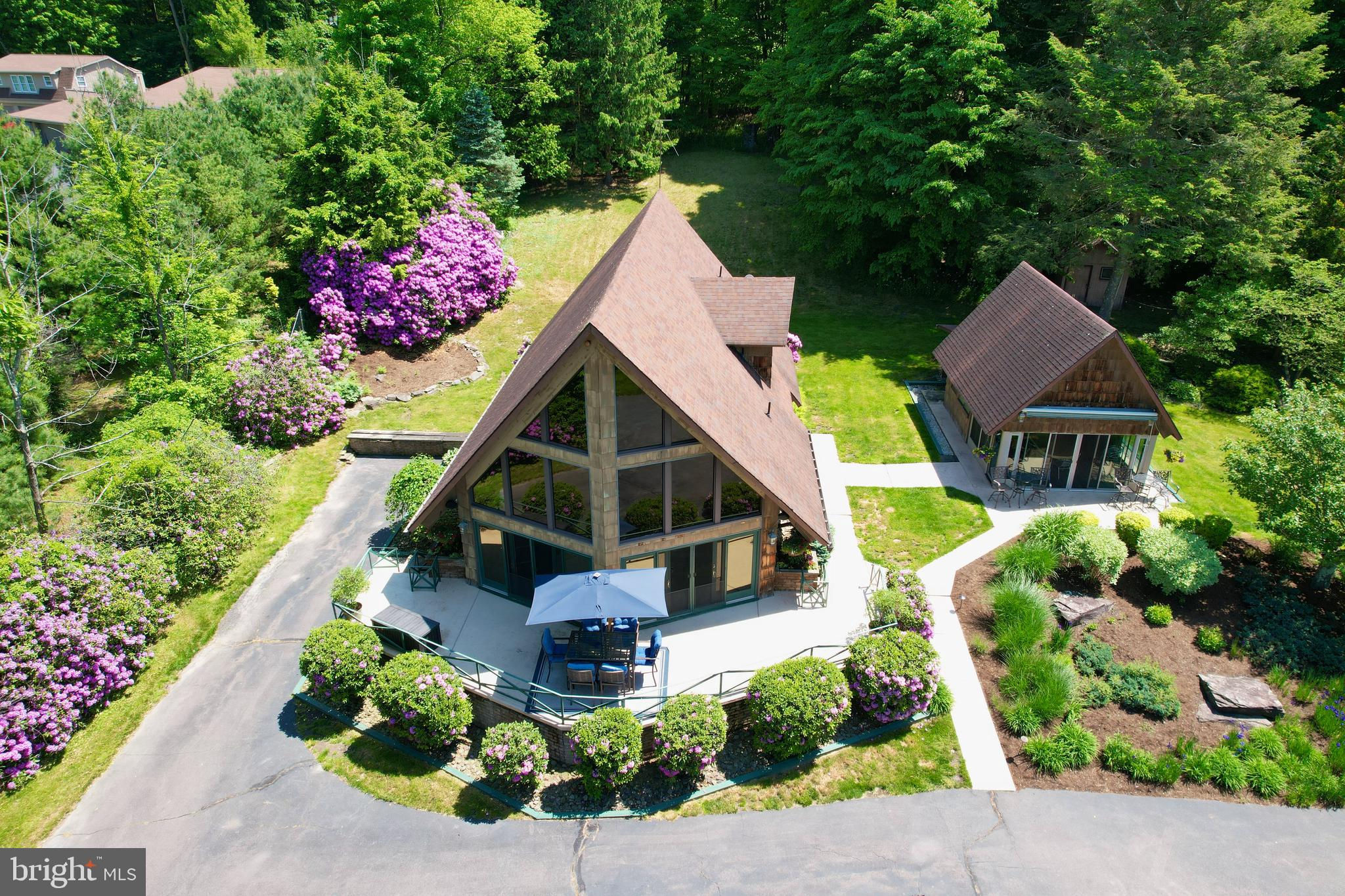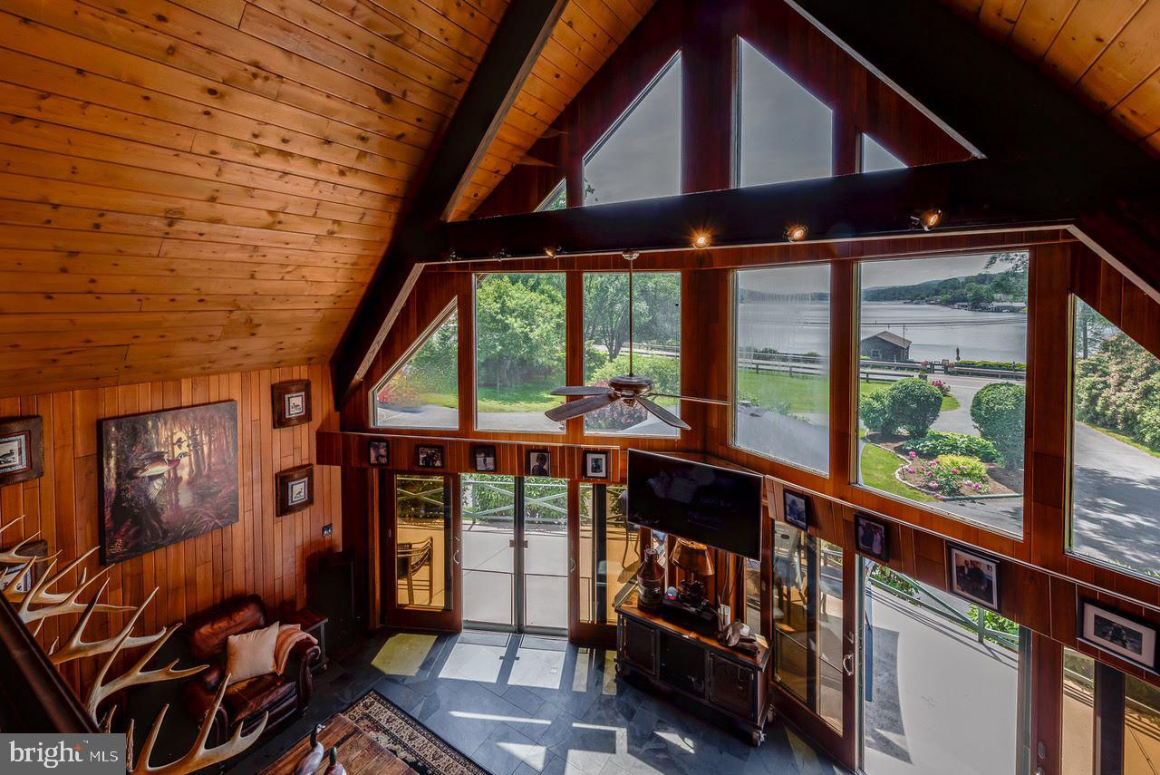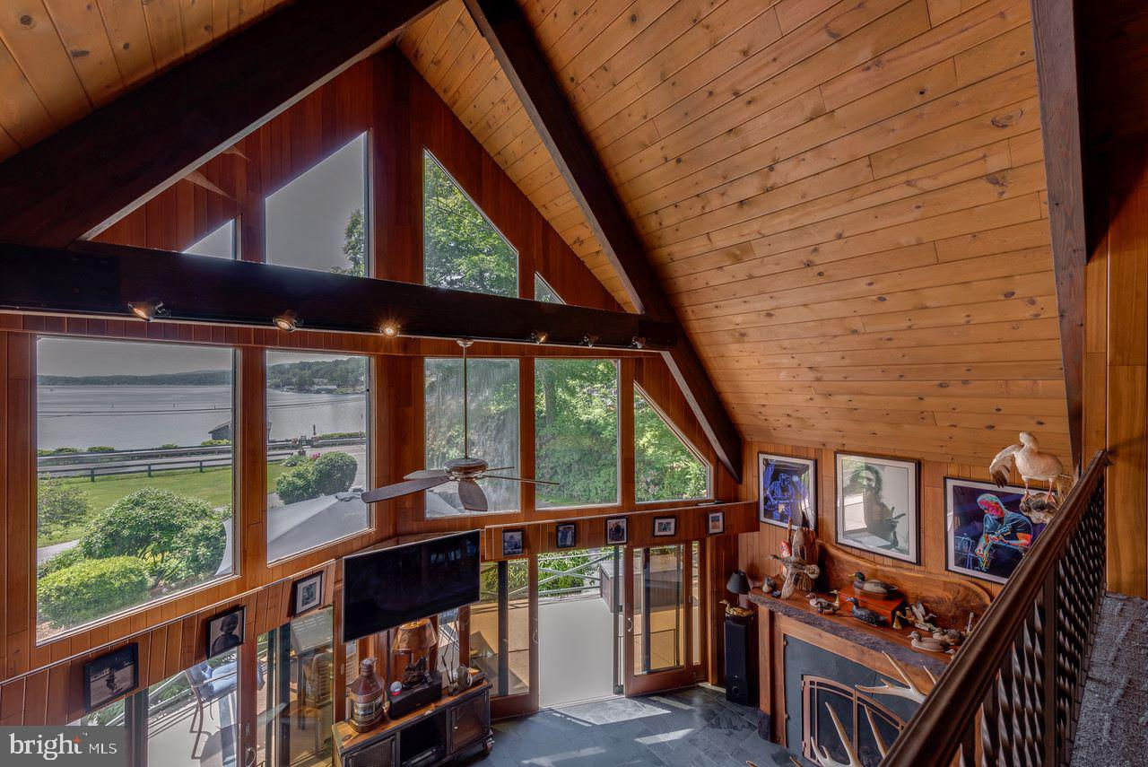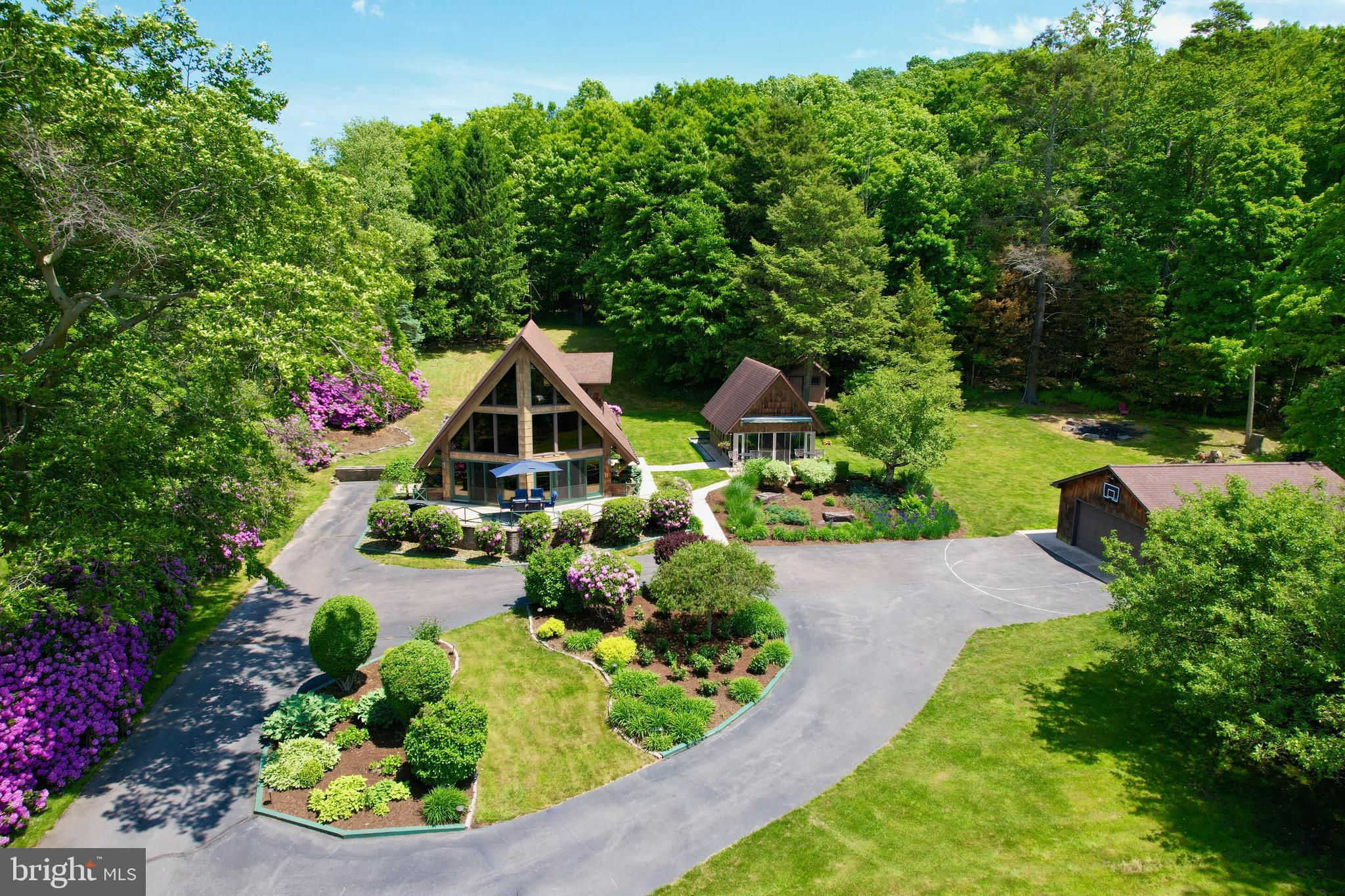 This A-frame house is a stunning retreat nestled on 2 flat acres with 128' of lake front on Alderson Cove, the perfect location on Harvey's Lake. Lush, manicured lawns, picturesque views, and a cozy, rustic atmosphere provides a year-round retreat. The house features custom walnut interior, 3 bedrooms, a 5-bunk dorm loft, 4 bathrooms, detached 2-car garage, and a private entertainment lodge with sliding glass doors and a fully equipped kitchen. The boathouse and new dock sit on the quiet end of the lake where a natural shoal keeps boat traffic to a minimum ensuring a tranquil and private waterfront experience. Whether you're boating, fishing, or simply soaking in the stunning lake views, this A-frame house offers a perfect blend of relaxation and rustic charm. ***AGENTS PLEASE SEE PRIVATE REMARKS.