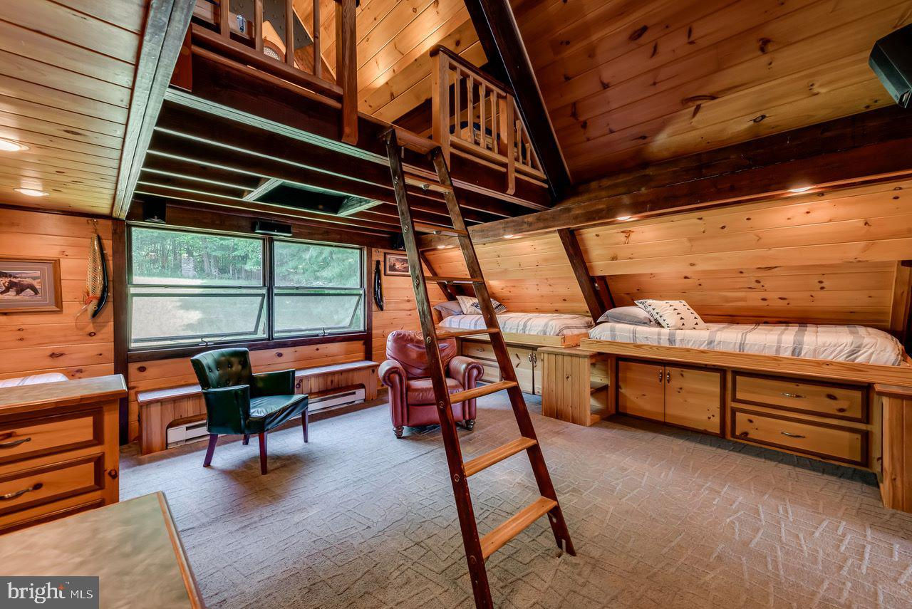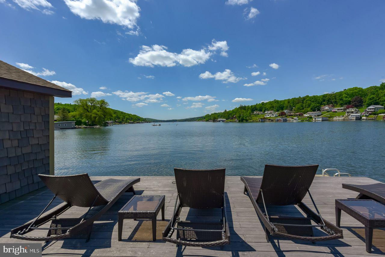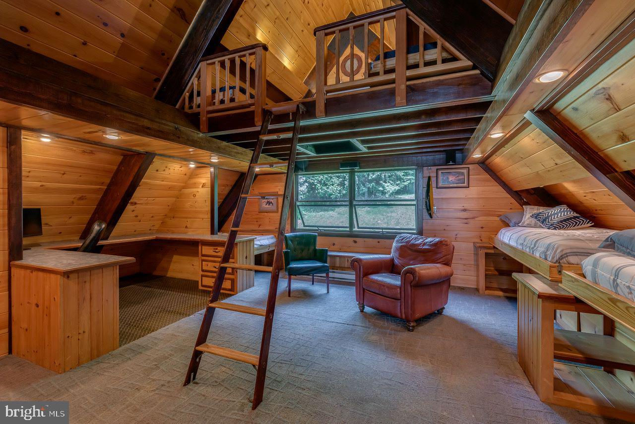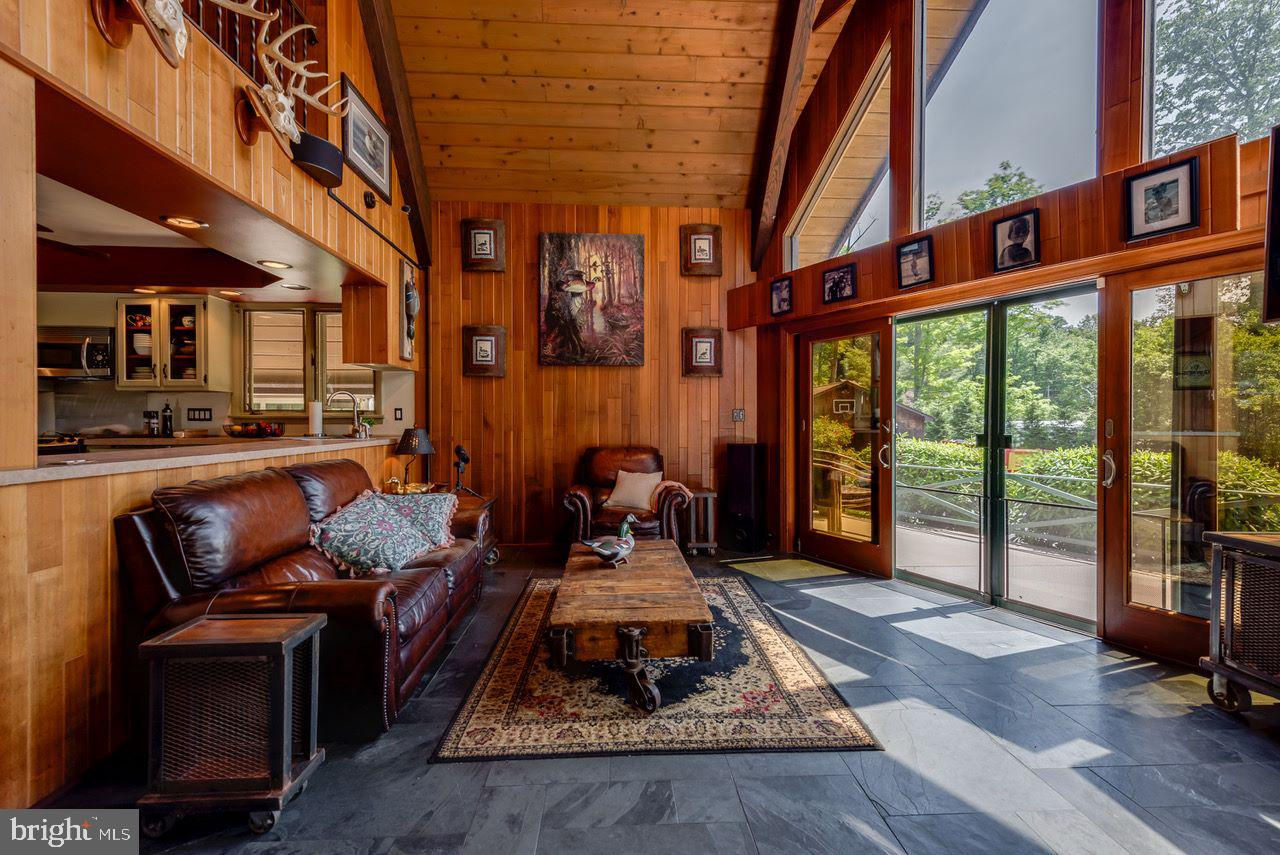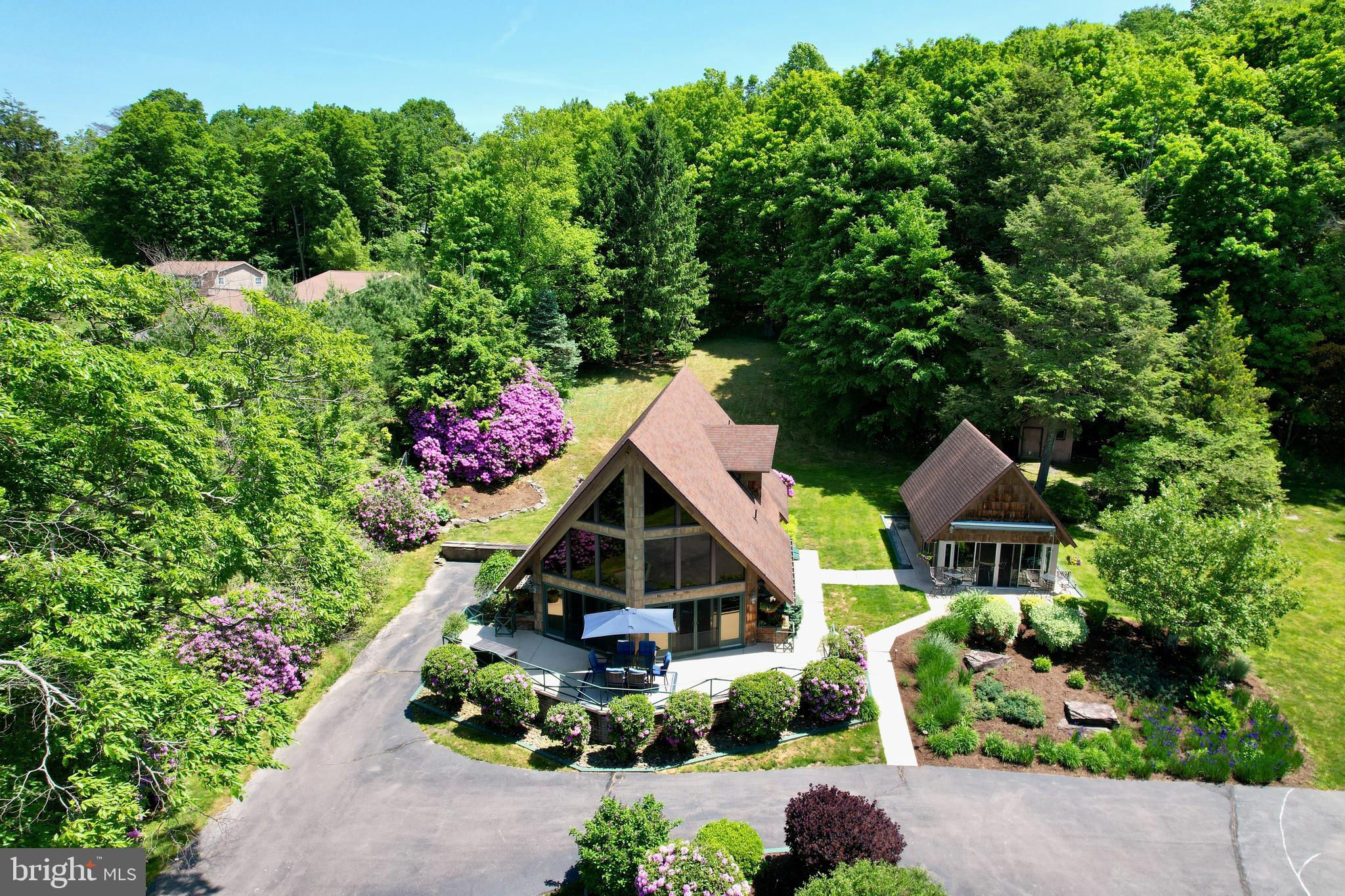 This A-frame house is a stunning retreat nestled on 2 flat acres with 128' of lake front on Alderson Cove, the perfect location on Harvey's Lake. Lush, manicured lawns, picturesque views, and a cozy, rustic atmosphere provides a year-round retreat. The house features custom walnut interior, 3 bedrooms, a 5-bunk dorm loft, 4 bathrooms, detached 2-car garage, and a private entertainment lodge with sliding glass doors and a fully equipped kitchen. The boathouse and new dock sit on the quiet end of the lake where a natural shoal keeps boat traffic to a minimum ensuring a tranquil and private waterfront experience. Whether you're boating, fishing, or simply soaking in the stunning lake views, this A-frame house offers a perfect blend of relaxation and rustic charm. ***AGENTS PLEASE SEE PRIVATE REMARKS.