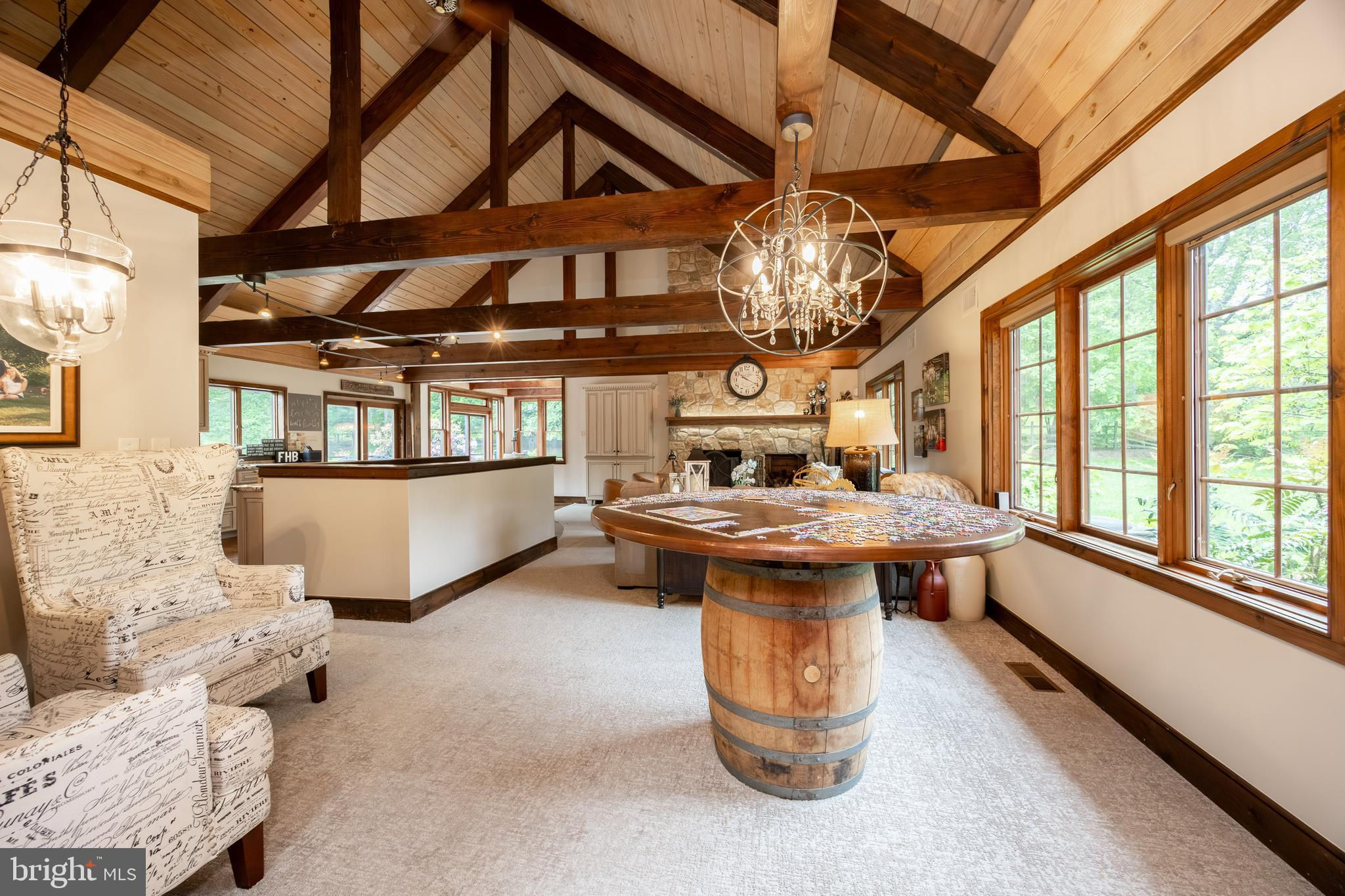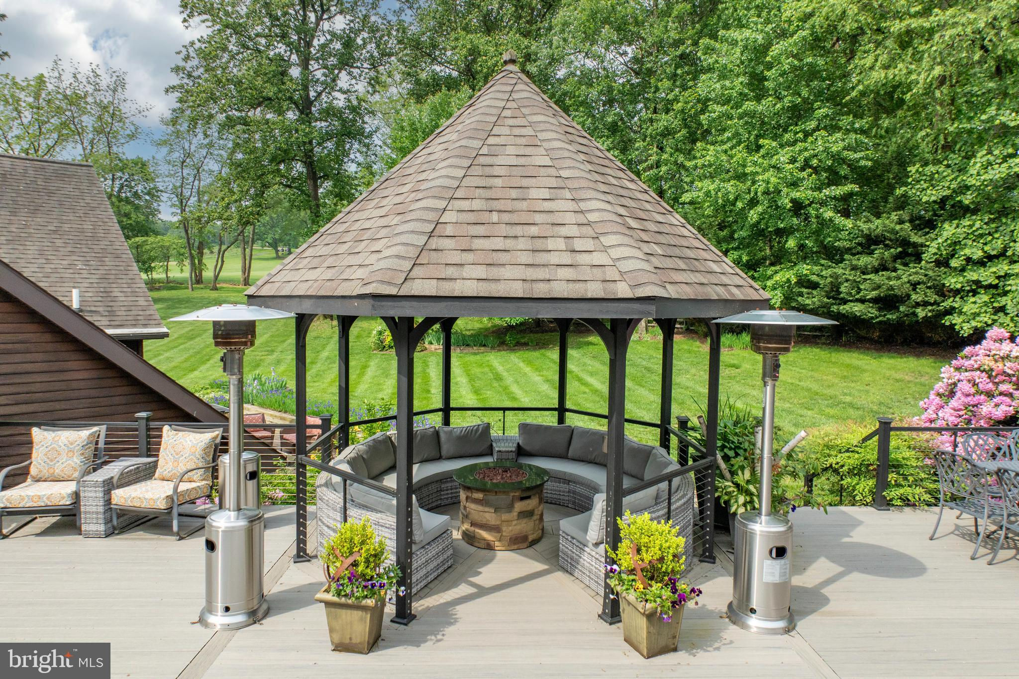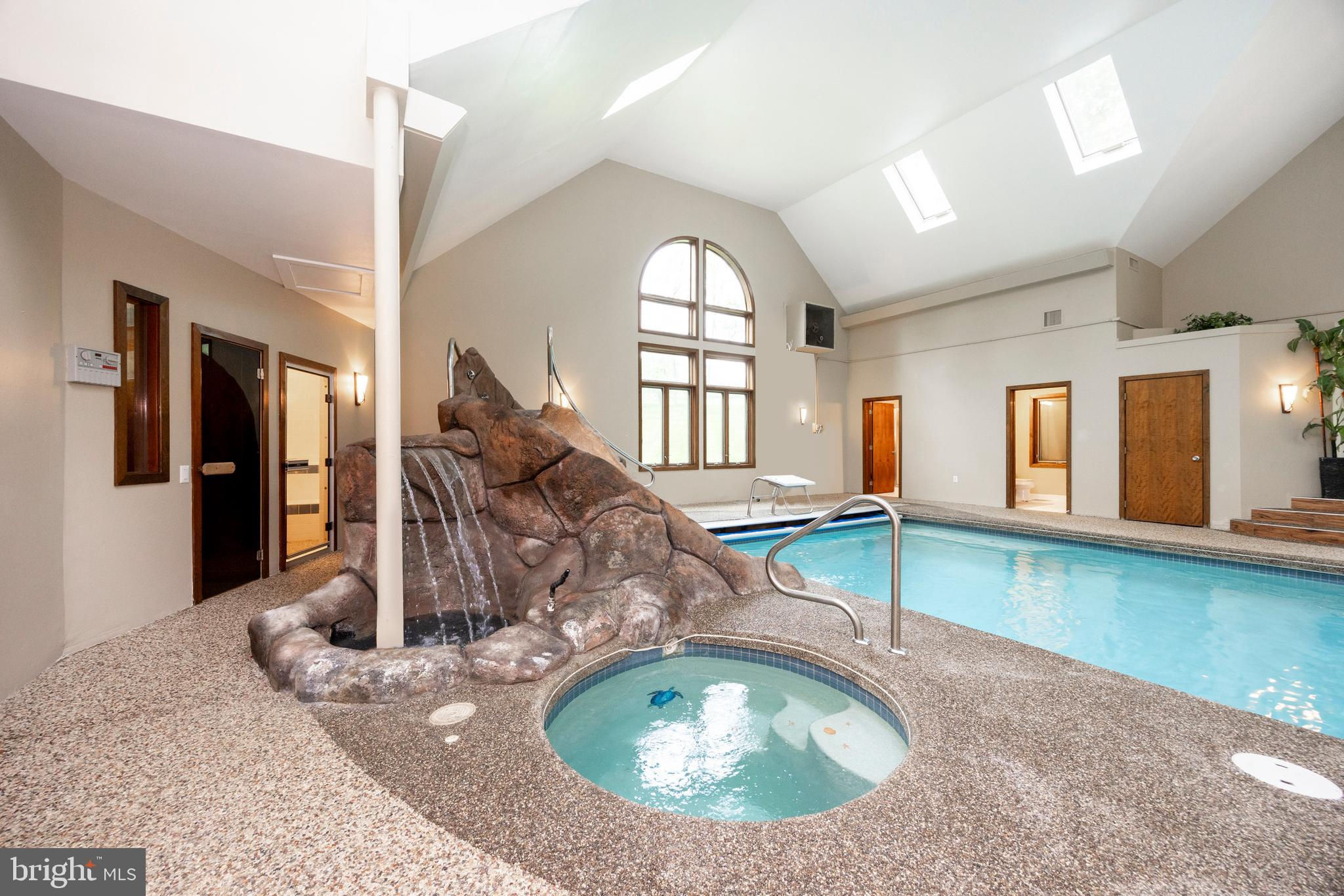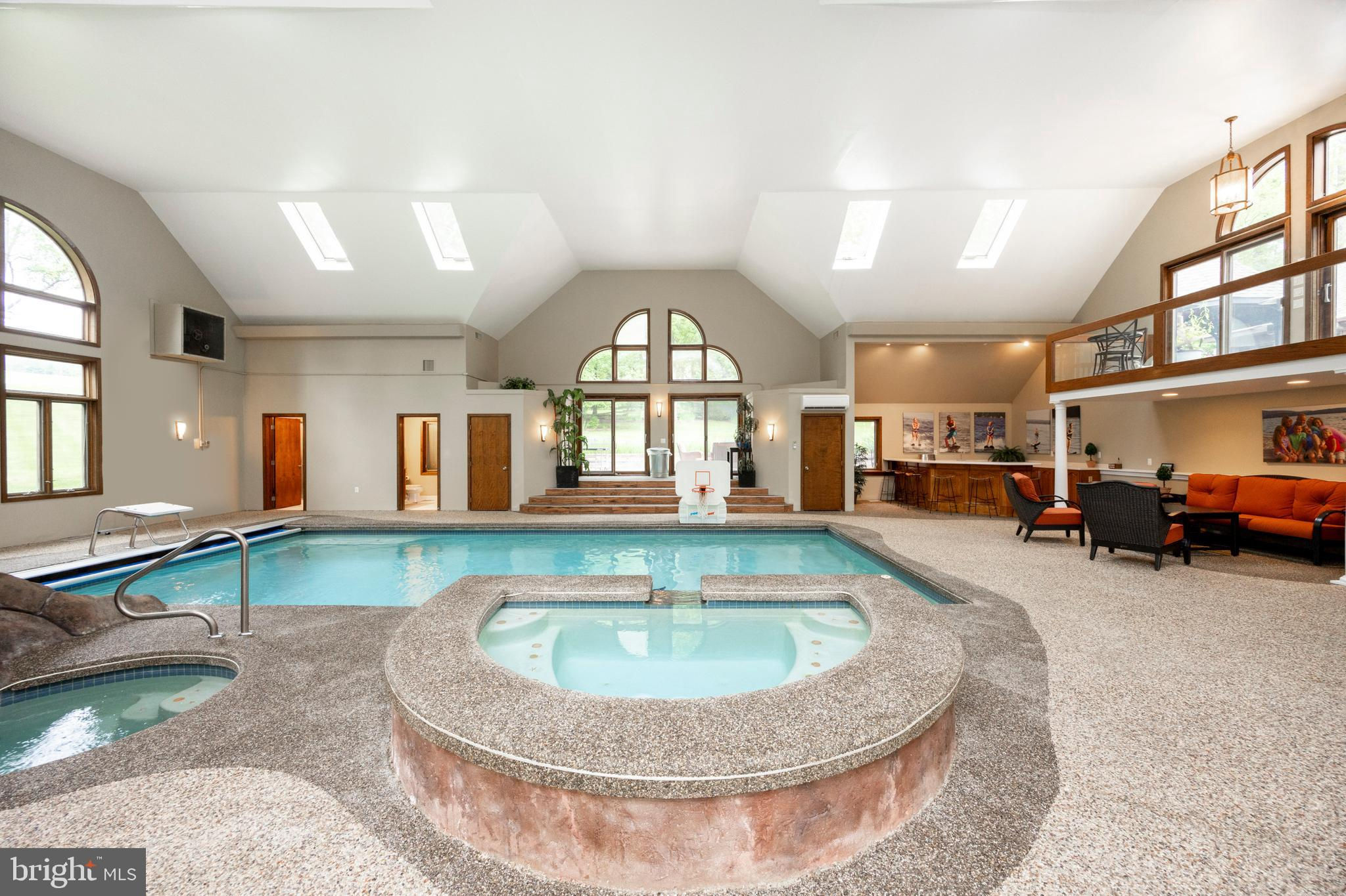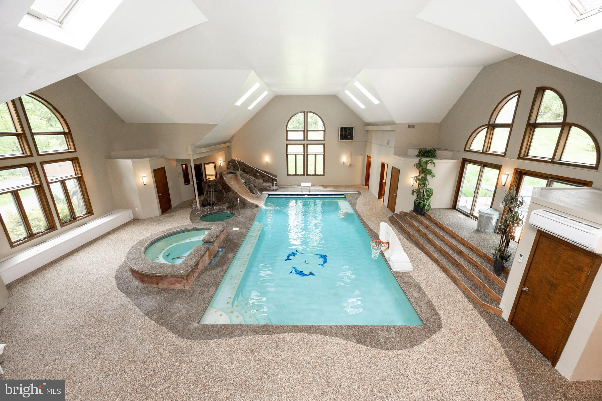 Ever dreamed of living at a private resort where you make the rules? Good news: it's for sale. Set on 3 beautifully landscaped acres with a front-row seat to Phoenixville Country Club’s rolling greens, this one-of-a-kind estate brings vacation vibes home every single day. At the heart of it all is the jaw-dropping two-story Wellness Pavilion featuring a heated saltwater indoor pool (complete with diving block and stone slide), hot tub, cold plunge, steam room, sauna, wet bar, and two full baths. Sunlight pours in from skylights and massive windows, while glass doors open to a sun-drenched patio built for pool parties and peaceful lounging alike. The rest of the property carries the same wow factor. A massive brand new composite upper deck with a waterfall and gazebo overlooks a yard that’s private, peaceful, and perfectly in sync with the golf course fairway just beyond. A second full residence (yes, an actual second house) is perfect for guests, in-laws, or long-term visitors, with 2 bedrooms, 2 full baths, a dining room, and a bright family room with sliding doors that open to its own private deck. It also includes a full kitchen, laundry, and a 4–5 car garage. The main home is a masterclass in post-and-beam architecture, flooded with natural light and filled with flexible, elegant spaces. Soaring ceilings highlight the central dining room with its trio of chandeliers, while the gourmet kitchen includes both a peninsula and an island, a Viking gas range, two Viking dishwashers, and GE Profile fridge. It connects to a relaxed family room where the stone fireplace sets the tone. Just off the kitchen, the sunlit breakfast room includes a coffee station with mini fridge, sink, and ice maker, making it your new favorite spot to start the day. The primary suite? It’s got private deck access, spa bath with soaking tub and double vanity, and a walk-in closet that finally gives your wardrobe the space it deserves. Downstairs, the walk-out lower level feels more like a private club, with a full wet bar featuring white cabinets, quartz countertops, a dishwasher, two ice makers, two wine refrigerators, a sink, and tiled backsplash—plus a wine cellar, game room, TV room, two offices, full bath, mudroom, and access to an oversized two-car garage. Additional highlights include brand new decks, a newer roof, a new driveway, a water filtration system, and even a charming chicken coop out back. All of this just minutes from Valley Forge National Park. An estate that redefines what home can be.