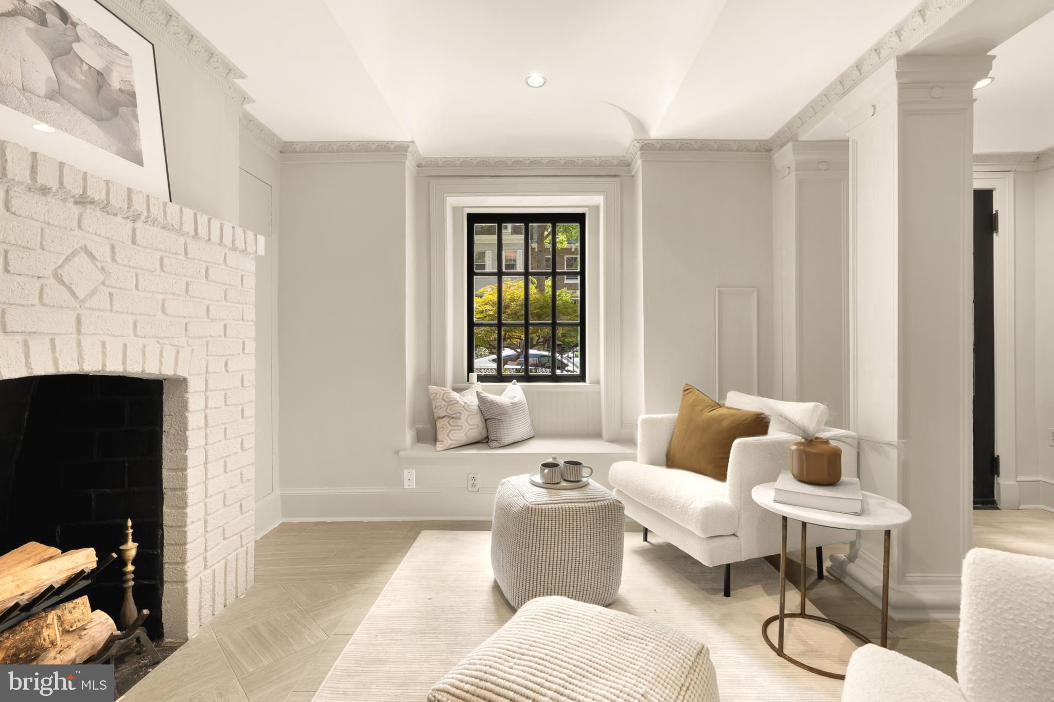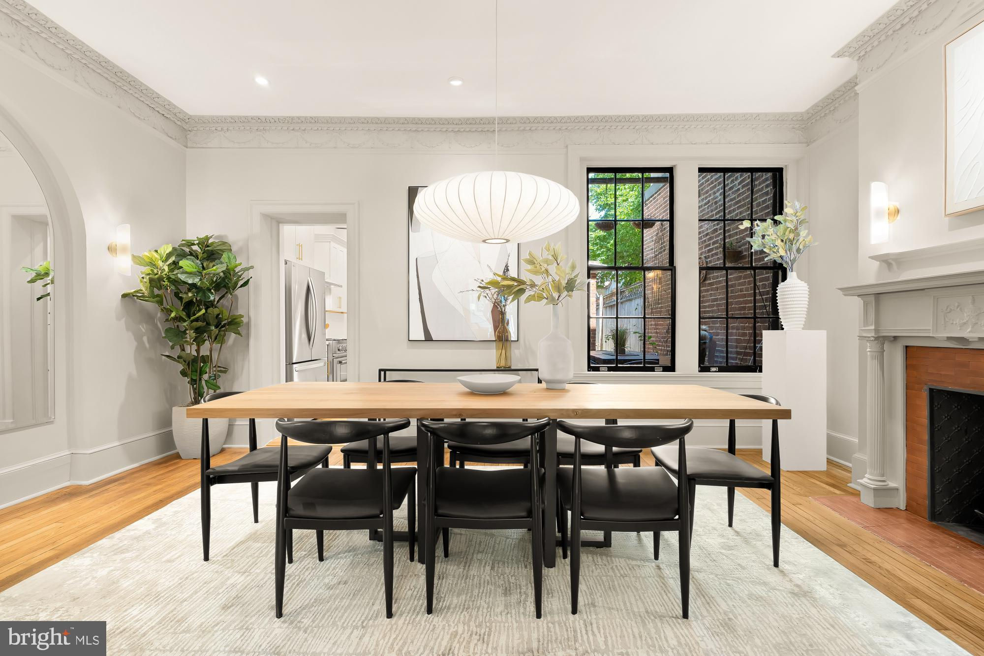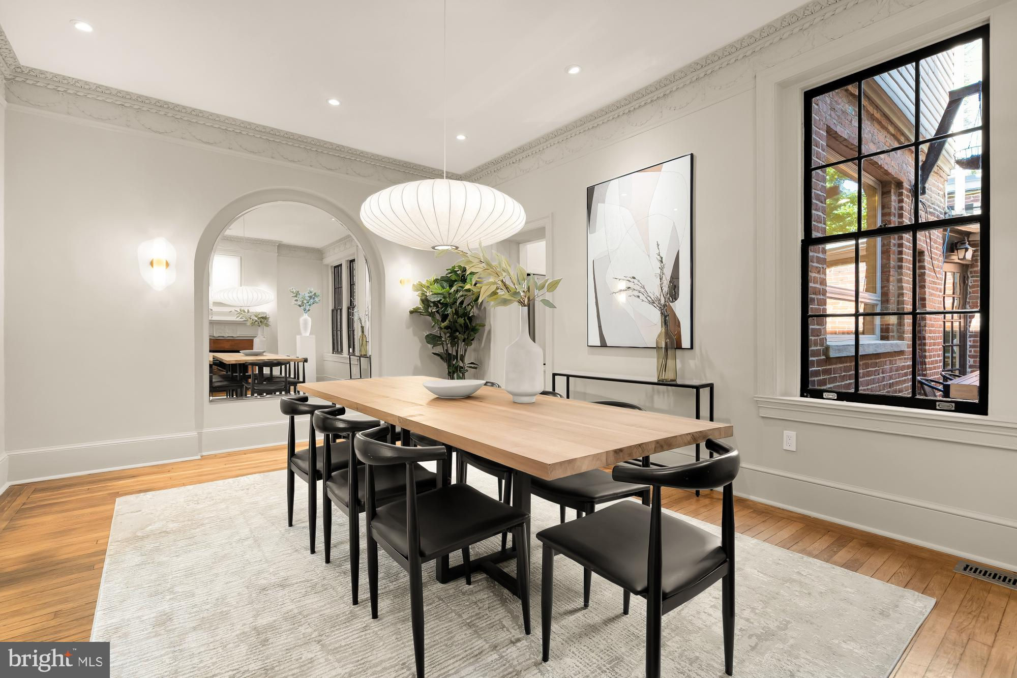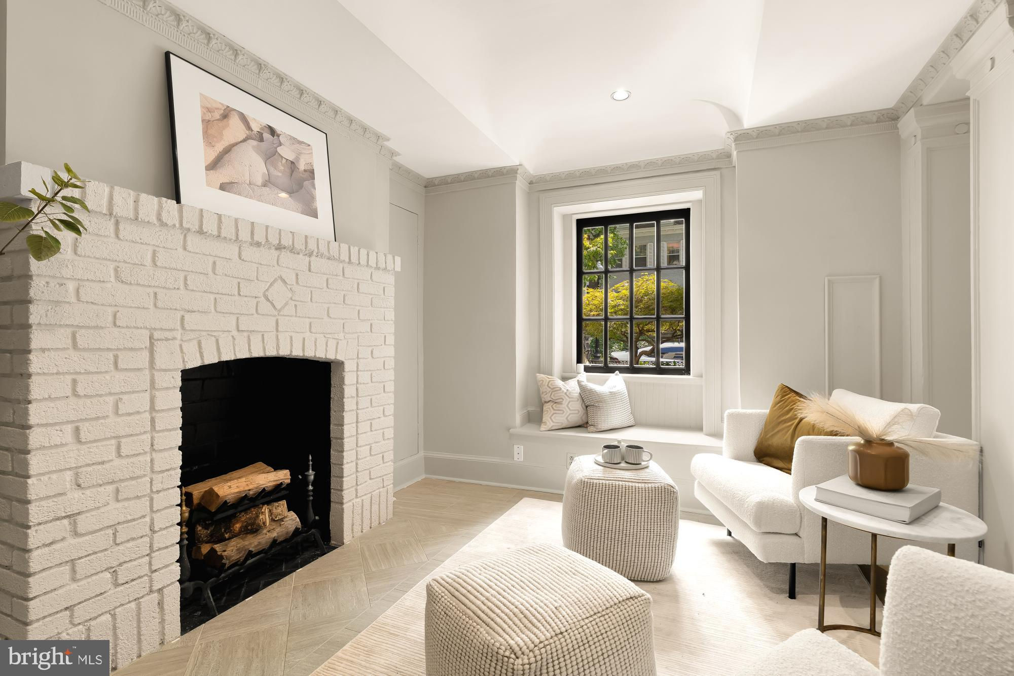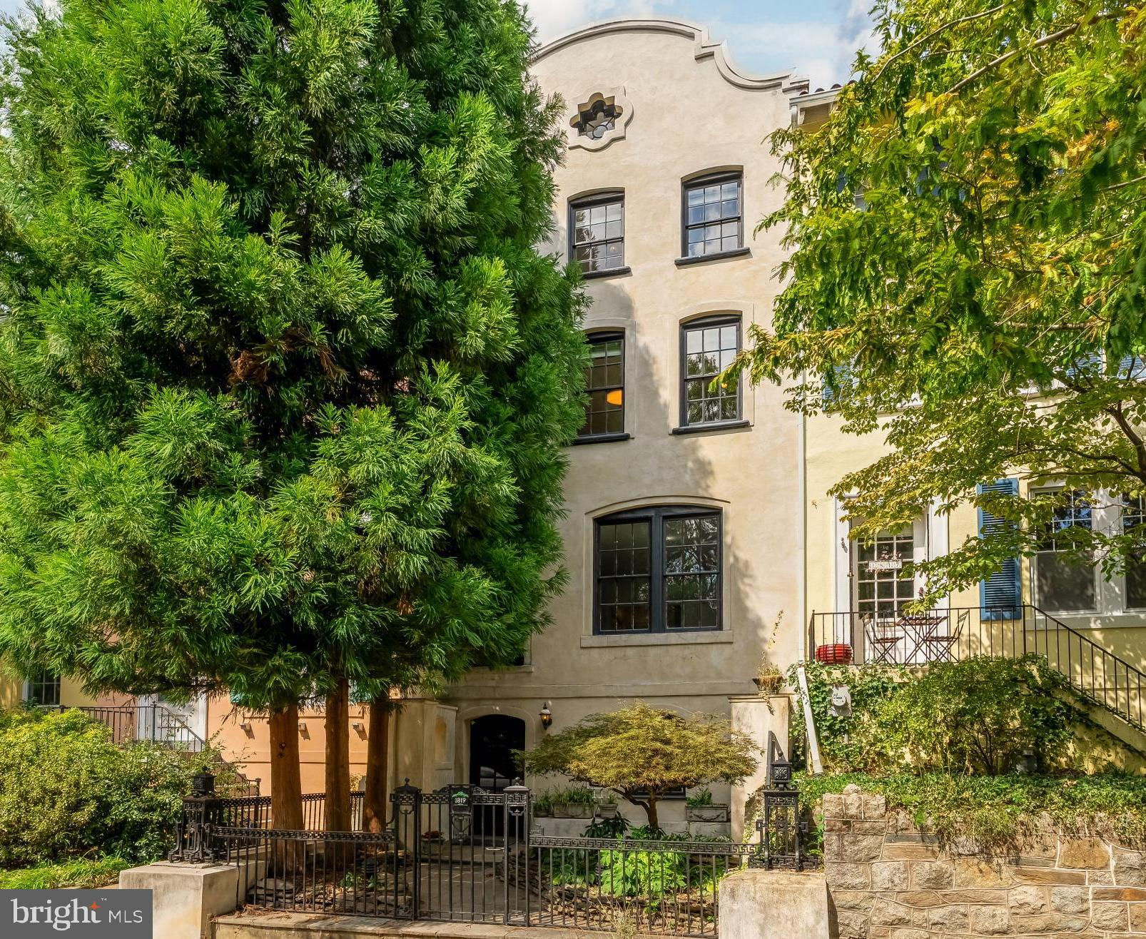 Tucked away in Historic Mount Pleasant, just one block from the National Zoo, 1819 Kenyon Street is an extraordinarily crafted Mediterranean-style rowhome boasting 5 bedrooms, 4 bathrooms, 3 half bathrooms, and a completely separate carriage house all spread over an expansive 4,400 est. sq. ft of living space. Stunning original details such as intricate moldings, large-scale rooms, and gleaming hardwood floors seamlessly combine with elegant updates for today’s homeowner. Multiple skylights, soaring ceiling heights, and oversized windows flood every space with light, adding to the airiness and grandeur of this magnificent home. Enter through the formal foyer to a sunlit seating area or ideal office, marked by stately columns, striking moldings, and a classic brick fireplace. Concealed doors open onto the home’s laundry room, mudroom area, pet wash station, and bonus storage room perfect for a wine cellar. Upstairs, the main level features a grand, light-filled living room with a fireplace and custom built-ins, a stylish dry bar for entertaining, and the formal dining room perfect for large gatherings. The rear of the home is anchored by a fully renovated kitchen boasting a BlueStar 6-burner range, LG French door refrigerator, eat-at peninsula, and a sunny breakfast room reminiscent of a Parisian café with exposed brick, painted wainscoting, and an oversized skylight. The butler’s pantry adds convenience with a second sink and beverage center, while a stunning powder room with stained glass windows completes this level. The upper levels offer a range of flexible spaces, all drenched in light from large windows and a huge over-stair skylight. On the third level, enjoy a generously sized bedroom with walk-in closet, en-suite bath, and cozy fireplace; a sun-filled second bedroom with a beautifully tiled en-suite bathroom and curbless shower; and a versatile office or playroom beneath an impressive two-story ceiling. The top floor showcases an airy primary suite with cathedral ceilings, glass-paneled French doors, and beautiful views of the surrounding greenery. Start and end your day in the luxurious primary bathroom featuring a clawfoot tub, floating double-vanity, and walk-in shower. Adjacent is a light-filled windowed closet or fourth bedroom, outfitted with custom storage. A rare highlight of this property is the fully detached carriage house—an impeccably renovated 1 bedroom, 1.5 bath residence. It offers a spacious living and dining area, a full kitchen, and stacked laundry, all drenched in sunlight from two skylights and a multitude of windows. This flexible space is perfect for long-term guests, multi-generational living, or as a premium rental opportunity. Outdoor living is effortless with a private rear patio connecting the main house and carriage house, providing an ideal setting for relaxation and al fresco dining. Stroll up to Mount Pleasant Street for coffee, yoga, shopping, dining, and more, or get outdoors on the trails of Rock Creek Park or at the National Zoo. Convene with neighbors at “Acorn Park” around the corner and hit up the Saturday Farmer’s Market on Mount Pleasant Street. In bounds for Bancroft Elementary, just a few blocks away, as well as Deal Middle School and Jackson-Reed High School. With its unique architecture, light-filled interiors, and flexible living options, 1819 Kenyon Street is an extraordinary offering in one of DC’s most cherished neighborhoods.