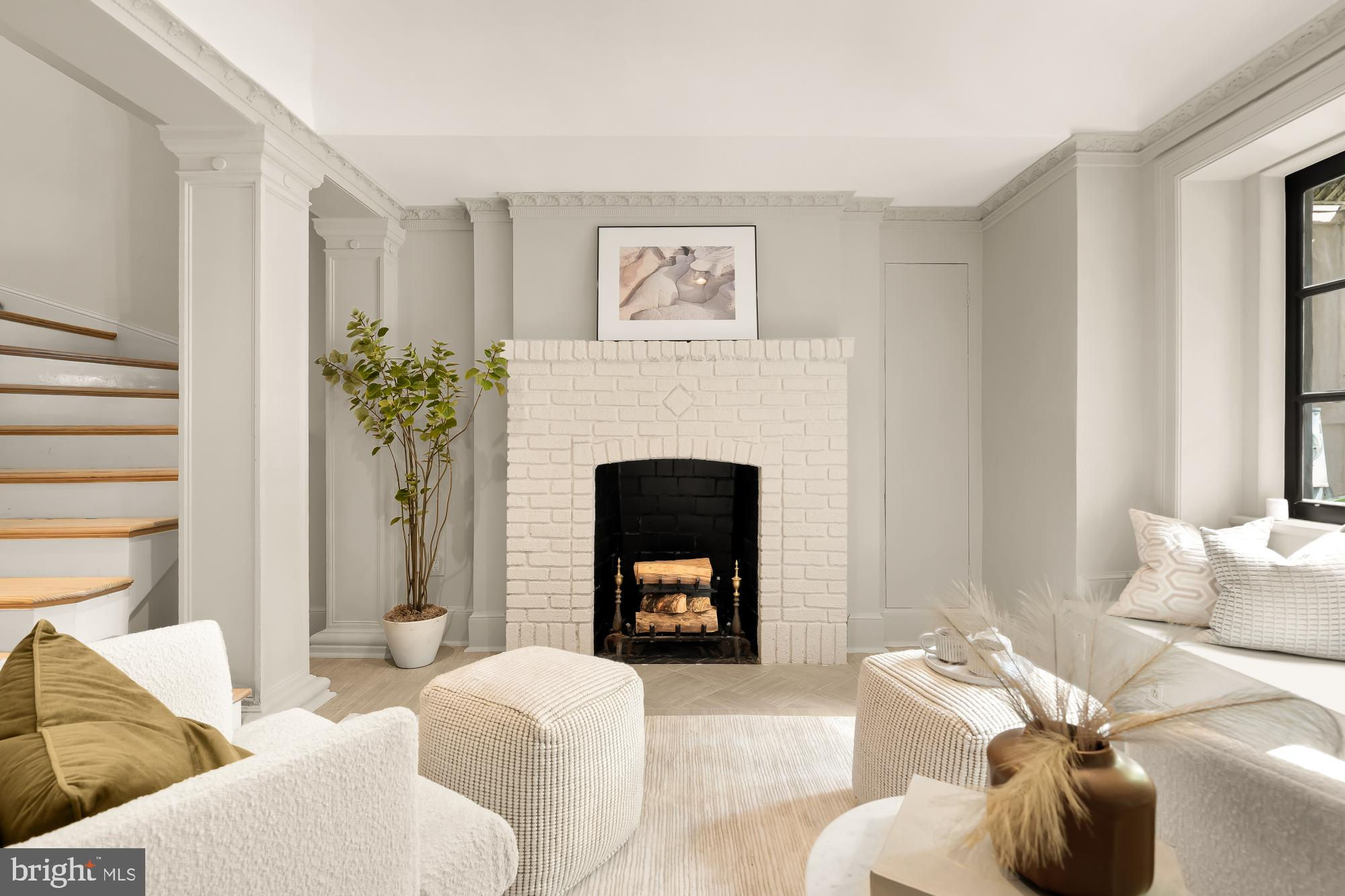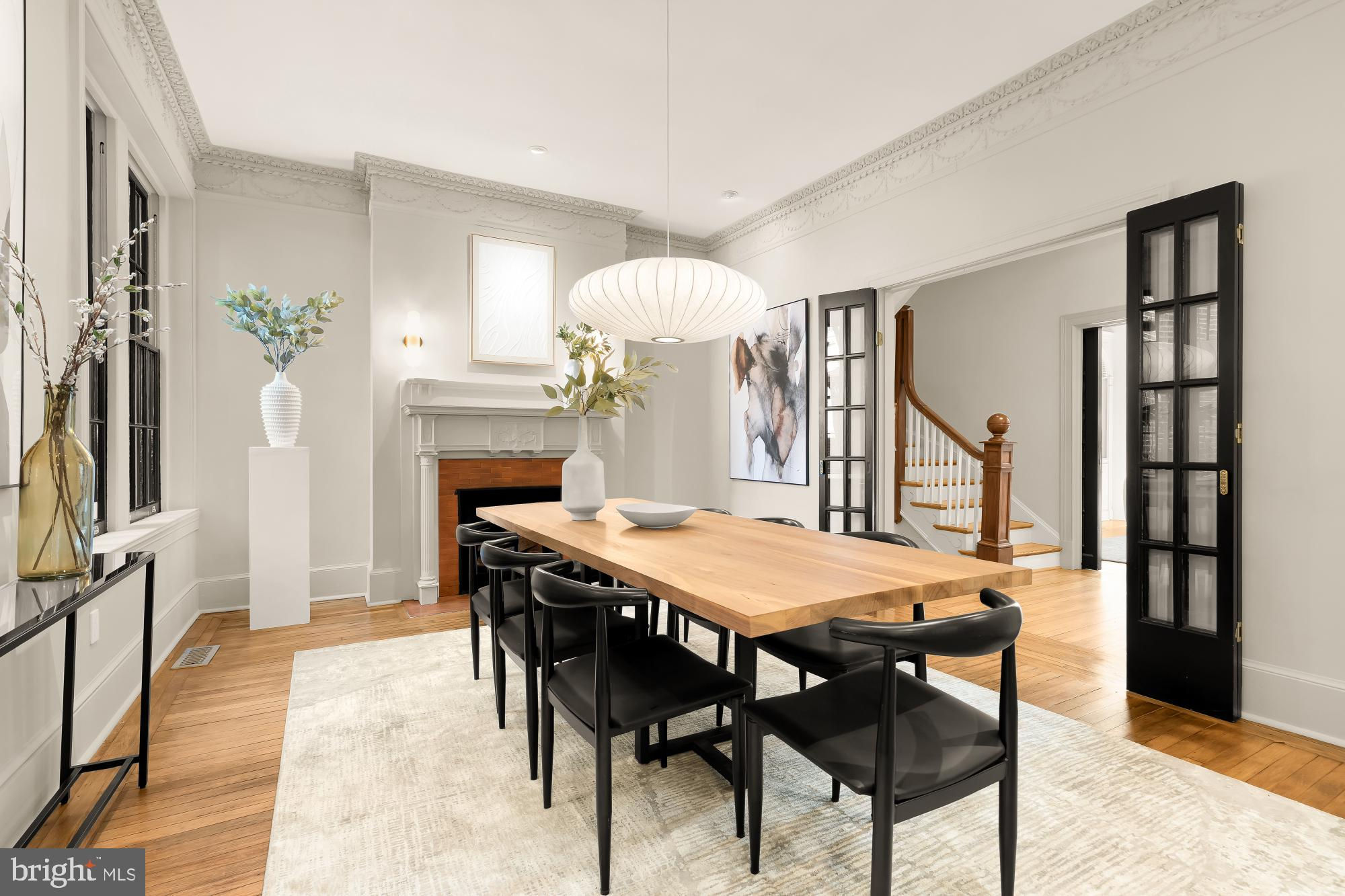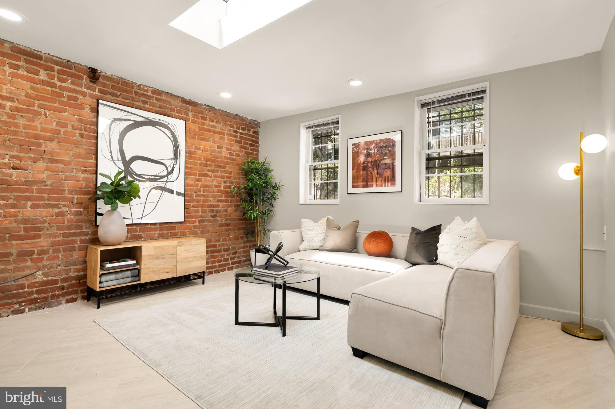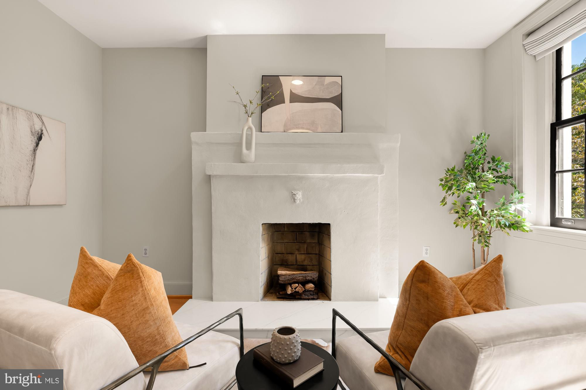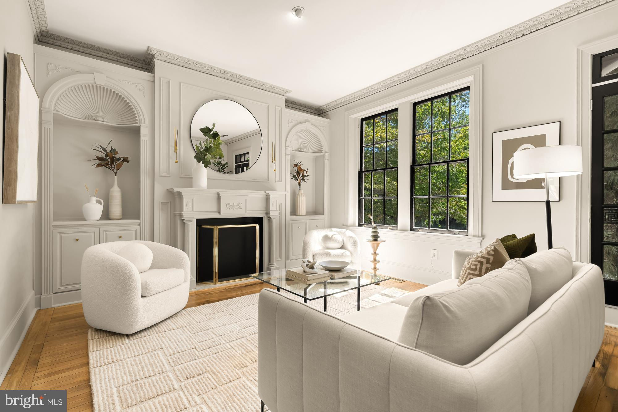 Tucked away in Historic Mount Pleasant, just one block from the National Zoo, 1819 Kenyon Street is an extraordinarily crafted Mediterranean-style rowhome boasting 5 bedrooms, 4 bathrooms, 3 half bathrooms, and a completely separate carriage house all spread over an expansive 4,400 est. sq. ft of living space. Stunning original details such as intricate moldings, large-scale rooms, and gleaming hardwood floors seamlessly combine with elegant updates for today’s homeowner. Multiple skylights, soaring ceiling heights, and oversized windows flood every space with light, adding to the airiness and grandeur of this magnificent home. Enter through the formal foyer to a sunlit seating area or ideal office, marked by stately columns, striking moldings, and a classic brick fireplace. Concealed doors open onto the home’s laundry room, mudroom area, pet wash station, and bonus storage room perfect for a wine cellar. Upstairs, the main level features a grand, light-filled living room with a fireplace and custom built-ins, a stylish dry bar for entertaining, and the formal dining room perfect for large gatherings. The rear of the home is anchored by a fully renovated kitchen boasting a BlueStar 6-burner range, LG French door refrigerator, eat-at peninsula, and a sunny breakfast room reminiscent of a Parisian café with exposed brick, painted wainscoting, and an oversized skylight. The butler’s pantry adds convenience with a second sink and beverage center, while a stunning powder room with stained glass windows completes this level. The upper levels offer a range of flexible spaces, all drenched in light from large windows and a huge over-stair skylight. On the third level, enjoy a generously sized bedroom with walk-in closet, en-suite bath, and cozy fireplace; a sun-filled second bedroom with a beautifully tiled en-suite bathroom and curbless shower; and a versatile office or playroom beneath an impressive two-story ceiling. The top floor showcases an airy primary suite with cathedral ceilings, glass-paneled French doors, and beautiful views of the surrounding greenery. Start and end your day in the luxurious primary bathroom featuring a clawfoot tub, floating double-vanity, and walk-in shower. Adjacent is a light-filled windowed closet or fourth bedroom, outfitted with custom storage. A rare highlight of this property is the fully detached carriage house—an impeccably renovated 1 bedroom, 1.5 bath residence. It offers a spacious living and dining area, a full kitchen, and stacked laundry, all drenched in sunlight from two skylights and a multitude of windows. This flexible space is perfect for long-term guests, multi-generational living, or as a premium rental opportunity. Outdoor living is effortless with a private rear patio connecting the main house and carriage house, providing an ideal setting for relaxation and al fresco dining. Stroll up to Mount Pleasant Street for coffee, yoga, shopping, dining, and more, or get outdoors on the trails of Rock Creek Park or at the National Zoo. Convene with neighbors at “Acorn Park” around the corner and hit up the Saturday Farmer’s Market on Mount Pleasant Street. In bounds for Bancroft Elementary, just a few blocks away, as well as Deal Middle School and Jackson-Reed High School. With its unique architecture, light-filled interiors, and flexible living options, 1819 Kenyon Street is an extraordinary offering in one of DC’s most cherished neighborhoods.