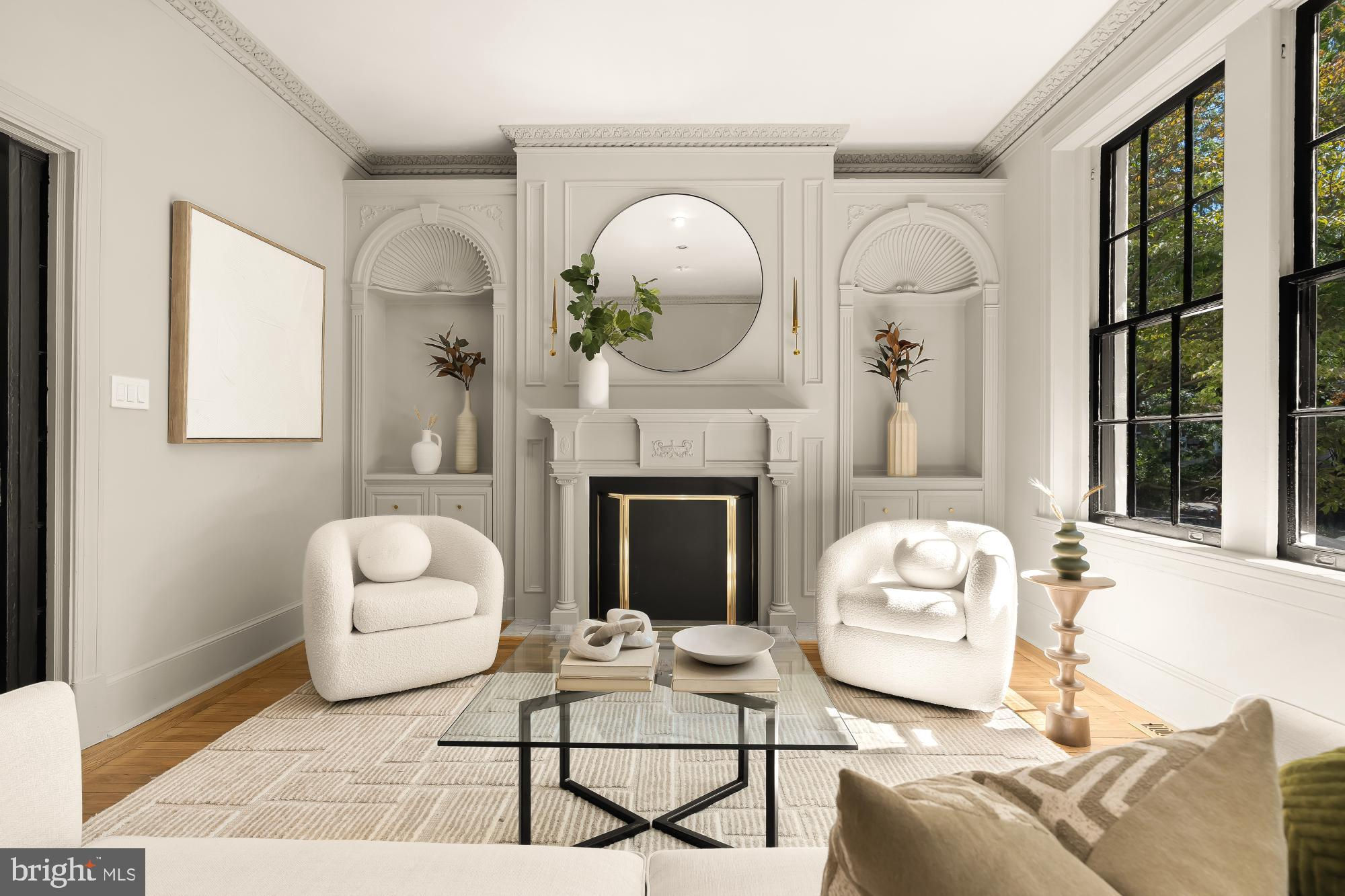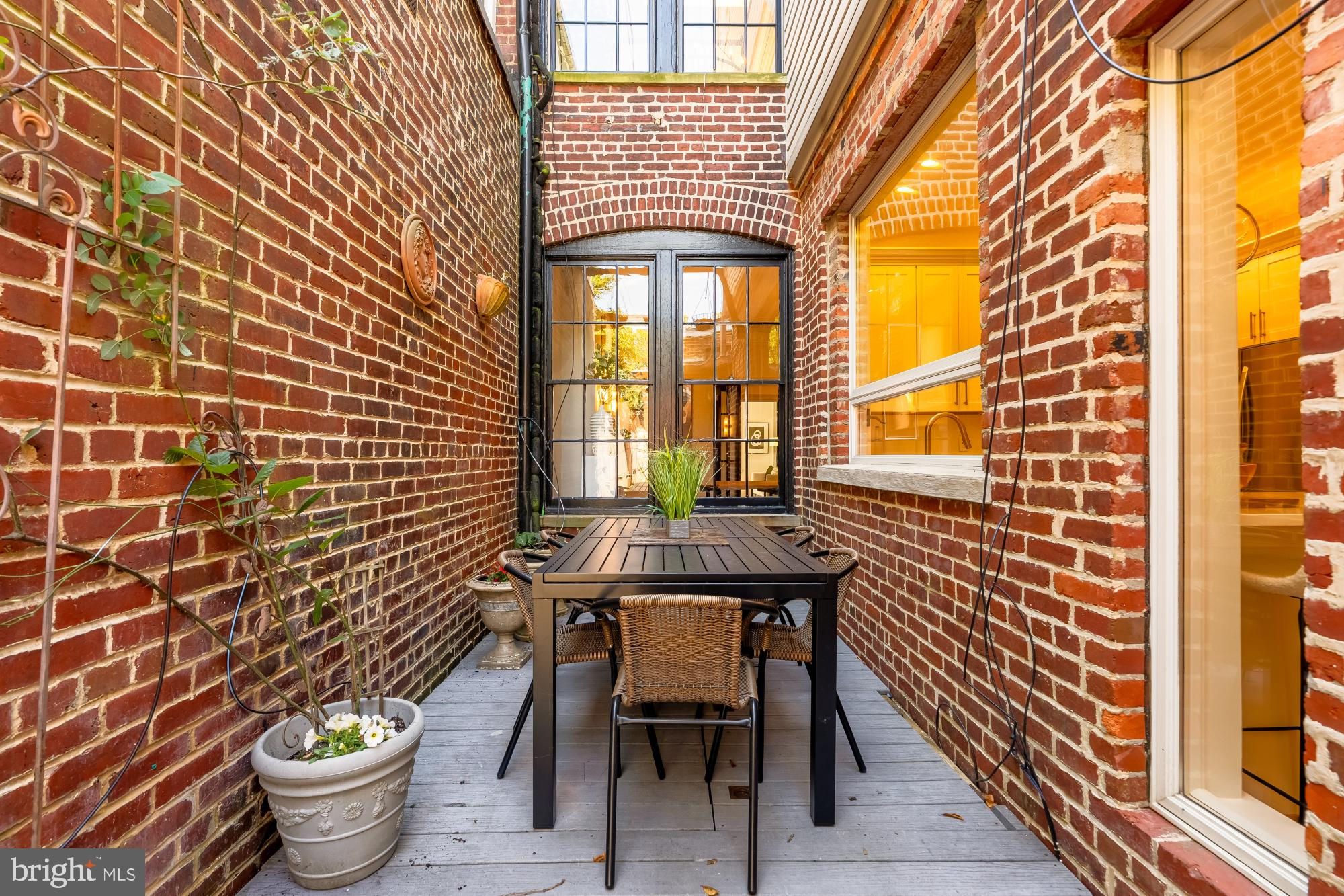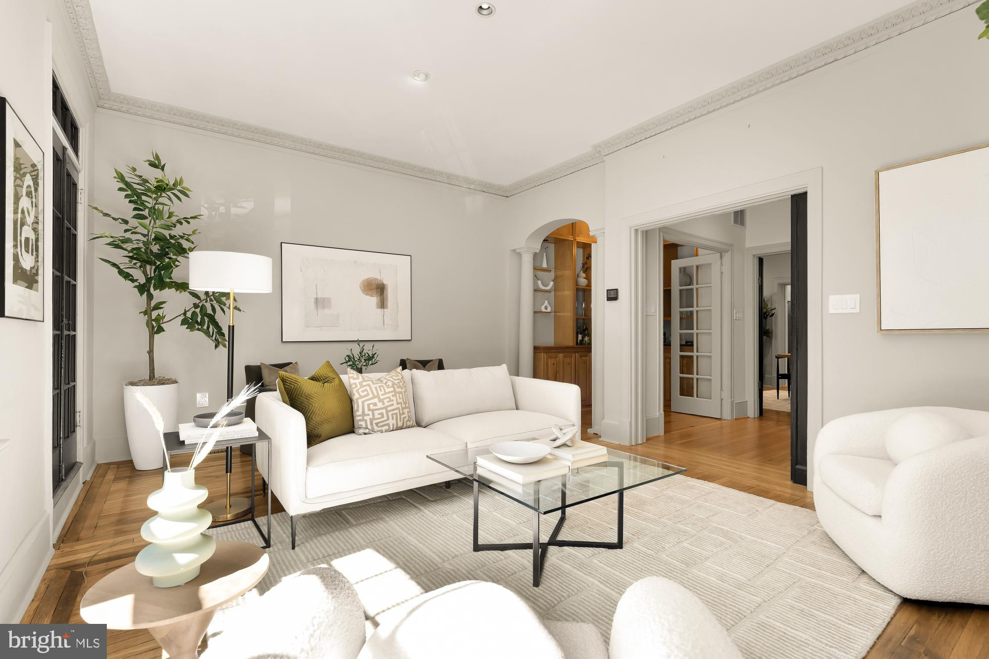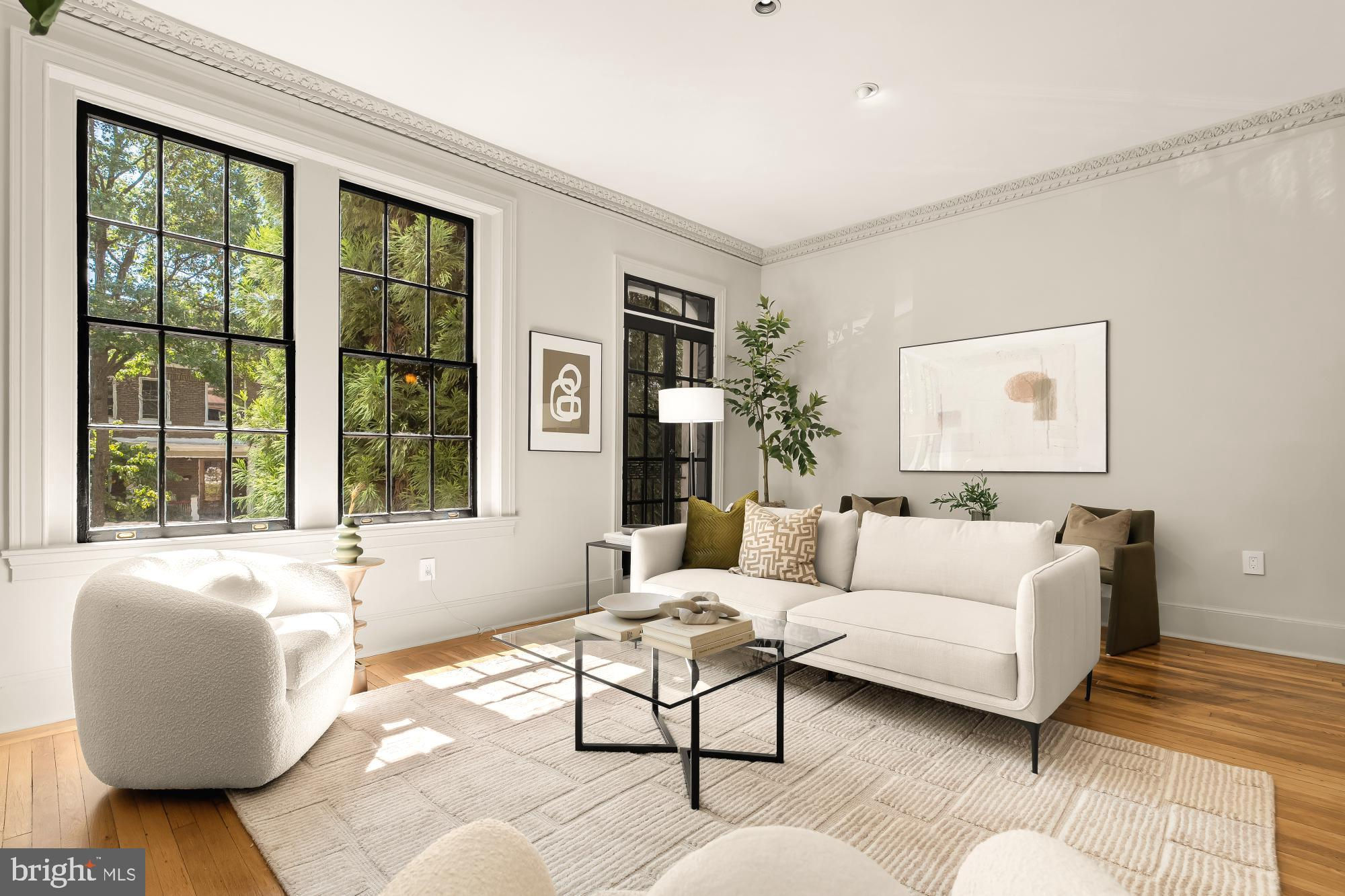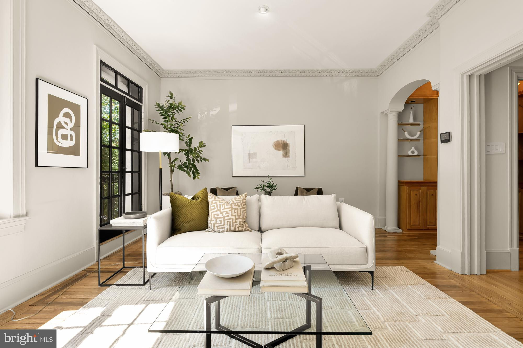 Tucked away in Historic Mount Pleasant, just one block from the National Zoo, 1819 Kenyon Street is an extraordinarily crafted Mediterranean-style rowhome boasting 5 bedrooms, 4 bathrooms, 3 half bathrooms, and a completely separate carriage house all spread over an expansive 4,400 est. sq. ft of living space. Stunning original details such as intricate moldings, large-scale rooms, and gleaming hardwood floors seamlessly combine with elegant updates for today’s homeowner. Multiple skylights, soaring ceiling heights, and oversized windows flood every space with light, adding to the airiness and grandeur of this magnificent home. Enter through the formal foyer to a sunlit seating area or ideal office, marked by stately columns, striking moldings, and a classic brick fireplace. Concealed doors open onto the home’s laundry room, mudroom area, pet wash station, and bonus storage room perfect for a wine cellar. Upstairs, the main level features a grand, light-filled living room with a fireplace and custom built-ins, a stylish dry bar for entertaining, and the formal dining room perfect for large gatherings. The rear of the home is anchored by a fully renovated kitchen boasting a BlueStar 6-burner range, LG French door refrigerator, eat-at peninsula, and a sunny breakfast room reminiscent of a Parisian café with exposed brick, painted wainscoting, and an oversized skylight. The butler’s pantry adds convenience with a second sink and beverage center, while a stunning powder room with stained glass windows completes this level. The upper levels offer a range of flexible spaces, all drenched in light from large windows and a huge over-stair skylight. On the third level, enjoy a generously sized bedroom with walk-in closet, en-suite bath, and cozy fireplace; a sun-filled second bedroom with a beautifully tiled en-suite bathroom and curbless shower; and a versatile office or playroom beneath an impressive two-story ceiling. The top floor showcases an airy primary suite with cathedral ceilings, glass-paneled French doors, and beautiful views of the surrounding greenery. Start and end your day in the luxurious primary bathroom featuring a clawfoot tub, floating double-vanity, and walk-in shower. Adjacent is a light-filled windowed closet or fourth bedroom, outfitted with custom storage. A rare highlight of this property is the fully detached carriage house—an impeccably renovated 1 bedroom, 1.5 bath residence. It offers a spacious living and dining area, a full kitchen, and stacked laundry, all drenched in sunlight from two skylights and a multitude of windows. This flexible space is perfect for long-term guests, multi-generational living, or as a premium rental opportunity. Outdoor living is effortless with a private rear patio connecting the main house and carriage house, providing an ideal setting for relaxation and al fresco dining. Stroll up to Mount Pleasant Street for coffee, yoga, shopping, dining, and more, or get outdoors on the trails of Rock Creek Park or at the National Zoo. Convene with neighbors at “Acorn Park” around the corner and hit up the Saturday Farmer’s Market on Mount Pleasant Street. In bounds for Bancroft Elementary, just a few blocks away, as well as Deal Middle School and Jackson-Reed High School. With its unique architecture, light-filled interiors, and flexible living options, 1819 Kenyon Street is an extraordinary offering in one of DC’s most cherished neighborhoods.
