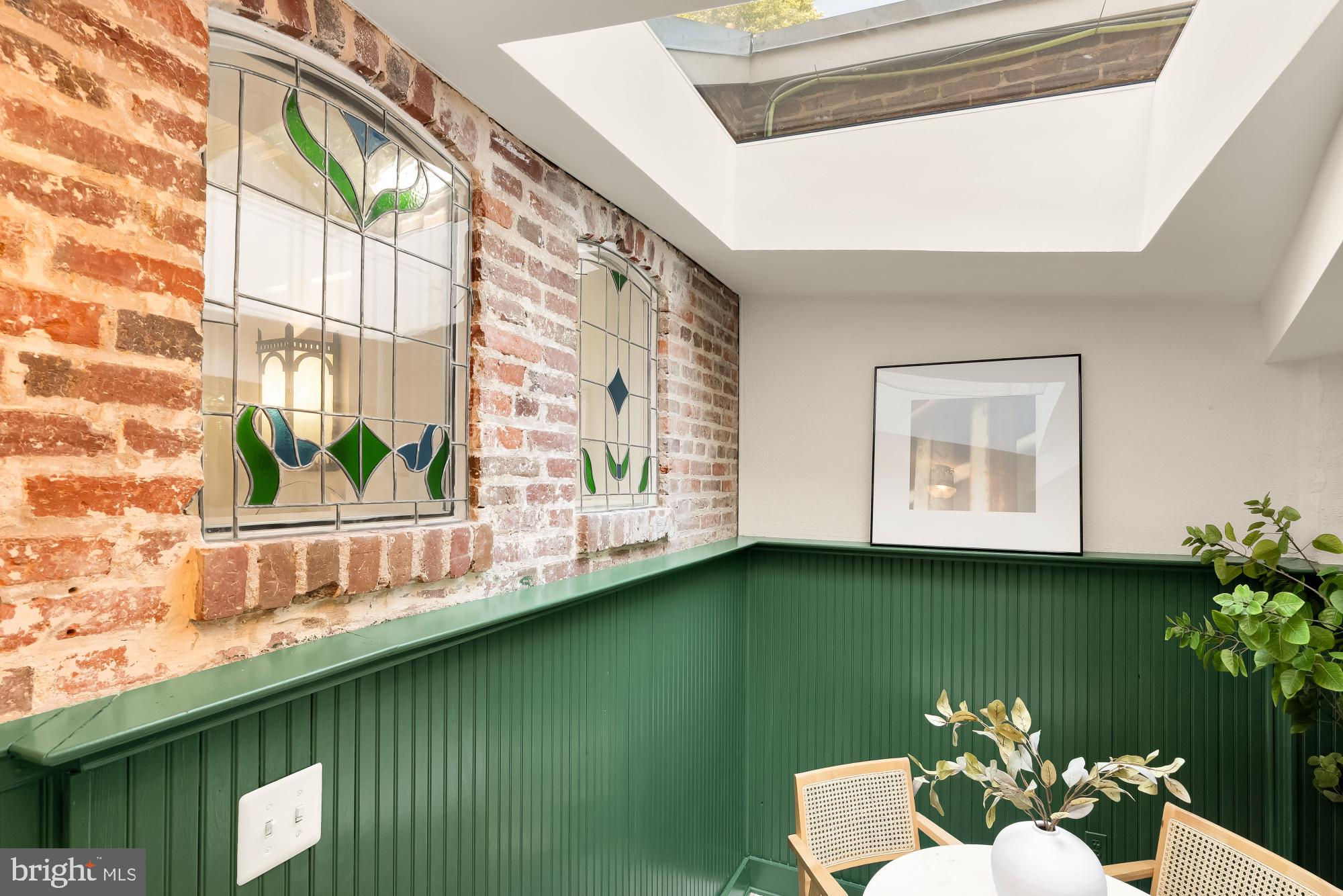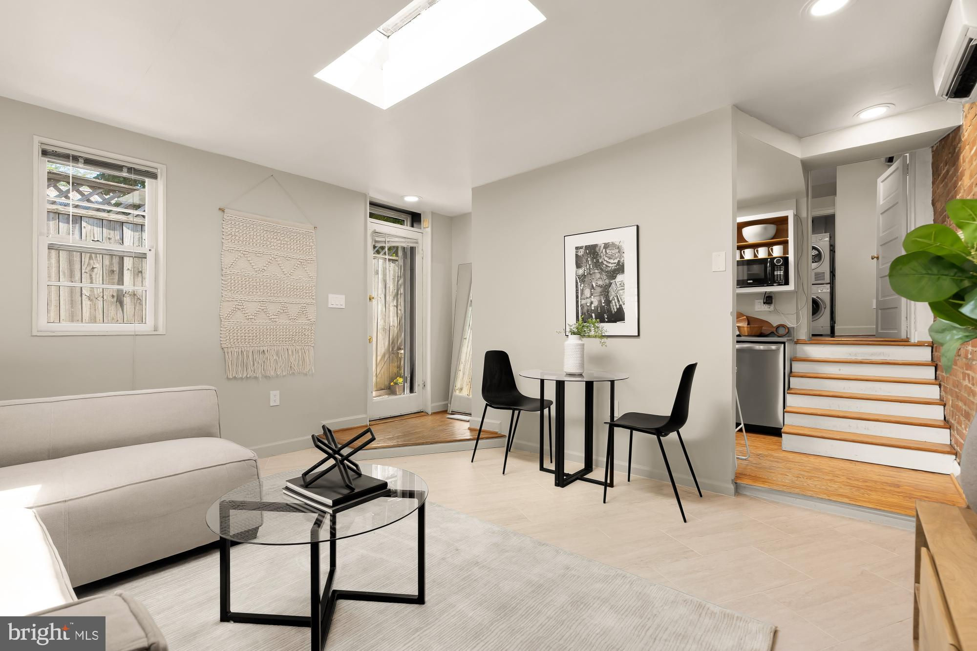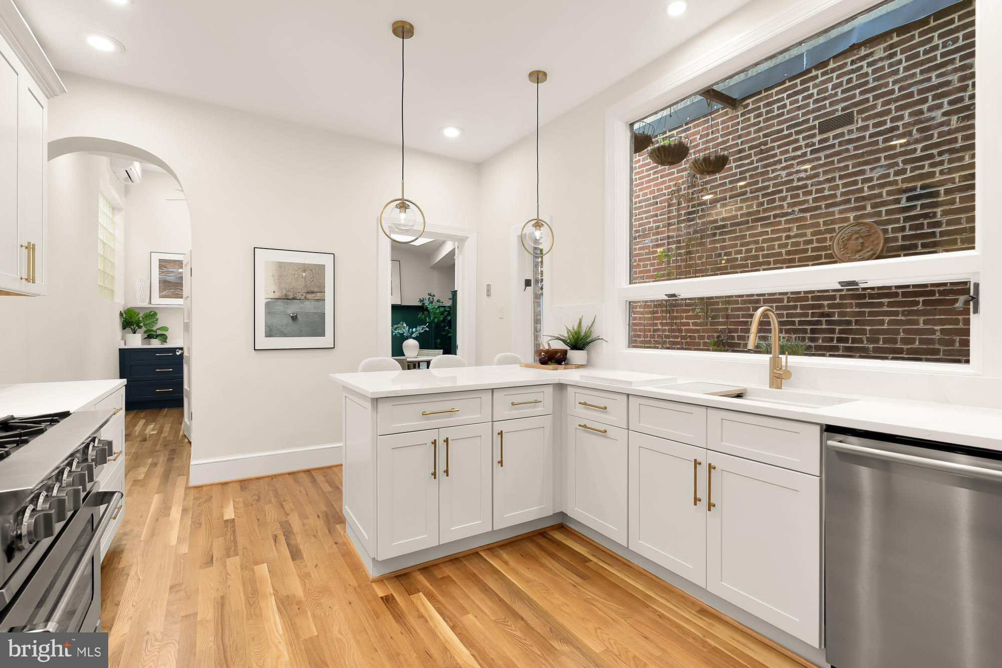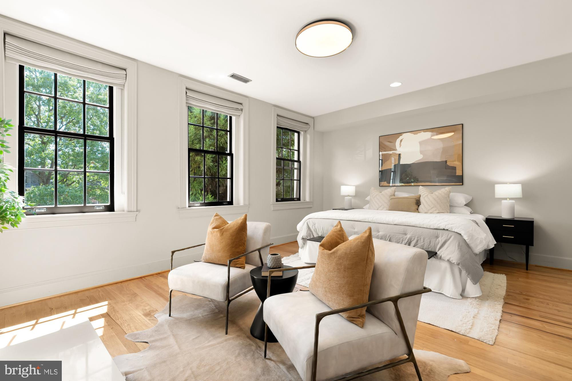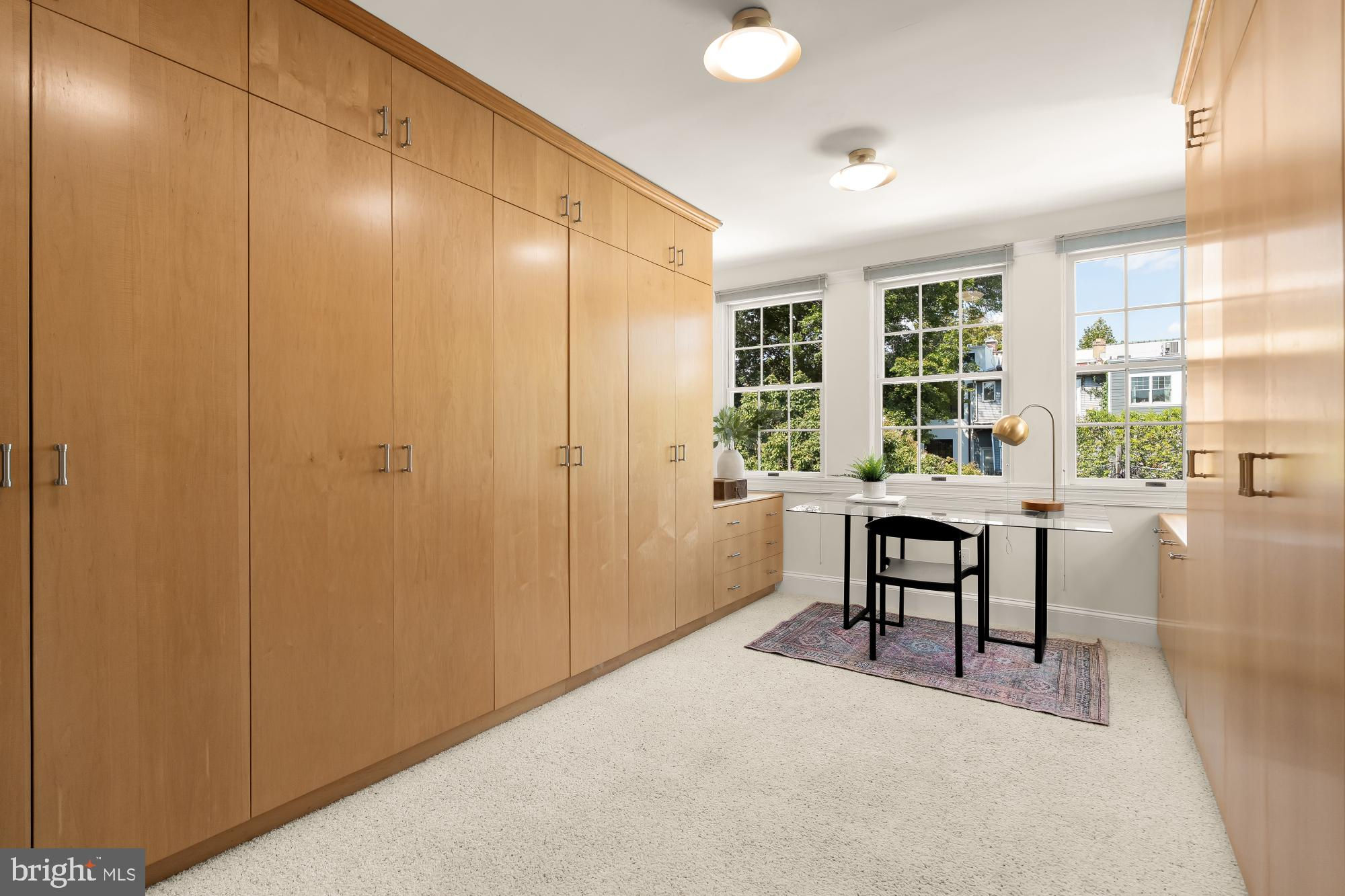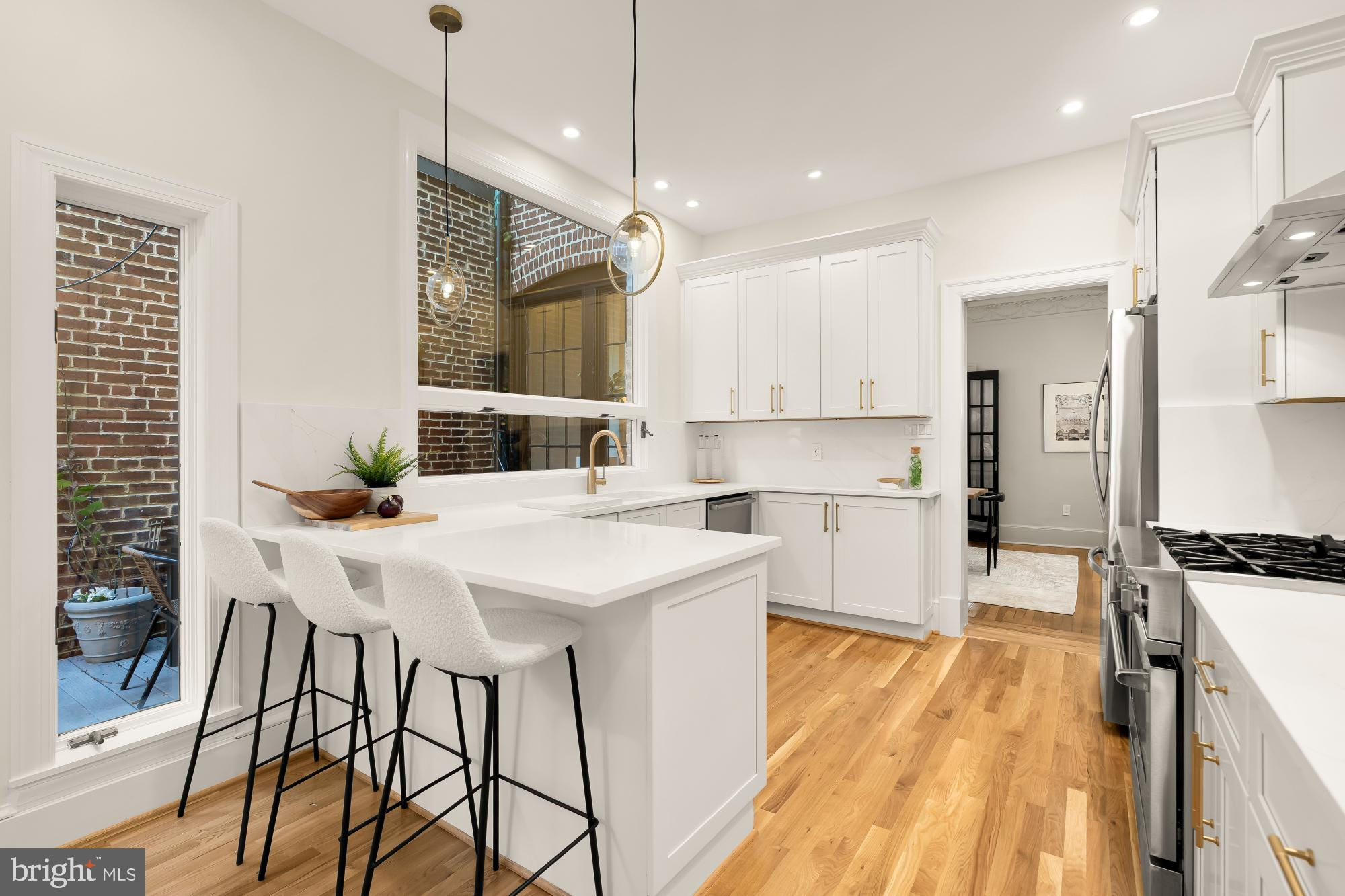 Tucked away in Historic Mount Pleasant, just one block from the National Zoo, 1819 Kenyon Street is an extraordinarily crafted Mediterranean-style rowhome boasting 5 bedrooms, 4 bathrooms, 3 half bathrooms, and a completely separate carriage house all spread over an expansive 4,400 est. sq. ft of living space. Stunning original details such as intricate moldings, large-scale rooms, and gleaming hardwood floors seamlessly combine with elegant updates for today’s homeowner. Multiple skylights, soaring ceiling heights, and oversized windows flood every space with light, adding to the airiness and grandeur of this magnificent home. Enter through the formal foyer to a sunlit seating area or ideal office, marked by stately columns, striking moldings, and a classic brick fireplace. Concealed doors open onto the home’s laundry room, mudroom area, pet wash station, and bonus storage room perfect for a wine cellar. Upstairs, the main level features a grand, light-filled living room with a fireplace and custom built-ins, a stylish dry bar for entertaining, and the formal dining room perfect for large gatherings. The rear of the home is anchored by a fully renovated kitchen boasting a BlueStar 6-burner range, LG French door refrigerator, eat-at peninsula, and a sunny breakfast room reminiscent of a Parisian café with exposed brick, painted wainscoting, and an oversized skylight. The butler’s pantry adds convenience with a second sink and beverage center, while a stunning powder room with stained glass windows completes this level. The upper levels offer a range of flexible spaces, all drenched in light from large windows and a huge over-stair skylight. On the third level, enjoy a generously sized bedroom with walk-in closet, en-suite bath, and cozy fireplace; a sun-filled second bedroom with a beautifully tiled en-suite bathroom and curbless shower; and a versatile office or playroom beneath an impressive two-story ceiling. The top floor showcases an airy primary suite with cathedral ceilings, glass-paneled French doors, and beautiful views of the surrounding greenery. Start and end your day in the luxurious primary bathroom featuring a clawfoot tub, floating double-vanity, and walk-in shower. Adjacent is a light-filled windowed closet or fourth bedroom, outfitted with custom storage. A rare highlight of this property is the fully detached carriage house—an impeccably renovated 1 bedroom, 1.5 bath residence. It offers a spacious living and dining area, a full kitchen, and stacked laundry, all drenched in sunlight from two skylights and a multitude of windows. This flexible space is perfect for long-term guests, multi-generational living, or as a premium rental opportunity. Outdoor living is effortless with a private rear patio connecting the main house and carriage house, providing an ideal setting for relaxation and al fresco dining. Stroll up to Mount Pleasant Street for coffee, yoga, shopping, dining, and more, or get outdoors on the trails of Rock Creek Park or at the National Zoo. Convene with neighbors at “Acorn Park” around the corner and hit up the Saturday Farmer’s Market on Mount Pleasant Street. In bounds for Bancroft Elementary, just a few blocks away, as well as Deal Middle School and Jackson-Reed High School. With its unique architecture, light-filled interiors, and flexible living options, 1819 Kenyon Street is an extraordinary offering in one of DC’s most cherished neighborhoods.