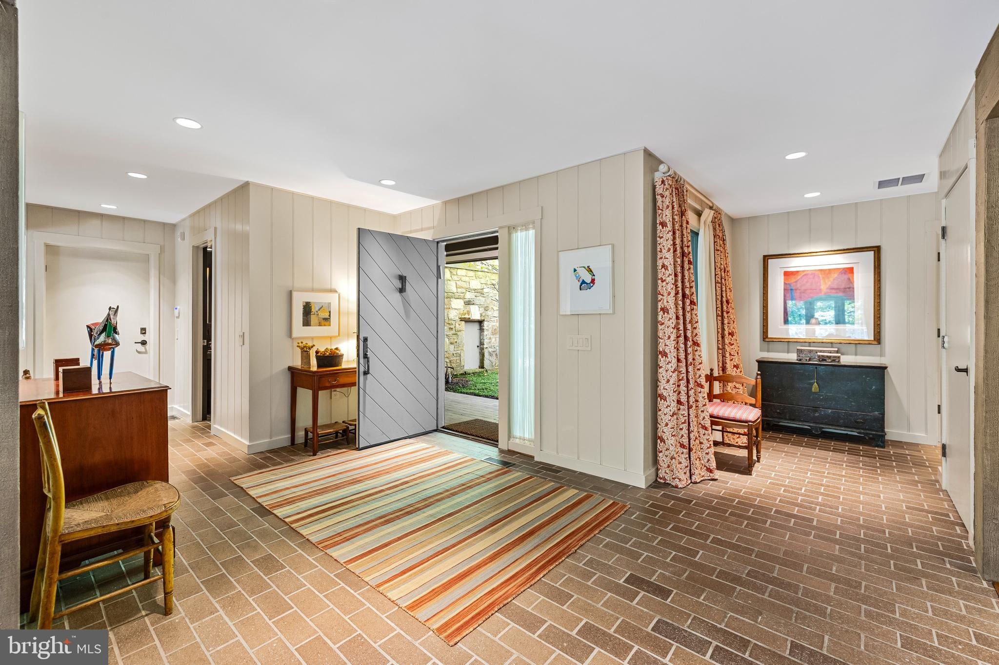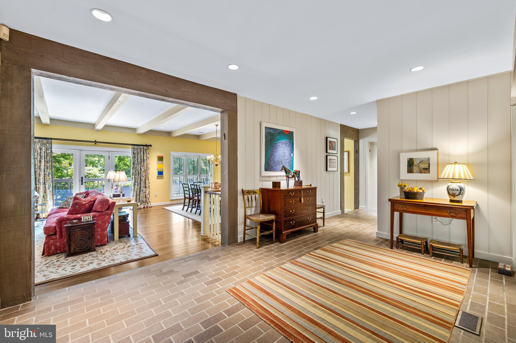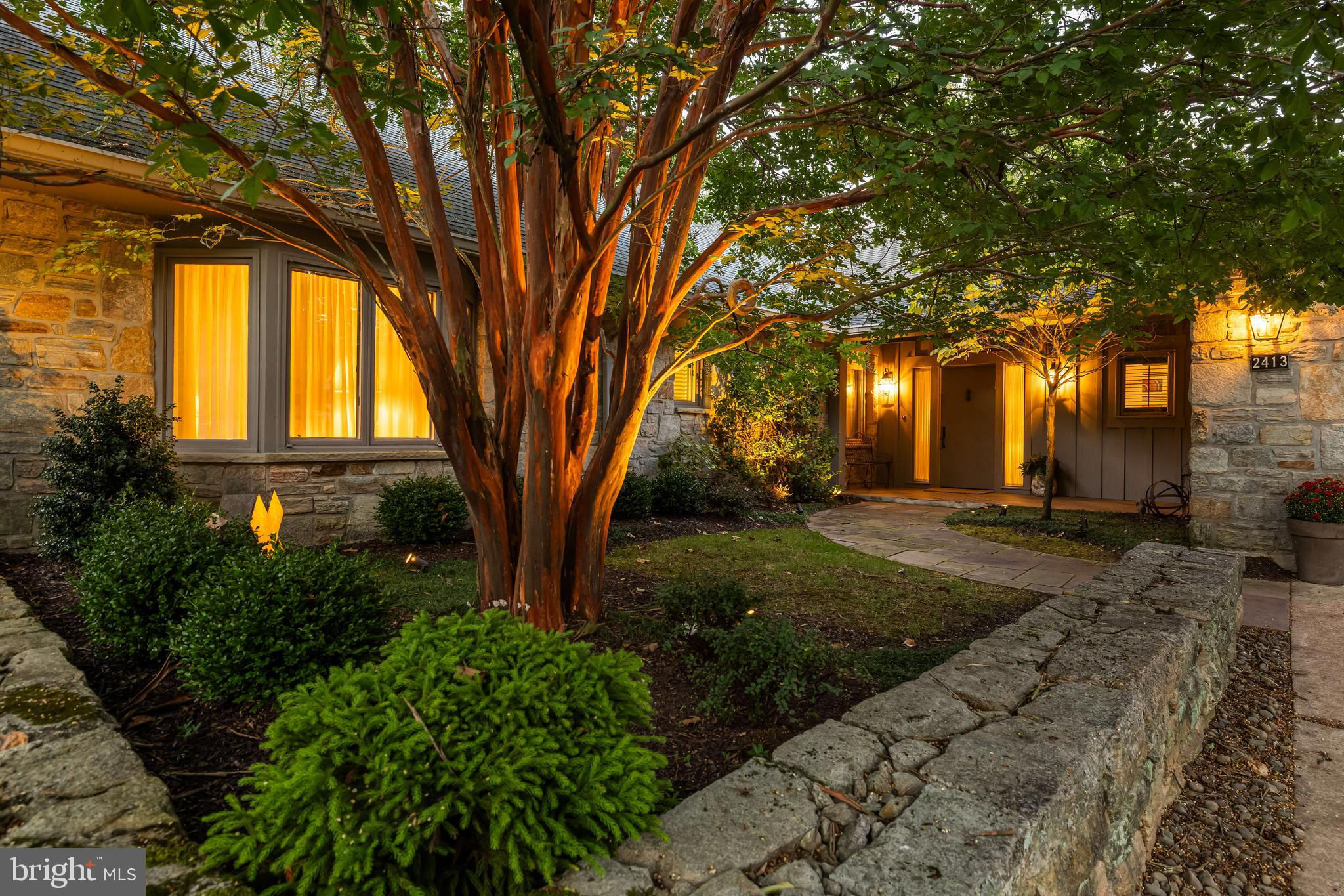 A stone garden wall frames a beautiful entry garden with a stone walkway leading to the covered porch of this luxury home, seamlessly expanded and thoroughly updated. Beautifully sited on one of the finest lots in the gated Rockland community, backing to green space allowing maximum privacy for the deck and patios. Easy one- floor luxury living with the added dimension of a walk-out finished Lower Level that includes a Rec Room with fireplace and wet bar, a sunny Studio/Crafts Room and Bedroom 3/Guest Room and full Bath. A warm wood-paneled Foyer leads to the Living Room through a post-and-beam portal and to the Family Room. This exceptional residence at 2413 Still Forest Road offers 3 bedrooms, 3/1 baths, and over 5,000 square feet of richly appointed living space, blending architectural charm with thoughtful updates. Located just minutes from Green Spring Station and major commuter routes, it’s a rare offering in one of Baltimore County’s most desirable neighborhoods. The main level unfolds with a balance of formal and informal spaces. The expansive Living Room is a focal point, anchored by a striking stone fireplace with gas insert and flanked by dual access points to the sunroom. Wide-plank hardwood floors and a beamed ceiling add to the room’s character, while triple windows and a door to the elevated deck connect the interior to the serene outdoors. Flowing directly from the Living Room, the Dining Room offers generous proportions and rich finishes, including another beamed ceiling, wide-plank floors, and built-in ceiling speakers, creating an ideal setting for hosting dinner parties or holiday gatherings. The Kitchen is truly extraordinary, both in scale and craftsmanship. Custom white Shaker cabinetry surrounds a substantial contrasting island, all topped with granite and complemented by a marble backsplash. Gourmet appliances are seamlessly integrated, and a matching wet bar includes a second dishwasher, wine coolers, and an icemaker. A built-in desk, dual pantry closets, and walls of built-in shelving add exceptional function, while a skylight and breakfast area with banquette seating provide a warm, inviting spot to gather. The Sunroom features vaulted wood-paneled ceilings and three sets of floor-length windows, offering a peaceful transition between indoor comfort and outdoor beauty. A warm, comfortable Family Room offers a wall of custom built-in cabinetry and glass door to a stone Patio. Privately tucked away on the main level, the bedroom wing includes a luxurious Primary Suite with a bay window alcove, custom built-ins, and two fully outfitted dressing rooms. The marble-clad Primary Bath offers dual vanities, a Bain Ultra soaking tub, and a spa-style shower with multiple sprays and a built-in bench. Bedroom 2 also enjoys its own bay window seating area and custom fitted closets, with easy access to a beautifully finished full bath. A stylish Powder Room near the Foyer adds additional convenience for guests. The finished lower level provides additional living space with its expansive Recreation Room, featuring a second stone fireplace, custom bar, and built-in shelving. A Studio space with three sliding glass doors and a wall of cabinetry offers a flexible zone for creative work or hobbies. The third Bedroom on this level is generous and private, with two walk-in closets, one cedar-lined, and access to a full bath with marble finishes and a walk-in shower. Additional built-ins, a workshop, and large closets complete this highly functional space. Outside, the property is a showcase of thoughtful landscaping and private outdoor living. The elevated deck, accessible from both the Kitchen and Living Room, includes a retractable awning and gas grill hookup, while stone patios and garden walkways connect seamlessly to the natural surroundings. The backyard flows gently toward a wooded hillside, offering privacy and a sense of retreat and a fully outfitted garden shed below the Sunroom adds storage and workspace