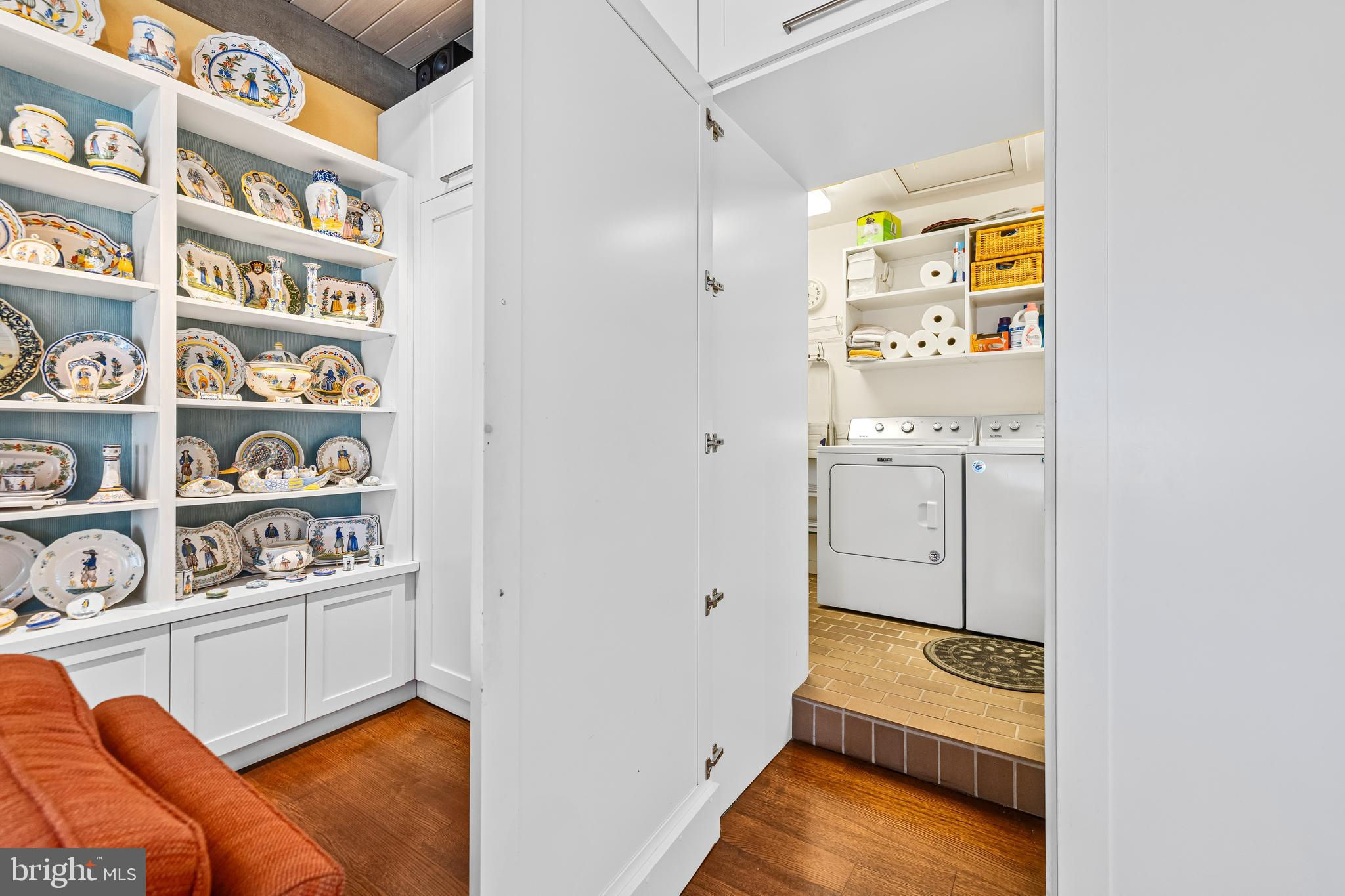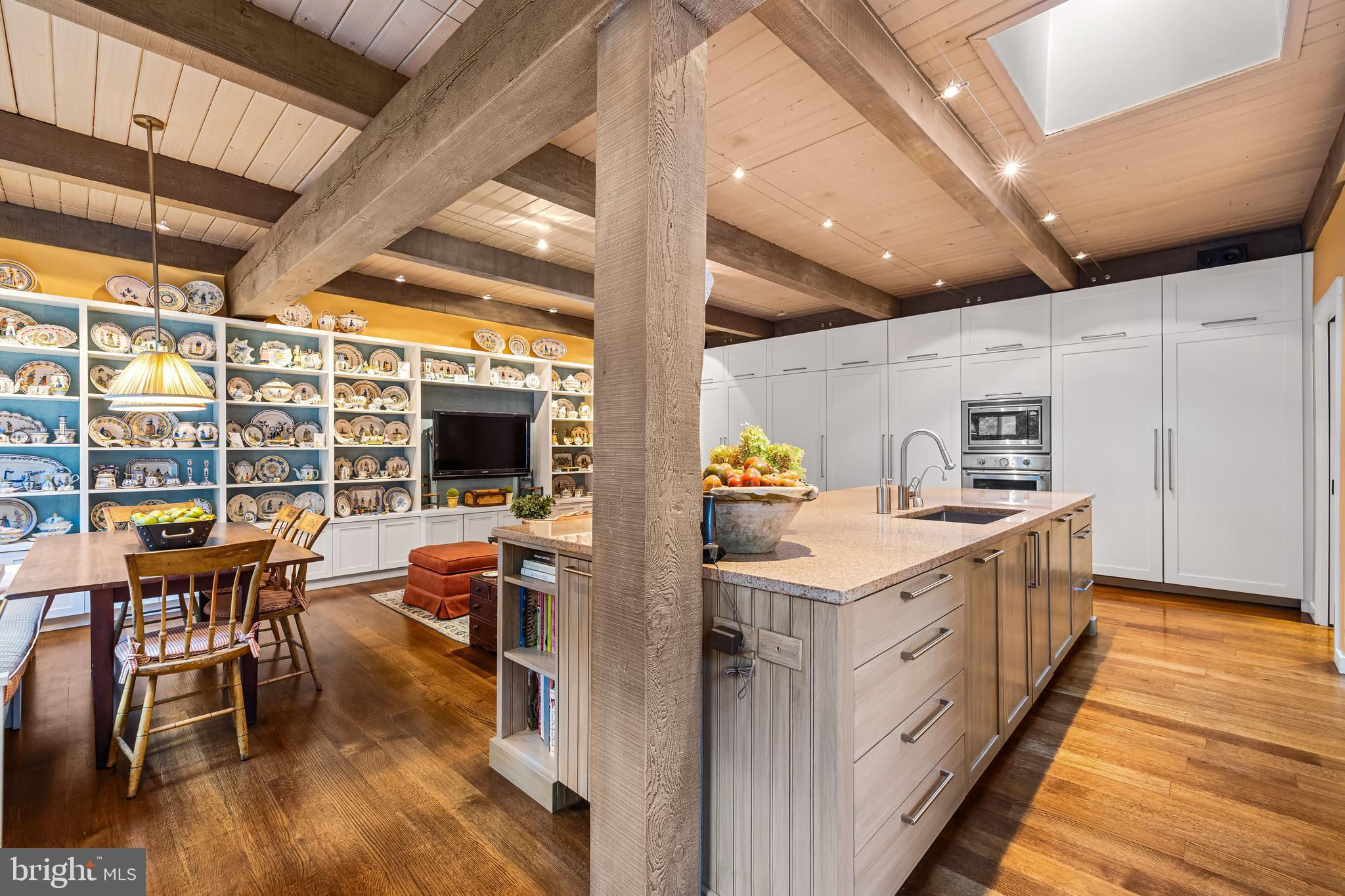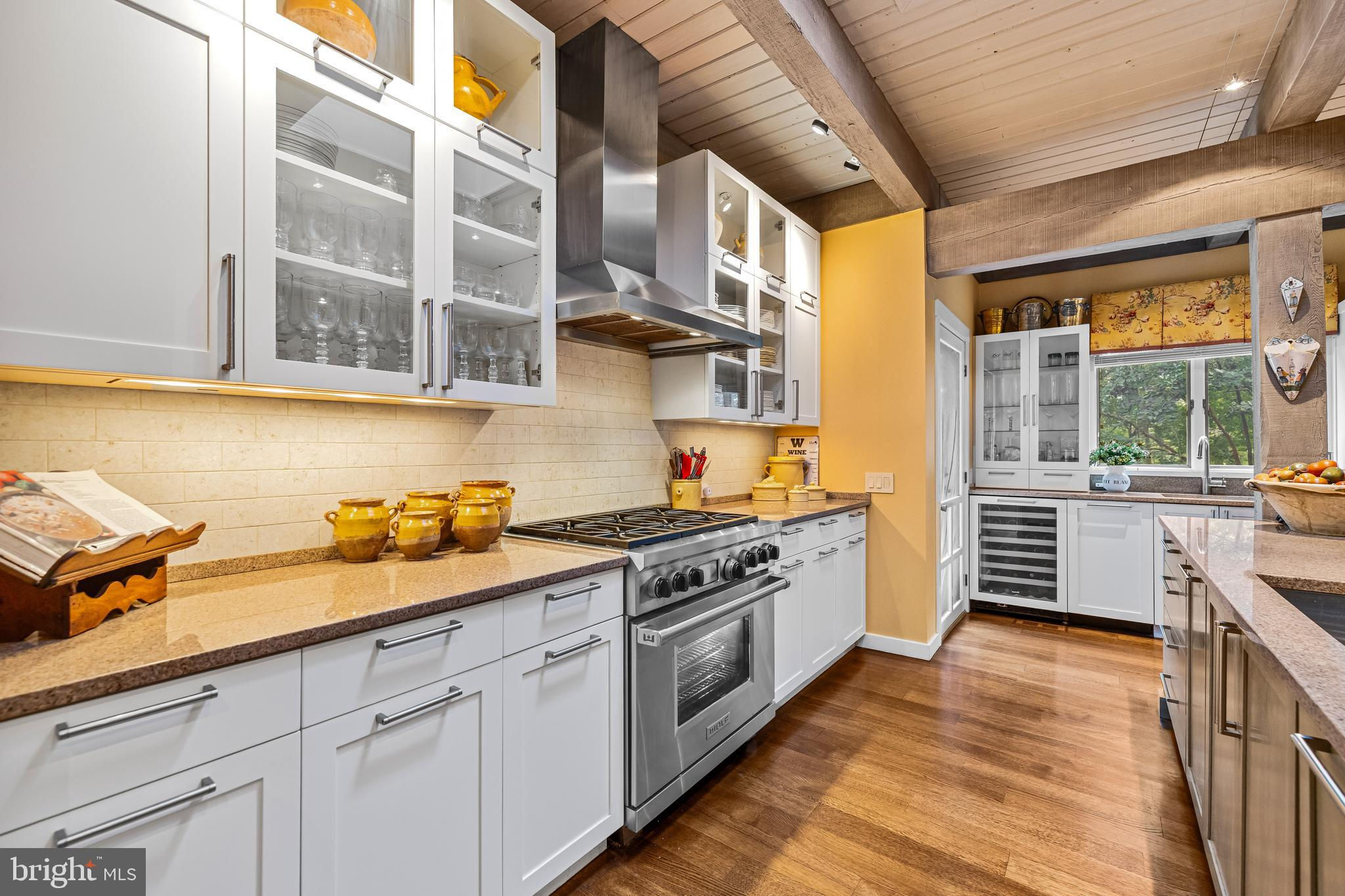 A stone garden wall frames a beautiful entry garden with a stone walkway leading to the covered porch of this luxury home, seamlessly expanded and thoroughly updated. Beautifully sited on one of the finest lots in the gated Rockland community, backing to green space allowing maximum privacy for the deck and patios. Easy one- floor luxury living with the added dimension of a walk-out finished Lower Level that includes a Rec Room with fireplace and wet bar, a sunny Studio/Crafts Room and Bedroom 3/Guest Room and full Bath. A warm wood-paneled Foyer leads to the Living Room through a post-and-beam portal and to the Family Room. This exceptional residence at 2413 Still Forest Road offers 3 bedrooms, 3/1 baths, and over 5,000 square feet of richly appointed living space, blending architectural charm with thoughtful updates. Located just minutes from Green Spring Station and major commuter routes, it’s a rare offering in one of Baltimore County’s most desirable neighborhoods. The main level unfolds with a balance of formal and informal spaces. The expansive Living Room is a focal point, anchored by a striking stone fireplace with gas insert and flanked by dual access points to the sunroom. Wide-plank hardwood floors and a beamed ceiling add to the room’s character, while triple windows and a door to the elevated deck connect the interior to the serene outdoors. Flowing directly from the Living Room, the Dining Room offers generous proportions and rich finishes, including another beamed ceiling, wide-plank floors, and built-in ceiling speakers, creating an ideal setting for hosting dinner parties or holiday gatherings. The Kitchen is truly extraordinary, both in scale and craftsmanship. Custom white Shaker cabinetry surrounds a substantial contrasting island, all topped with granite and complemented by a marble backsplash. Gourmet appliances are seamlessly integrated, and a matching wet bar includes a second dishwasher, wine coolers, and an icemaker. A built-in desk, dual pantry closets, and walls of built-in shelving add exceptional function, while a skylight and breakfast area with banquette seating provide a warm, inviting spot to gather. The Sunroom features vaulted wood-paneled ceilings and three sets of floor-length windows, offering a peaceful transition between indoor comfort and outdoor beauty. A warm, comfortable Family Room offers a wall of custom built-in cabinetry and glass door to a stone Patio. Privately tucked away on the main level, the bedroom wing includes a luxurious Primary Suite with a bay window alcove, custom built-ins, and two fully outfitted dressing rooms. The marble-clad Primary Bath offers dual vanities, a Bain Ultra soaking tub, and a spa-style shower with multiple sprays and a built-in bench. Bedroom 2 also enjoys its own bay window seating area and custom fitted closets, with easy access to a beautifully finished full bath. A stylish Powder Room near the Foyer adds additional convenience for guests. The finished lower level provides additional living space with its expansive Recreation Room, featuring a second stone fireplace, custom bar, and built-in shelving. A Studio space with three sliding glass doors and a wall of cabinetry offers a flexible zone for creative work or hobbies. The third Bedroom on this level is generous and private, with two walk-in closets, one cedar-lined, and access to a full bath with marble finishes and a walk-in shower. Additional built-ins, a workshop, and large closets complete this highly functional space. Outside, the property is a showcase of thoughtful landscaping and private outdoor living. The elevated deck, accessible from both the Kitchen and Living Room, includes a retractable awning and gas grill hookup, while stone patios and garden walkways connect seamlessly to the natural surroundings. The backyard flows gently toward a wooded hillside, offering privacy and a sense of retreat and a fully outfitted garden shed below the Sunroom adds storage and workspace