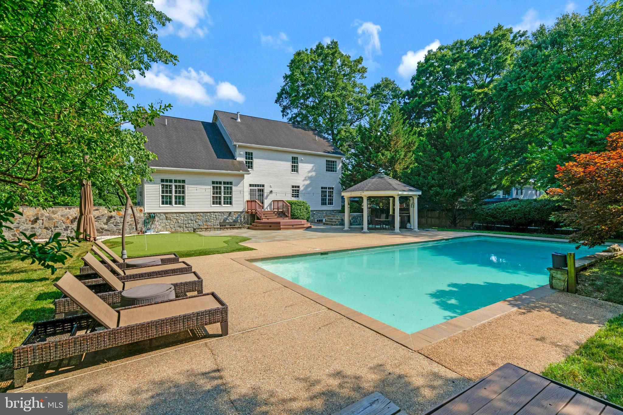 $100,000 PRICE REDUCTION! You could be swimming this pool before the end of the month!! Welcome to an extraordinary property in Alexandria. Nestled on over three quarters of an acre behind a gated entrance you will feel tucked away with lots of space to live, entertain and relax in. The home is almost 6,000 sq ft of expansive elegant living. Walking inside the front door you are greeted with vaulted ceilings and a grand staircase. The main level features formal living room and dining room, office and gourmet kitchen with island open to a vaulted ceiling family room with gas fireplace. Step out side the sliding doors to one of the most amazing yards in Alexandria. There you find a huge pool, hot tub, putting green, gazebo, tiki bar with out side kitchen. The yard is wired for music and beautiful lighting. There's still lots of room to add a pool house, or an auxiliary living unit. So much space! Back in side, the upper level has 4 bedrooms including a primary ensuite with gas fireplace, sitting area, double closets and large bathroom. Heading down to the lower level there is another gas fireplace, lots of room for a pool or pingpong table, plus a theatre room, another bedroom and workout/extra room. The oversized two car garage is set up for electric car charging. Located in the highly sought after Fort Hunt community, you have access to great youth sports programs, community centers, including the Mount Vernon Community Center which is currently receiving a multi-million dollar renovation that will feature two ice rinks, swimming pool, fitness area. Just south of Old Town Alexandria, it's great for commuting, just a couple of miles from hwy 495, it's also just a short 20 minute drive Reagan International .Airport. During the summer months you are steps away from a farmer's market for fresh produce, baked goods, plants and more. Also located close by is the Sherwood Hall Library. Come see this hidden gem for yourself! It's really a one-of-a-kind property.