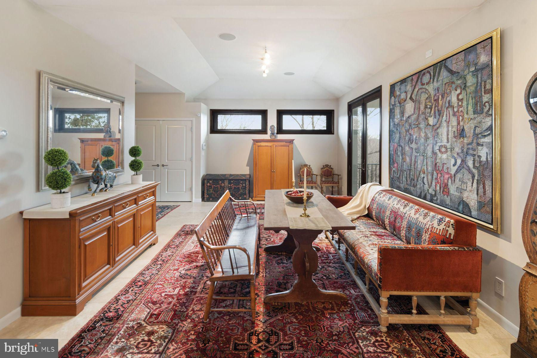 Built with a significant emphasis on quality and sustainability, the European-influenced "San Souci" is offered for the first time. Convenient to Newtown, Yardley and New Hope, this home is a world away from typical newer construction, this privately situated, custom residence is on 5.9 acres high above the historic Delaware River canal, perfectly located for walking and bicycling as well as for easy access to Princeton, Philadelphia, and train service to New York and beyond. Step inside this LEED-certified home and feel how open and light-filled the entire main living level is. Custom Andersen windows and doors galore frame views and let the sunshine in on timeless marble floors. A Canadian-built soapstone wood-burning fireplace can warm the living space for hours, supplemented by the home's efficient geothermal and solar systems with hot-water radiant tubing in place beneath most of the home's floors. The open plan is flexible and smartly designed with spaces for dining, including a charming hidden breakfast nook, seating areas, a private home office, a four-season sunroom with fireplace and a stunning kitchen. Designed for the serious cook, the kitchen has storage galore with a walk-in pantry closet and custom Amish-made cabinetry, professional-grade Thermador appliances (two full-size wall ovens, warming drawer, 48" gas cooktop with powerful ventilation hood, refrigerator/freezer, dishwasher), wine chiller, built-in microwave/convection and a large island topped in a single sheet of granite, all lined in fun LED rope lighting. Whether for daily needs or special occasions, this kitchen will perform quite capably, and the cook will appreciate the views. This home has a remarkable amount of indoor-outdoor flow, including access to a deck with built-in seating and BBQ space just off the kitchen, a large corner veranda off the dining area and a patio with built-in firepit and seating off the sunroom. And that is just the first floor. The open central stairwell, where there is plenty of gallery-style wall space for art and a skylight, leads to private quarters on the second floor. An owner's suite with a large private balcony and ample space for a seating area includes a large bath with extra-deep steeping tub, oversized two-person shower and two wall-hung vanities plus three closets, including walk-in with built-ins. A second en suite bedroom with private balcony, bedroom with access to a hall bath, and fourth bedroom with a fun "a-ha" entrance and its own full bath complete the upstairs. All bedrooms have hardwood floors and plenty of windows for natural light. A full laundry room with laundry chute is on the first floor and includes generous storage. The finished lower level provides a home theater with built-in sound system and tiered seating, a full gym, full bath and space ready to become your wine cellar. Utility rooms and a four-car garage complete this level. To support the LEED living environment, this home has a Honeywell air filtration system, cistern for collecting rainwater for gardening/car washing, well water treatment system, whole-house vac, plus the security and comfort provided by a whole-house generator. "San Souci" is an ideal residence for the buyer seeking a thoughtfully designed house offering privacy, home office and recreation spaces, and an ideal location just a few minutes from I-95.