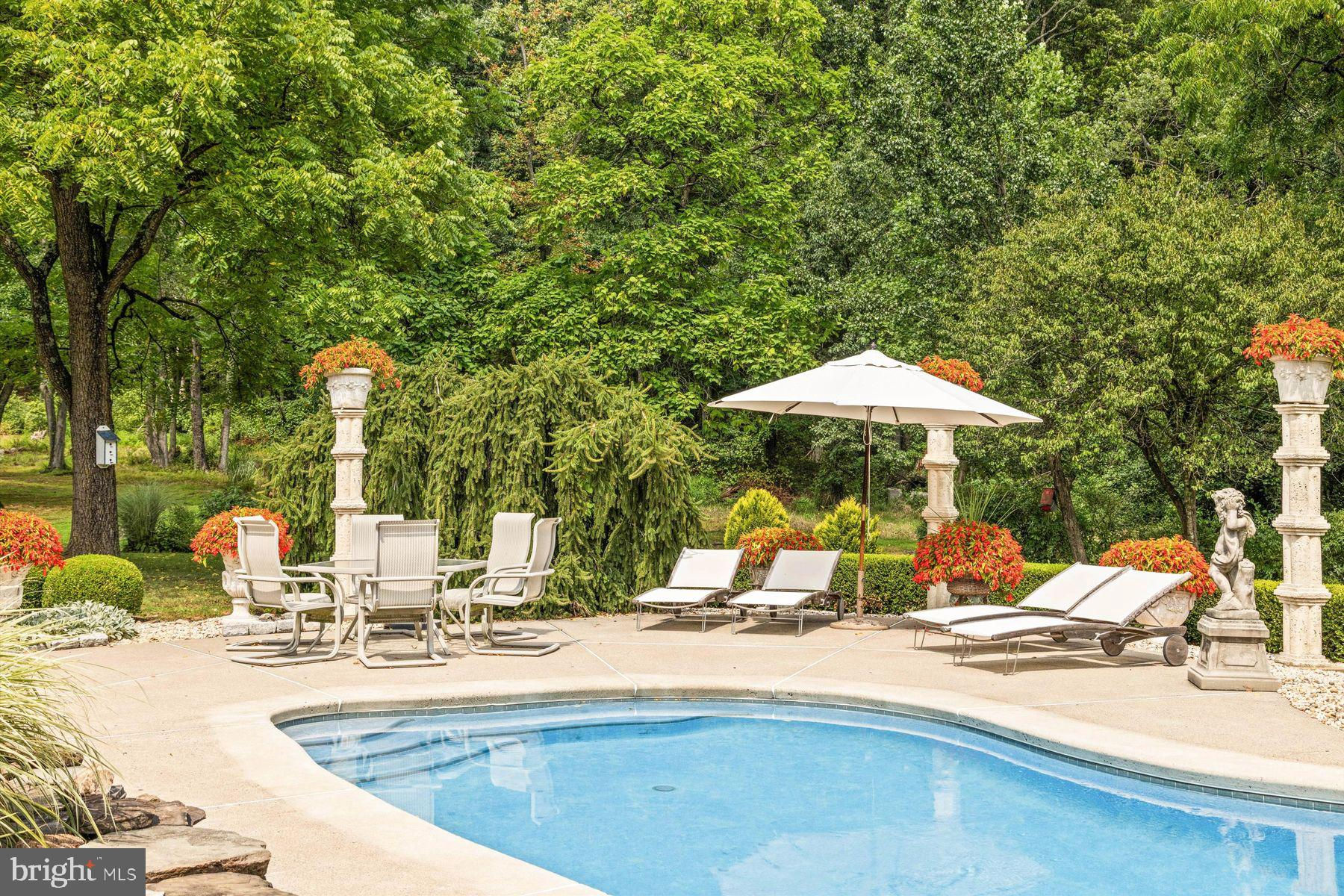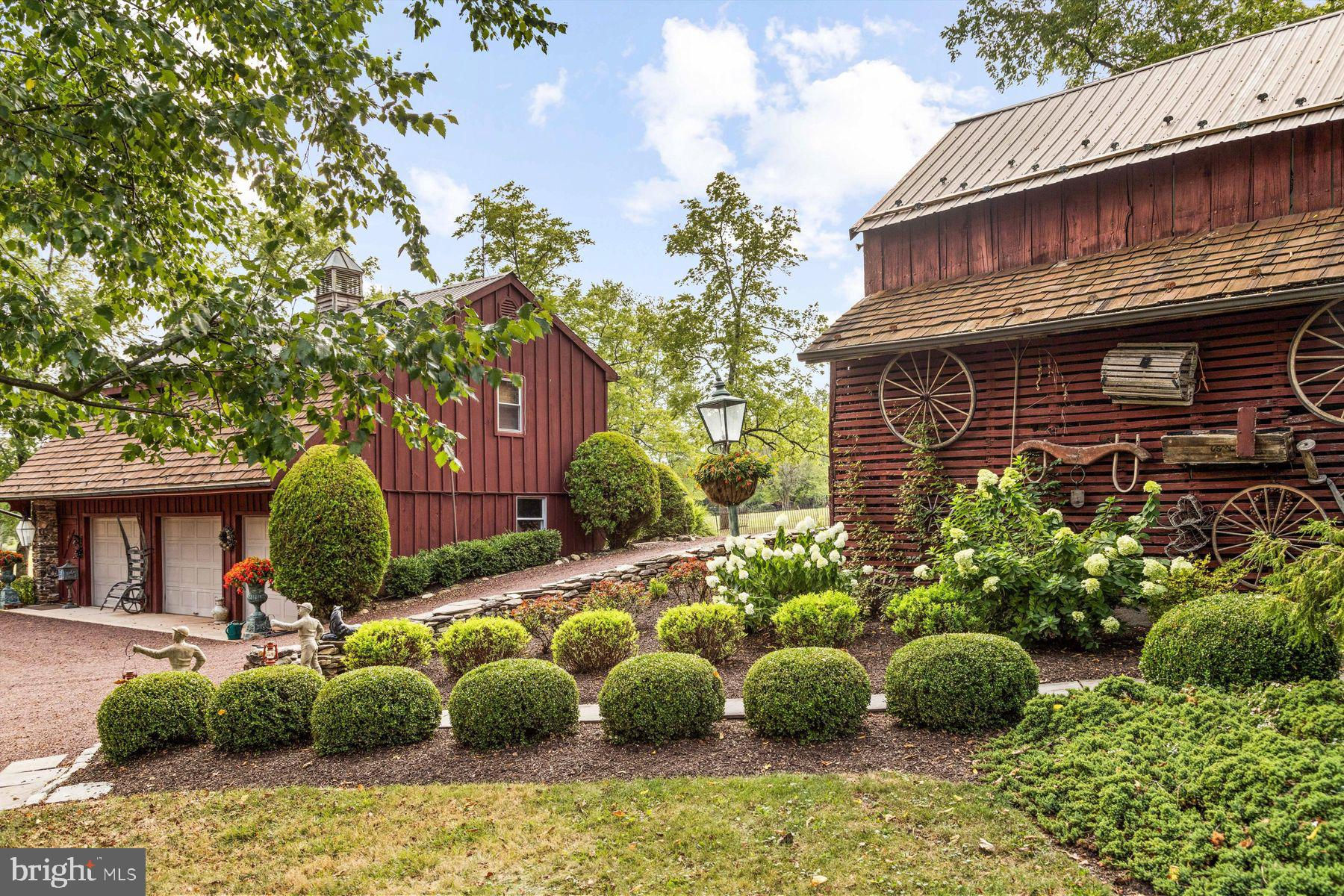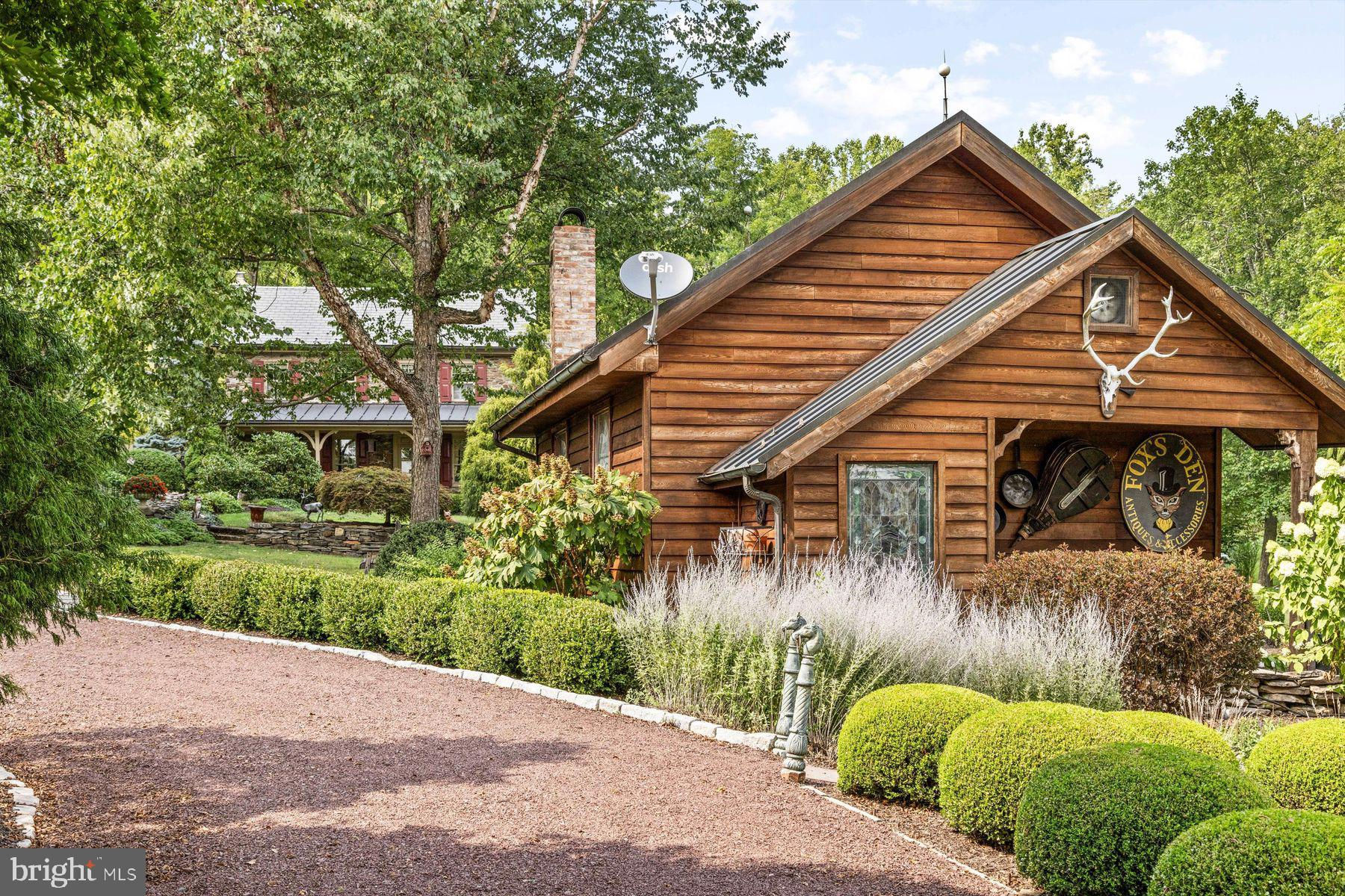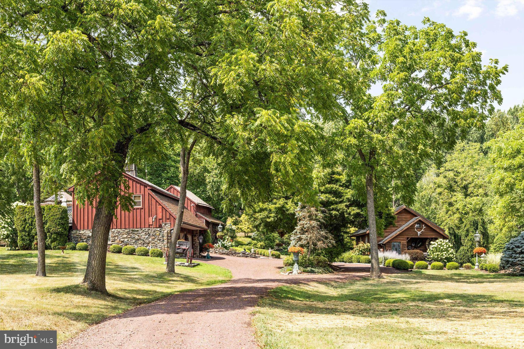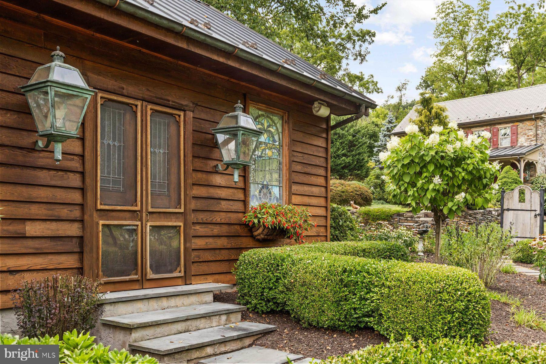 Drifting Dell Farm is an idyllic sanctuary epitomizing the charm and tranquility of Upper Bucks County. As you enter through the long, gated drive, you’ll find yourself in a world of breathtaking beauty, where 21 meticulously maintained acres unfold before you. This classic country retreat is adorned with lush perennial gardens, elegant stone walls, fenced pastures, and pristine Gallows Run stream that adds to the serene atmosphere. The centerpiece of the property is the c.1784 stone farmhouse, offering four bedrooms and 3 baths. This home is a showcase of timeless craftsmanship, with original period details such as wide plank floors, exposed beams, deep-sill windows, high ceilings, and four stately fireplaces that provide warmth and character. The heart of the home is a chef’s dream, commercial-grade kitchen open to the large dining room featuring a striking floor-to-ceiling stone fireplace with a grand wood mantel. The adjoining family room, with its arched windows, offers picturesque views of a cascading waterfall and spring-fed creek, creating a perfect blend of indoor comfort and outdoor beauty. Every aspect of Drifting Dell Farm exudes charm and meticulous care, extending to the property’s outbuildings. The old-world pub and pool house features an antique bar, brick flooring, dramatic floor-to-ceiling brick fireplace, cathedral ceiling with exposed beams, and stained-glass windows that enhance the ambiance. Just steps away, the refreshing in-ground pool invites relaxation. The estate includes a carriage house built on the stone foundation of an original barn featuring three-bay garage and guest or caretaker quarters above with two bedrooms and one full plus one half bat. Equestrians will appreciate the the picturesque red barn with stalls, two two turnout sheds, and acres of open grassy pasture. A whimsical aviary adds to the charm of this remarkable property. Drifting Dell Farm is more than just a home; it’s a private retreat where history, nature, and luxury converge.