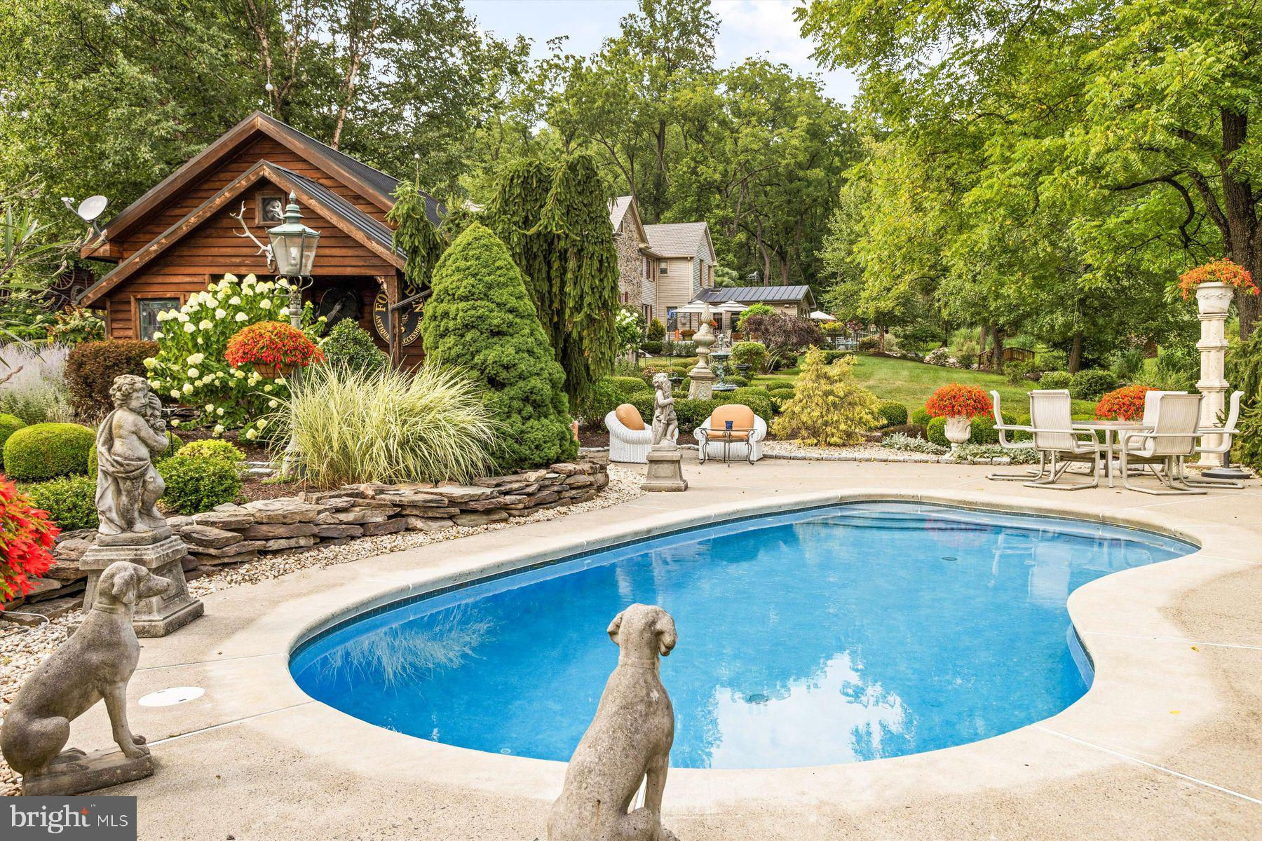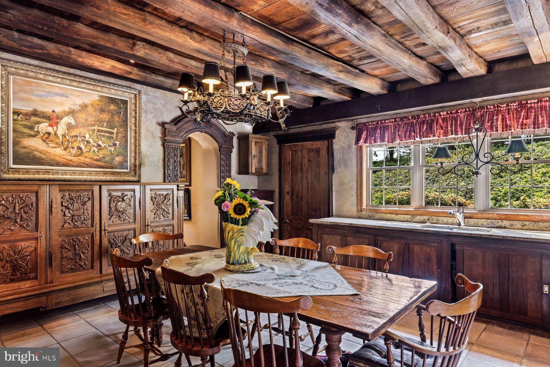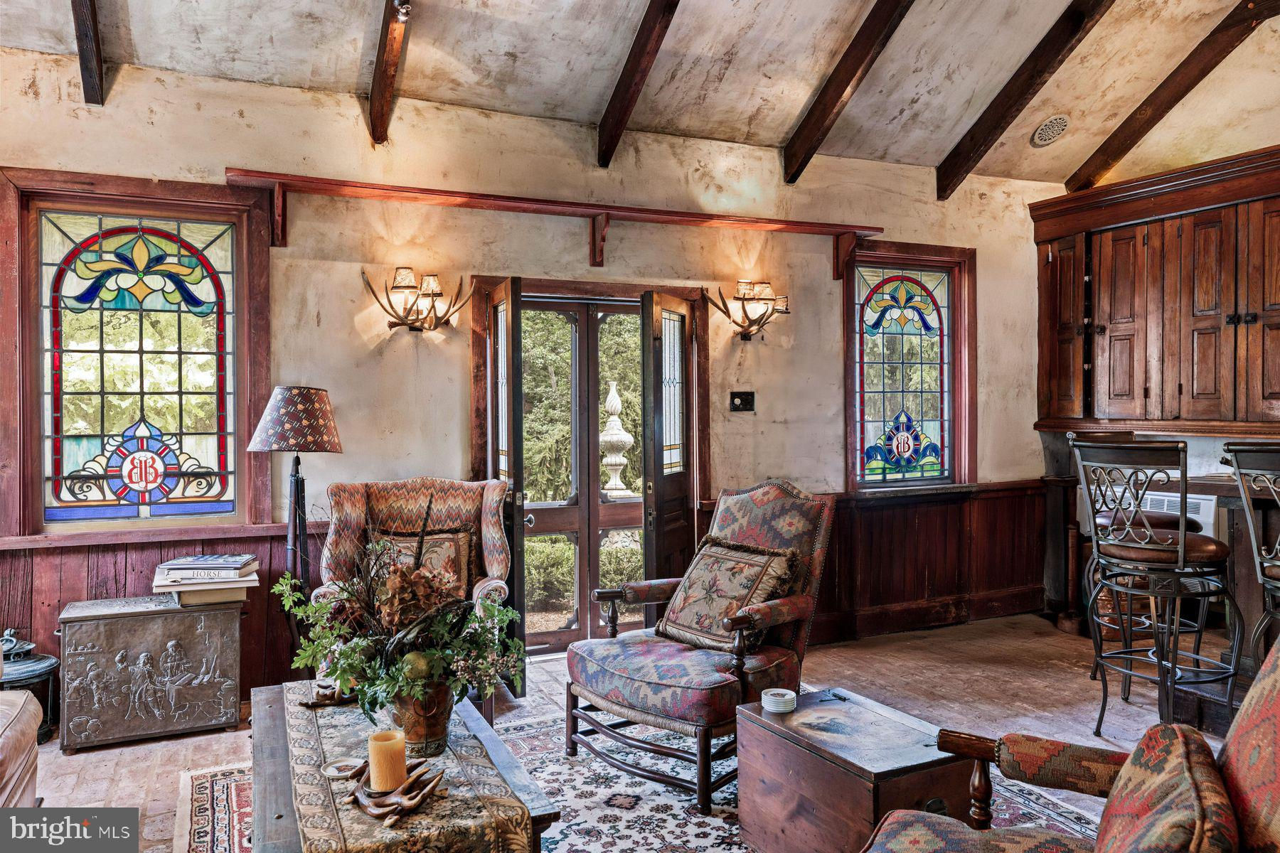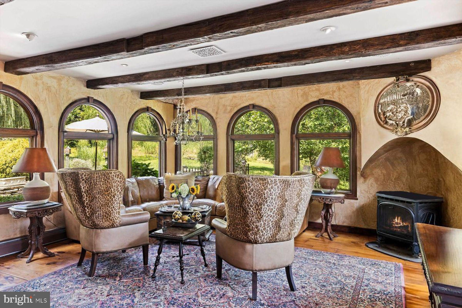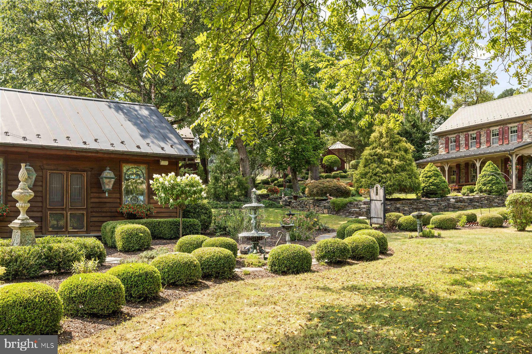 Drifting Dell Farm is an idyllic sanctuary epitomizing the charm and tranquility of Upper Bucks County. As you enter through the long, gated drive, you’ll find yourself in a world of breathtaking beauty, where 21 meticulously maintained acres unfold before you. This classic country retreat is adorned with lush perennial gardens, elegant stone walls, fenced pastures, and pristine Gallows Run stream that adds to the serene atmosphere. The centerpiece of the property is the c.1784 stone farmhouse, offering four bedrooms and 3 baths. This home is a showcase of timeless craftsmanship, with original period details such as wide plank floors, exposed beams, deep-sill windows, high ceilings, and four stately fireplaces that provide warmth and character. The heart of the home is a chef’s dream, commercial-grade kitchen open to the large dining room featuring a striking floor-to-ceiling stone fireplace with a grand wood mantel. The adjoining family room, with its arched windows, offers picturesque views of a cascading waterfall and spring-fed creek, creating a perfect blend of indoor comfort and outdoor beauty. Every aspect of Drifting Dell Farm exudes charm and meticulous care, extending to the property’s outbuildings. The old-world pub and pool house features an antique bar, brick flooring, dramatic floor-to-ceiling brick fireplace, cathedral ceiling with exposed beams, and stained-glass windows that enhance the ambiance. Just steps away, the refreshing in-ground pool invites relaxation. The estate includes a carriage house built on the stone foundation of an original barn featuring three-bay garage and guest or caretaker quarters above with two bedrooms and one full plus one half bat. Equestrians will appreciate the the picturesque red barn with stalls, two two turnout sheds, and acres of open grassy pasture. A whimsical aviary adds to the charm of this remarkable property. Drifting Dell Farm is more than just a home; it’s a private retreat where history, nature, and luxury converge.
