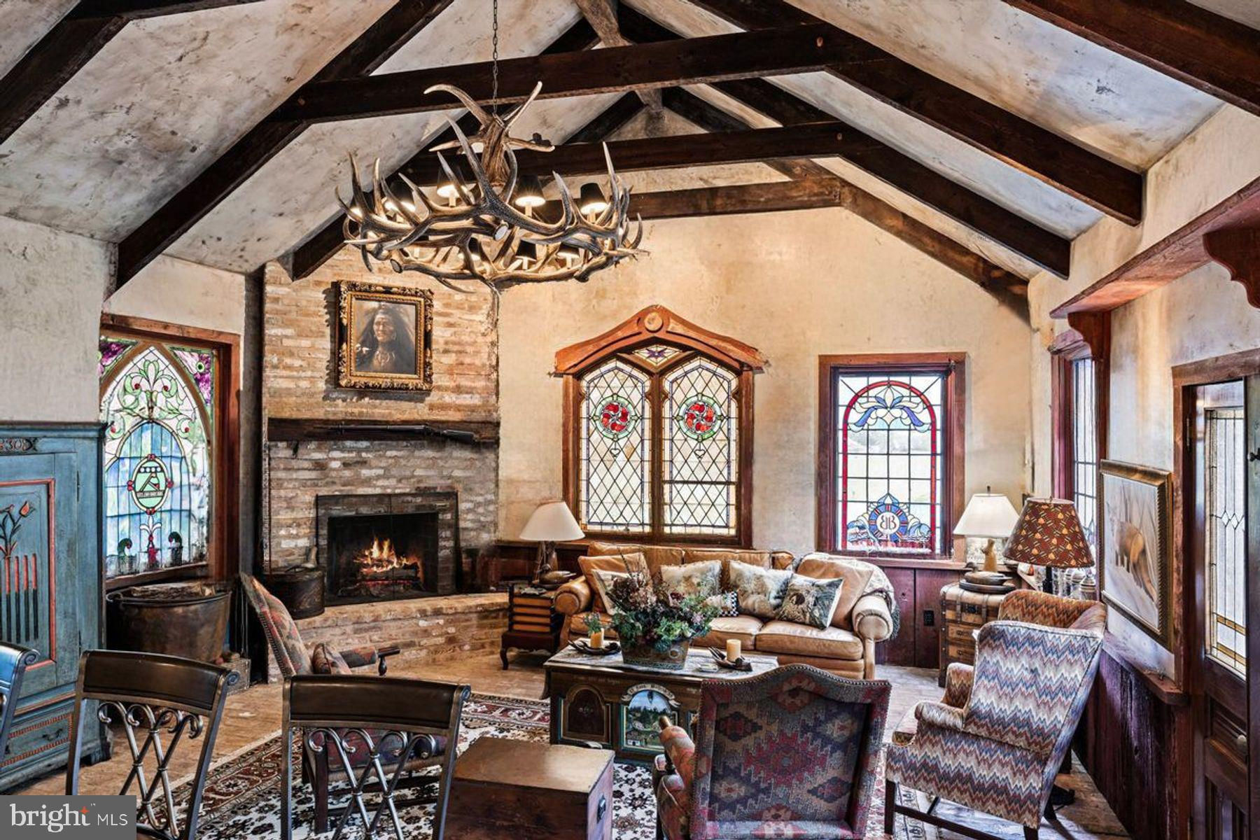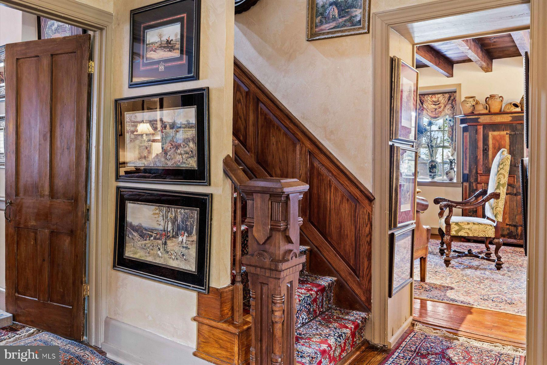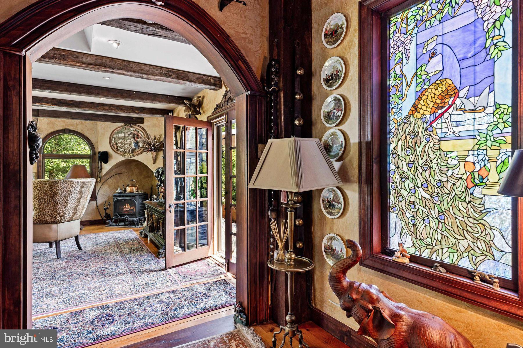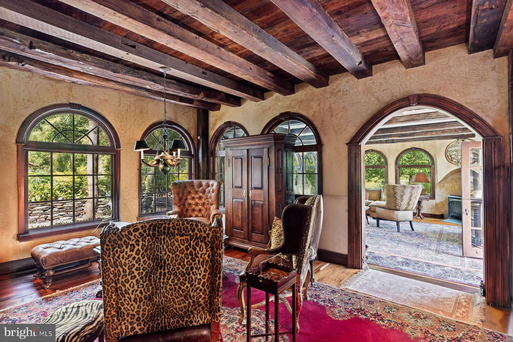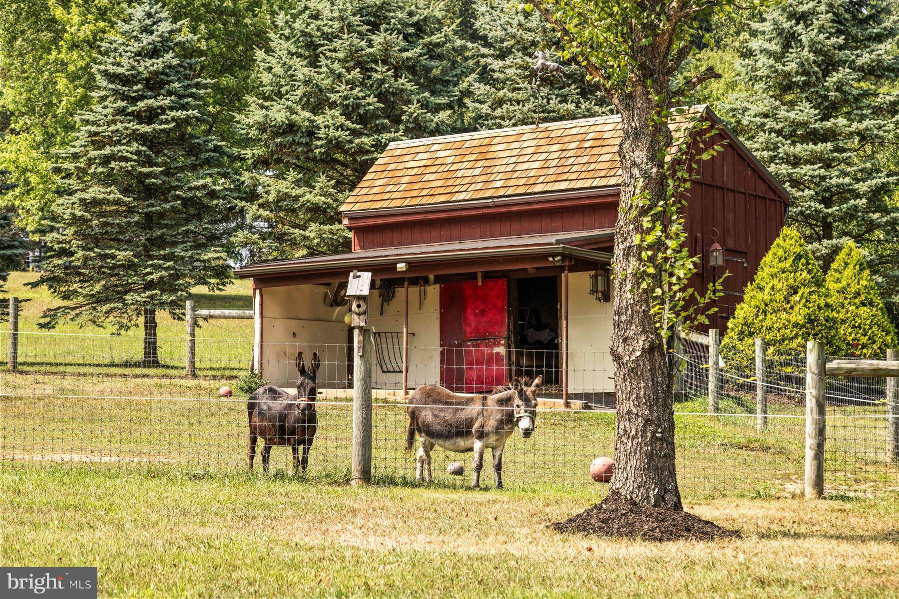 Drifting Dell Farm is an idyllic sanctuary epitomizing the charm and tranquility of Upper Bucks County. As you enter through the long, gated drive, you’ll find yourself in a world of breathtaking beauty, where 21 meticulously maintained acres unfold before you. This classic country retreat is adorned with lush perennial gardens, elegant stone walls, fenced pastures, and pristine Gallows Run stream that adds to the serene atmosphere. The centerpiece of the property is the c.1784 stone farmhouse, offering four bedrooms and 3 baths. This home is a showcase of timeless craftsmanship, with original period details such as wide plank floors, exposed beams, deep-sill windows, high ceilings, and four stately fireplaces that provide warmth and character. The heart of the home is a chef’s dream, commercial-grade kitchen open to the large dining room featuring a striking floor-to-ceiling stone fireplace with a grand wood mantel. The adjoining family room, with its arched windows, offers picturesque views of a cascading waterfall and spring-fed creek, creating a perfect blend of indoor comfort and outdoor beauty. Every aspect of Drifting Dell Farm exudes charm and meticulous care, extending to the property’s outbuildings. The old-world pub and pool house features an antique bar, brick flooring, dramatic floor-to-ceiling brick fireplace, cathedral ceiling with exposed beams, and stained-glass windows that enhance the ambiance. Just steps away, the refreshing in-ground pool invites relaxation. The estate includes a carriage house built on the stone foundation of an original barn featuring three-bay garage and guest or caretaker quarters above with two bedrooms and one full plus one half bat. Equestrians will appreciate the the picturesque red barn with stalls, two two turnout sheds, and acres of open grassy pasture. A whimsical aviary adds to the charm of this remarkable property. Drifting Dell Farm is more than just a home; it’s a private retreat where history, nature, and luxury converge.