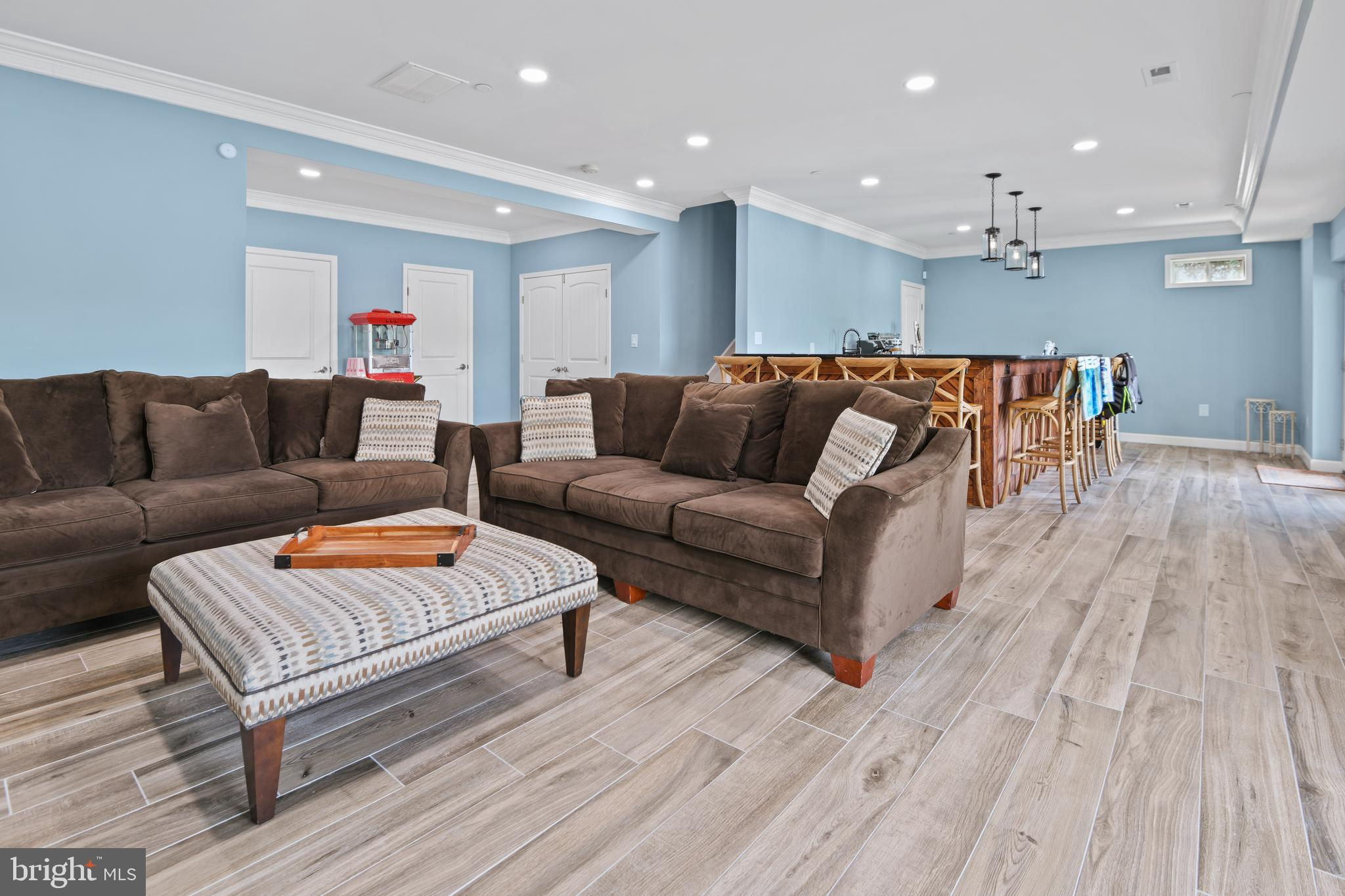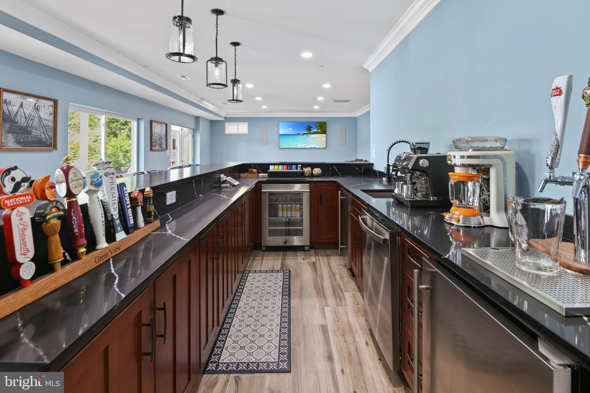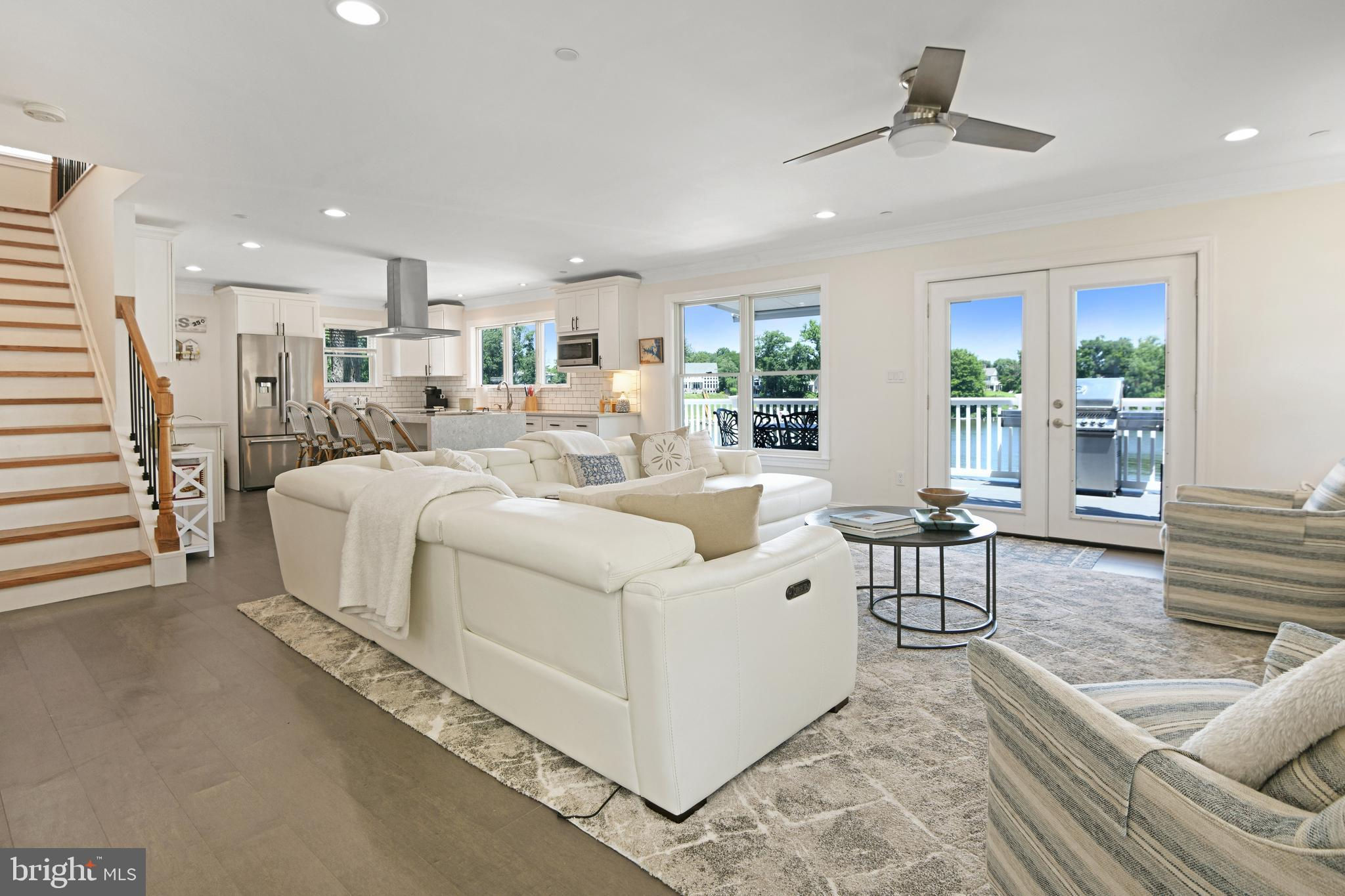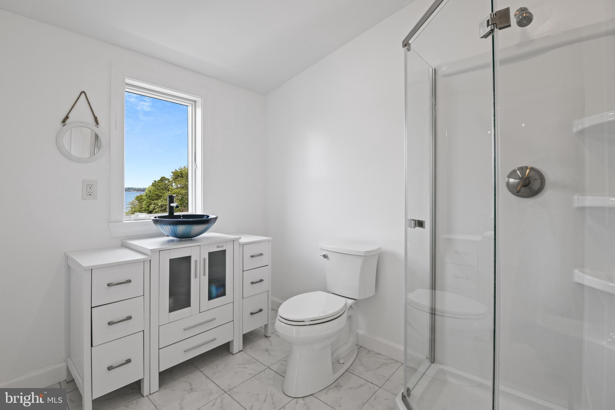 Welcome to your private waterfront oasis! Only 3 years young and meticulously maintained, this stunning residence offers the feel of a luxury model home—inside and out. Nestled along over 50 feet of private beachfront, this four-level property spans approximately 4,000 square feet of finished living space, thoughtfully designed to showcase breathtaking water views from nearly every window. As you enter, you're greeted by a beautifully upgraded foyer and a remodeled powder room. The open-concept main level features an expansive dining room that flows seamlessly into a spacious family room with an electric fireplace, creating the perfect ambiance for gatherings. The gourmet kitchen is a showstopper, boasting custom quartz countertops, a dramatic quartz waterfall island with seating space, white cabinetry, stainless steel appliances, upgraded hood, custom backsplash, and a large picture window that frames stunning views of Cool Spring Cove and the Magothy River. Step outside from the main level to one of four composite decks, complete with an electric retractable awning for shaded comfort. Upstairs, the luxurious primary suite offers a spacious bedroom, private balcony, massive walk-in closet, and a spa-like bathroom with soaking tub and walk-in shower. Two additional large bedrooms, a full hall bath, and a convenient laundry room complete this level. The top level features a bright and airy loft, a third full bathroom, and an expansive fourth bedroom with panoramic water views. The finished lower level continues to impress with a second family room, a full wet bar with quartz countertops, refrigerator, dishwasher, Ice maker, 2 tap kegerator and seating—ideal for entertaining. Movie nights are unforgettable in the custom home theater, and guests will love the elegant fourth full bath, featuring dual rainfall shower heads, a bench, and dual vanities. Step out from the lower level to the deck with a strategically placed hot tub, offering unobstructed views and glass panel railings to maximize the scenery. Enjoy a cozy fire on the patio, or follow the beautifully crafted hardscaped steps with custom lighting down to your private beach. Launch a kayak, go crabbing off the private dock, or take your boat out—just five minutes from the mouth of the Chesapeake Bay! The dock is fully equipped with 2 rotating jet ski lifts, a 12,000lb boat lift, water, electricity, shore power and bumpers. Additionally, there is ample space for guests to pull up and dock. Conveniently located near Donnelly’s Dockside and The Point—easily accessible by boat or car. All of this, plus an oversized one-car garage makes this home a must-see. Don't miss this amazing opportunity to call this unbelievable property your home!