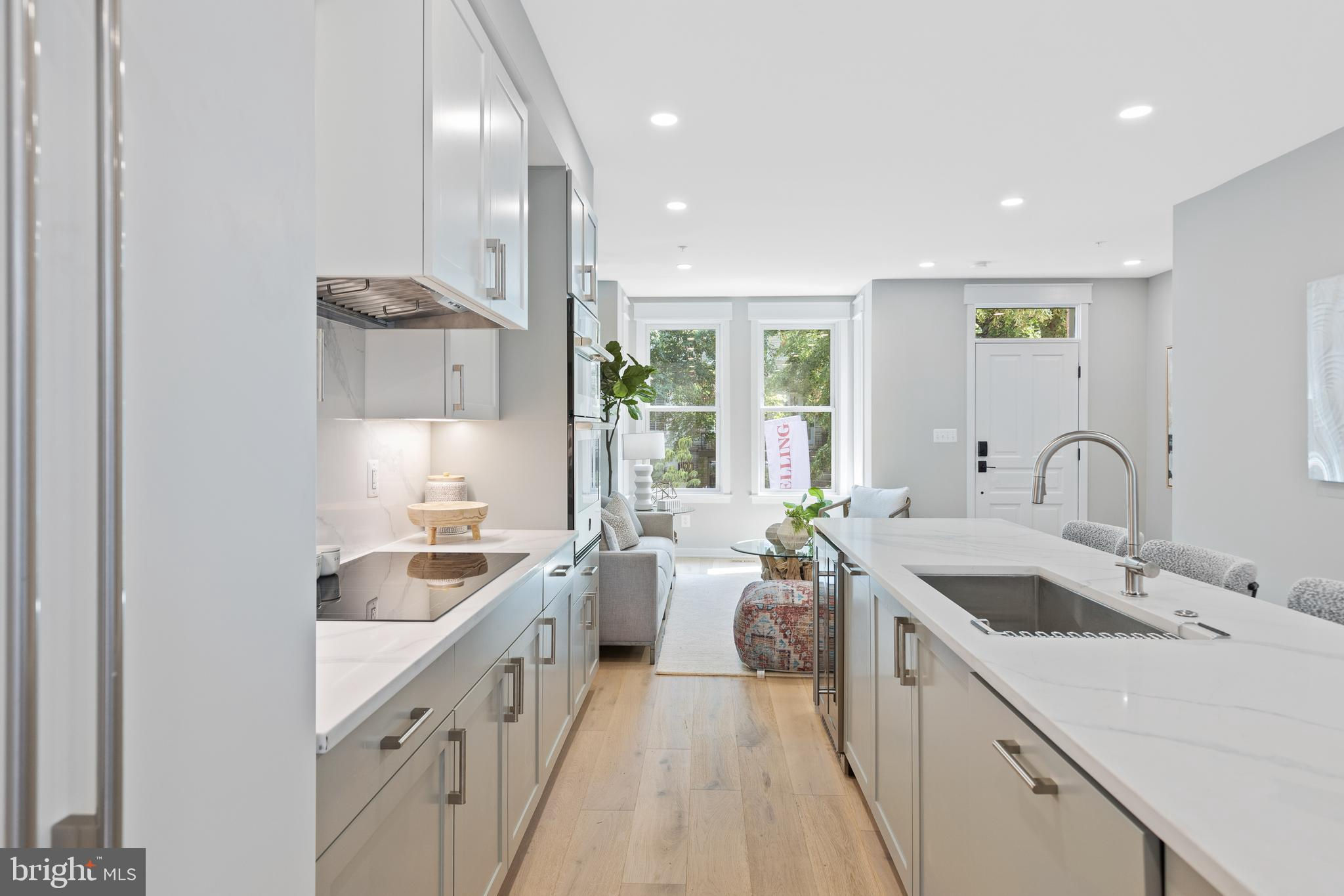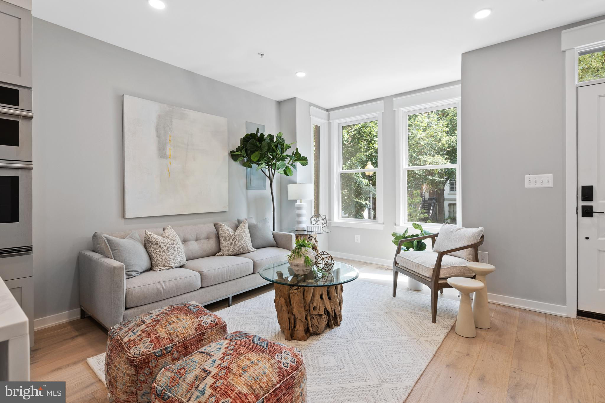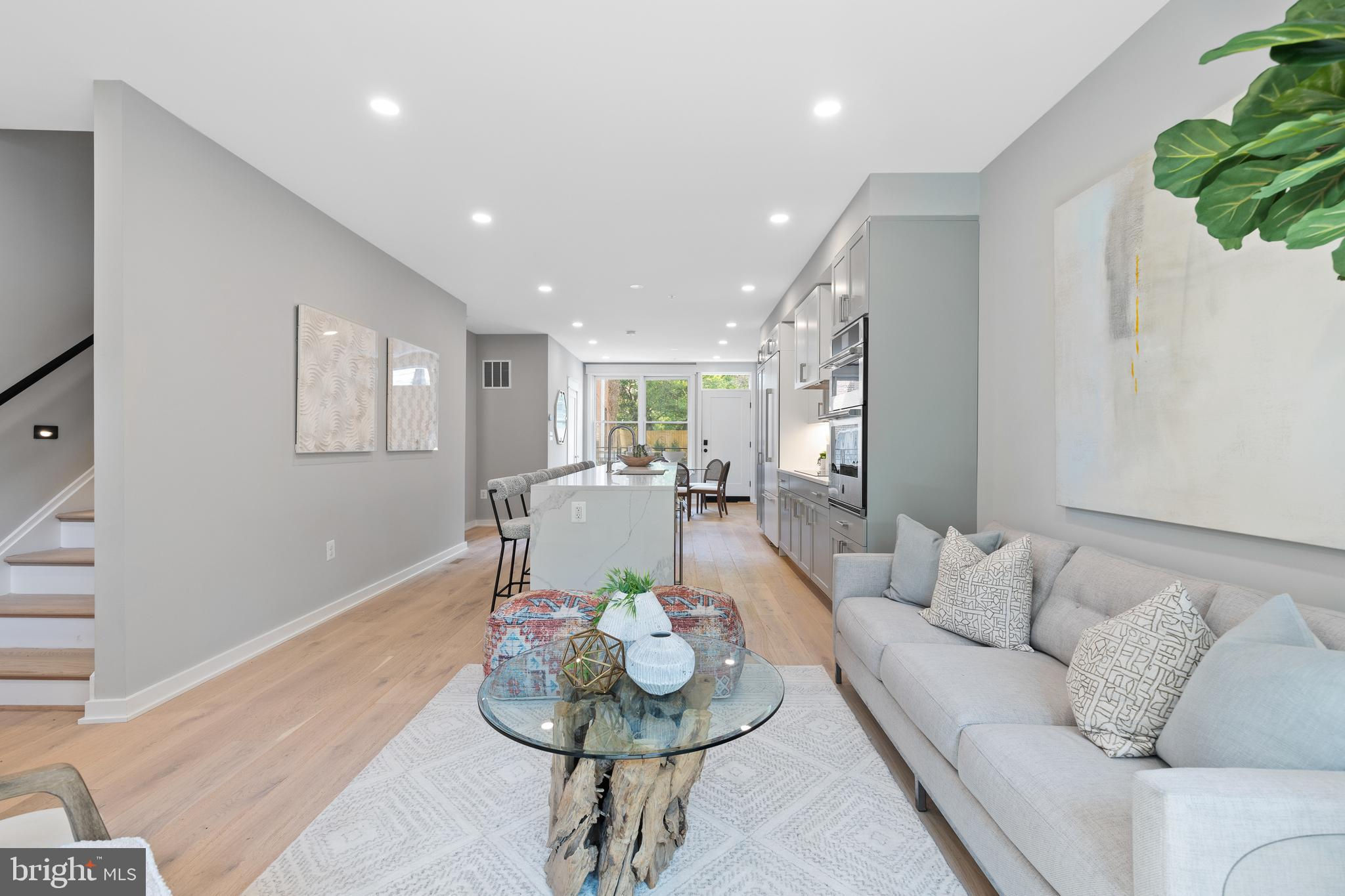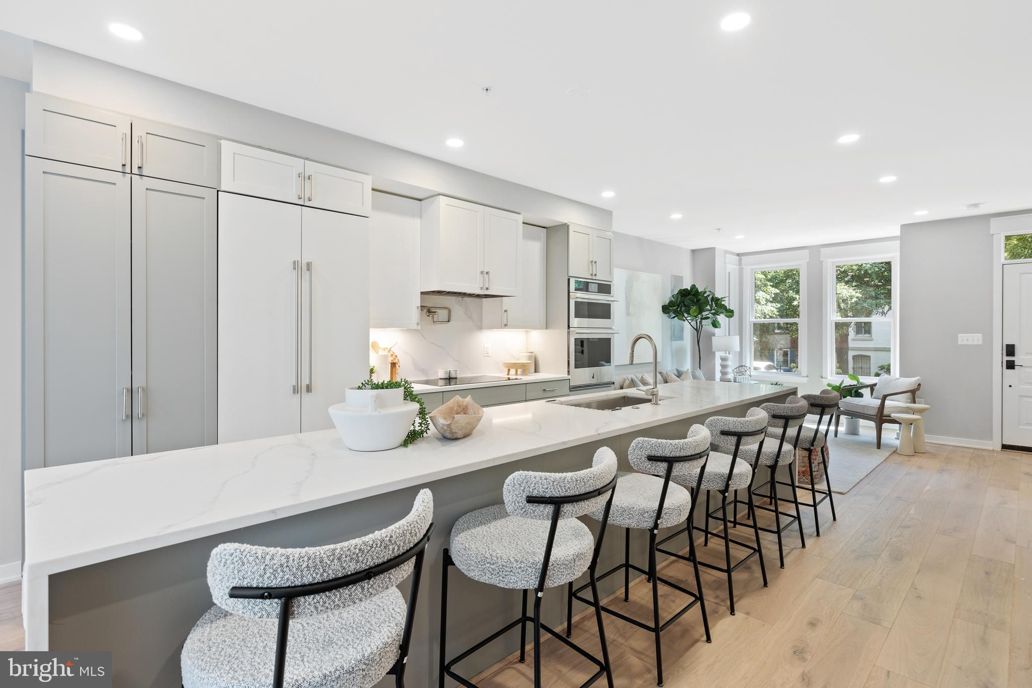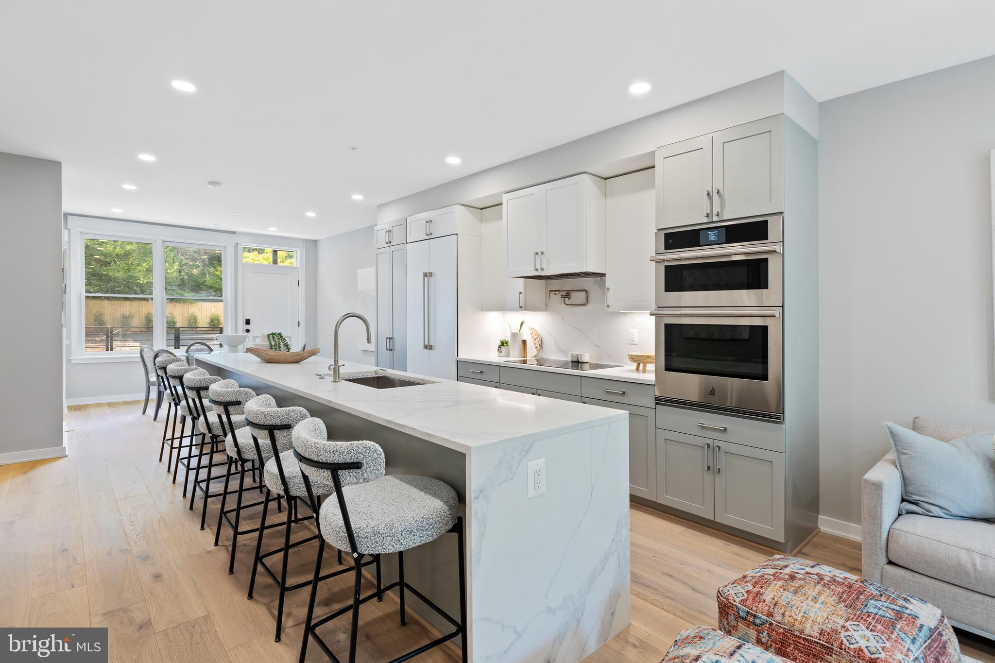 Welcome Home to Ebenezer Row, located at 406 D Street, this exquisite new construction spans an impressive 2,500 square feet across four levels, providing a perfect blend of privacy and spaciousness. The home features a modern layout with 5 bedrooms and 5.5 bathrooms, each thoughtfully designed with an en-suite bathrooms in all bedrooms, making it ideal for families or for hosting guests. This property offers dual-car parking—a notable convenience in its vibrant neighborhood. The architectural design is cutting-edge, equipped with state-of-the-art amenities and finishes, setting a new standard for luxurious urban living. Inside, the residence showcases top-tier Jenn Air appliances, including an induction cooktop that complements the culinary experience. The kitchen is a work of art, featuring bespoke J Suss cabinetry and a striking waterfall island at the heart of an open-plan layout, seamlessly integrating living and dining areas—perfect for both entertaining and relaxation. Comfort meets style in the spacious bedrooms, each fitted with elfa closet systems for maximum organization. The primary bathroom offers a tranquil retreat with a frameless shower and dual vanity, while the guest suites boast large tubs with mosaic tile finishes, providing a spa-like atmosphere. The lower level enhances living space with a large family room, a fully equipped wet bar, an additional laundry room, and a generously-sized bedroom with an en-suite bathroom. Every detail in this home is meticulously crafted, from the 9-foot ceilings that invite natural light, to the wide plank oak flooring with a matte finish, adding a touch of understated elegance. This property is not just a home, but a lifestyle choice, offering an unparalleled living experience in the heart of Washington, D.C., just moments away from Barracks Row, Eastern Market, and the Ballpark District. This is where modern amenities meet luxurious comfort, creating the ultimate urban sanctuary.