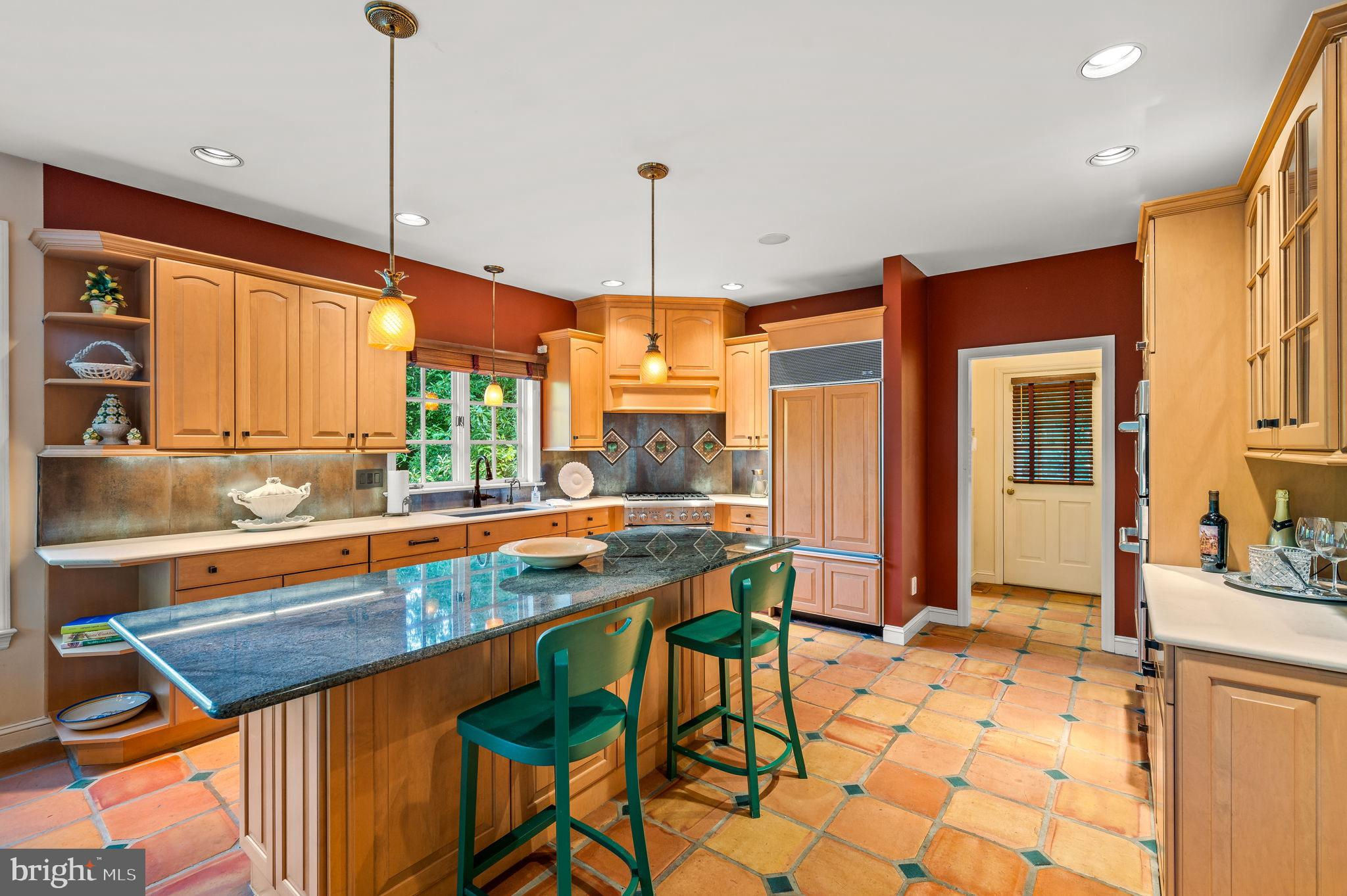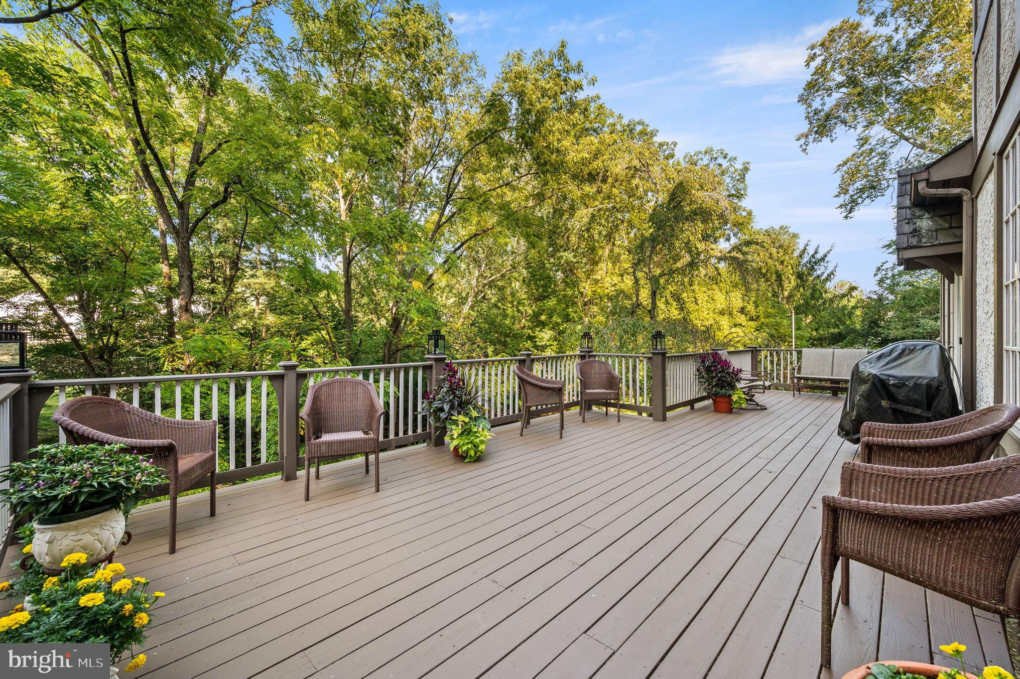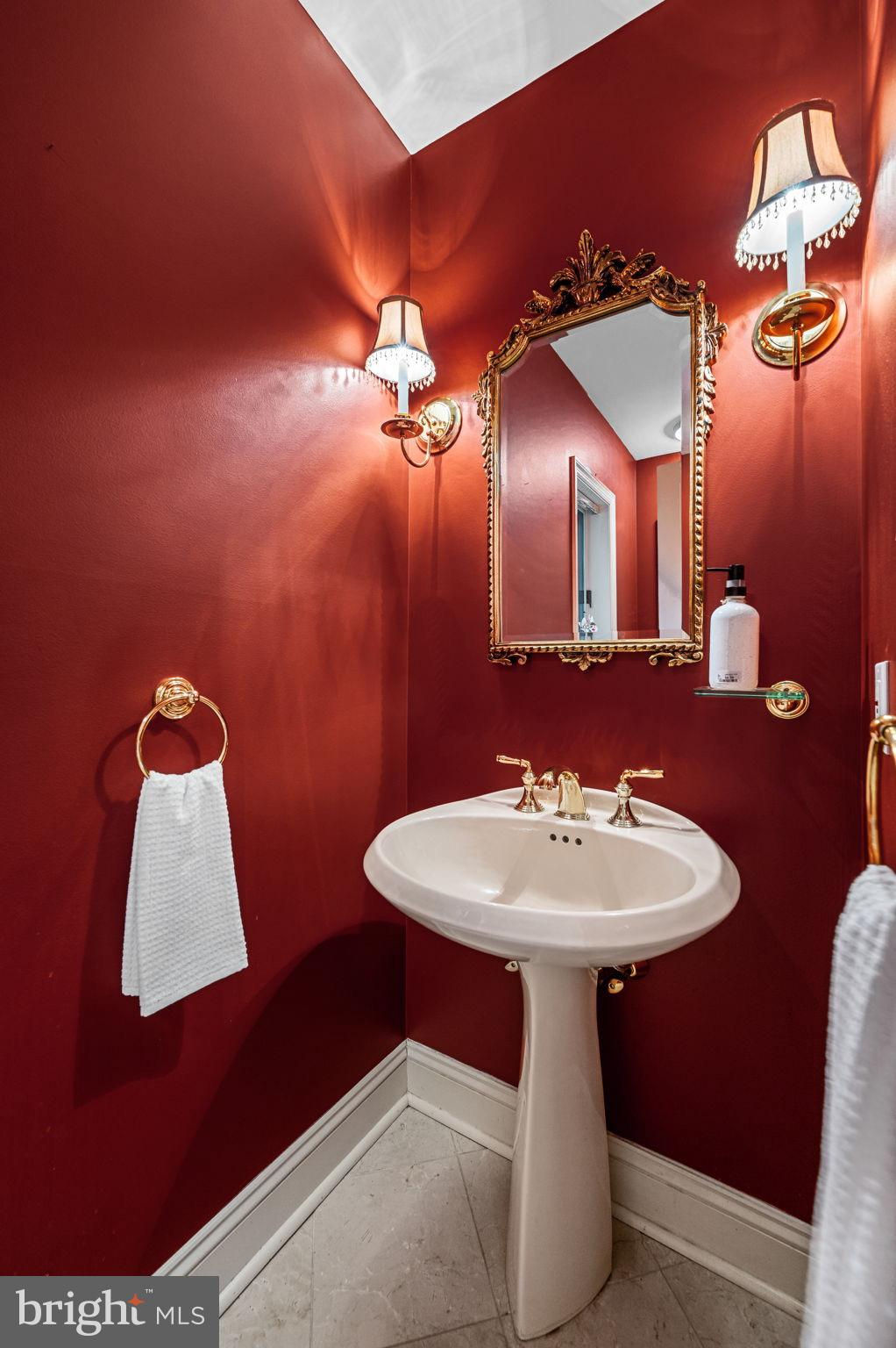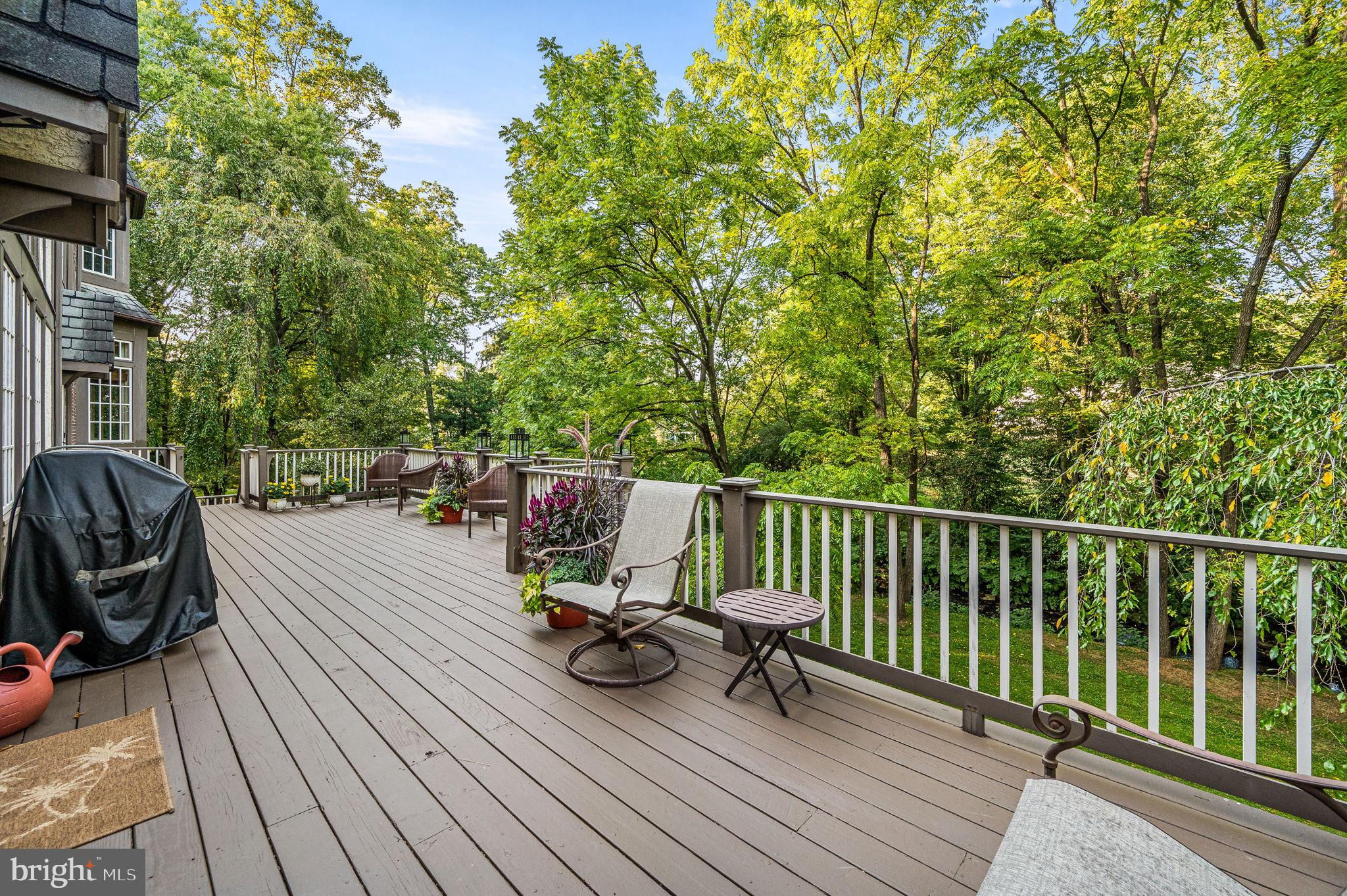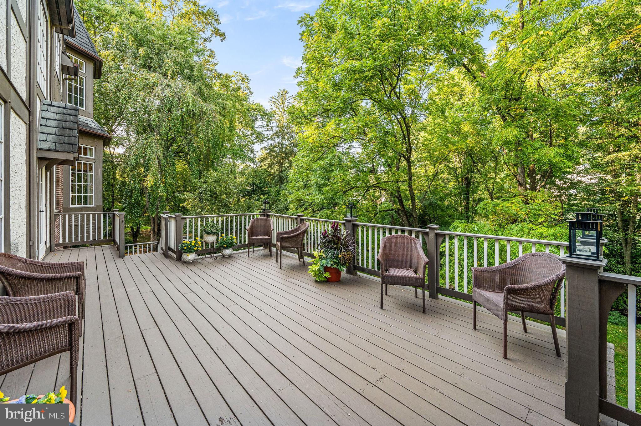 Impressive Tudor estate located on the quiet little segment of Old Gulph Road in a prestigious neighborhood on a picturesque 1.1-acre lot overlooking Mill Creek in Northside Bryn Mawr. Designed by Peter Batchelor and built by E. Allen Reeves in 1993, this architectural gem earned the Merit Shop Award of Excellence for superior craftsmanship and design. Arriving via the inviting circular driveway, you are greeted by the elegant front facade with stone and brick details. Enter through the grand wood front door,flanked by side panels and a transom, into a majestic center hall featuring marble floors, picture frame and crown molding, brass sconces, and a sweeping staircase with a large picture window and impressive chandelier. The grand center hall leads to the main areas of the home through double French doors. The spacious living room offers two large seating areas and a bay window overlooking the beautifully landscaped rear grounds—ideal for a piano. It includes an elegant crystal ceiling fixture, hardwood floors, crown and picture frame molding, and an exquisite gas fireplace with a marble surround and detailed mantel. A single French door leads to a cozy turret-shaped study with built-in bookcases, cabinetry, and a corner gas fireplace. On the opposite side of the center hall is the formal dining room, featuring a triple bay window, crown molding, chair rail, hardwood floors, and a butler's swing door leading to the kitchen. The stunning kitchen boasts a large center island with granite countertops, custom maple cabinetry, a tile backsplash, a bronze nickel sink and faucet, and striking pendant lighting. Top-of-the-line appliances include a newer Cafe by GE smart wall oven with convection, a separate microwave, a Thermador gas range with six burners, a Sub-Zero refrigerator and freezer, and an instant hot water dispenser. The kitchen opens to a charming breakfast area with door to the expansive wraparound deck and a comfortable family room with hardwood floors, an enclosed iron gas fireplace, built-in bookcases, a flat-screen TV, and a magnificent built-in fish tank. A large rear coat closet, a separate pantry room with cabinetry, and a private powder room with marble flooring and a Kohler pedestal sink complete this area. The second floor features a sizable primary suite with an inviting sitting area, arched ceiling, and a circular stained glass window at the top of the staircase. The primary bedroom includes a cathedral ceiling, a gas fireplace with a traditional wood mantel and brass sconces, a ceiling fan, and triple bay windows. The attached primary bath offers cathedral ceilings, double vanities, a glass door shower with windows, a large jacuzzi tub, and access to a dressing area with two large customized walk-in closets. The second floor also includes two generously sized bedrooms with ample closet space and a spacious hall bath with a tub and shower, vanity, and built-in cabinetry. A staircase from the rear hall leads to the third floor, which features two cozy bedrooms and a hall bath with a tub and shower combination. The finished daylight walkout lower level offers additional living space with a large recreation room, a door to the outside patio and rear grounds, a separate au pair suite with a full bath and stall shower (which could also serve as a home office), and a large laundry room with built-in cabinetry and sink. This level also provides access to the three-car garage. This exquisite home is offered at an exceptional price and is just minutes from the Bryn Mawr train station and the town of Bryn Mawr, known for its shopping and restaurants.