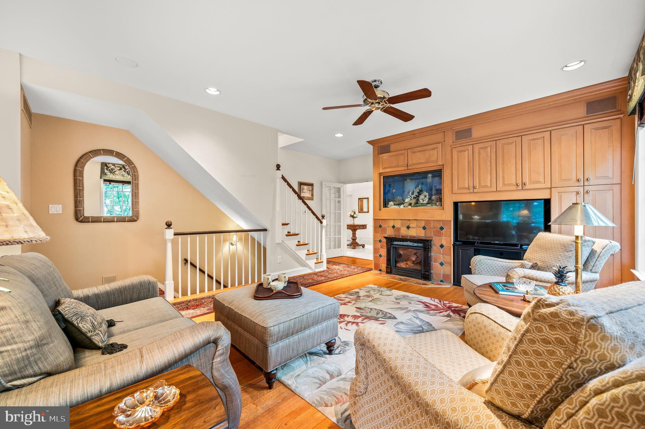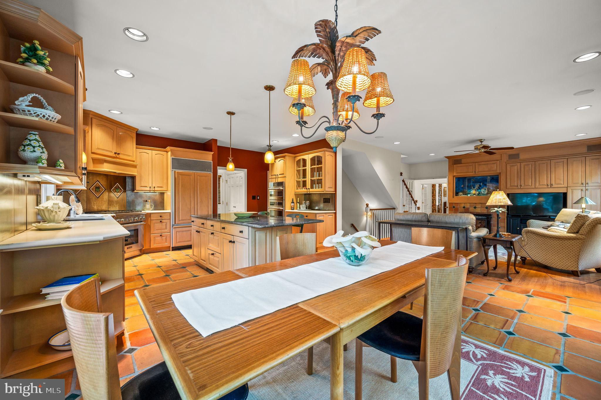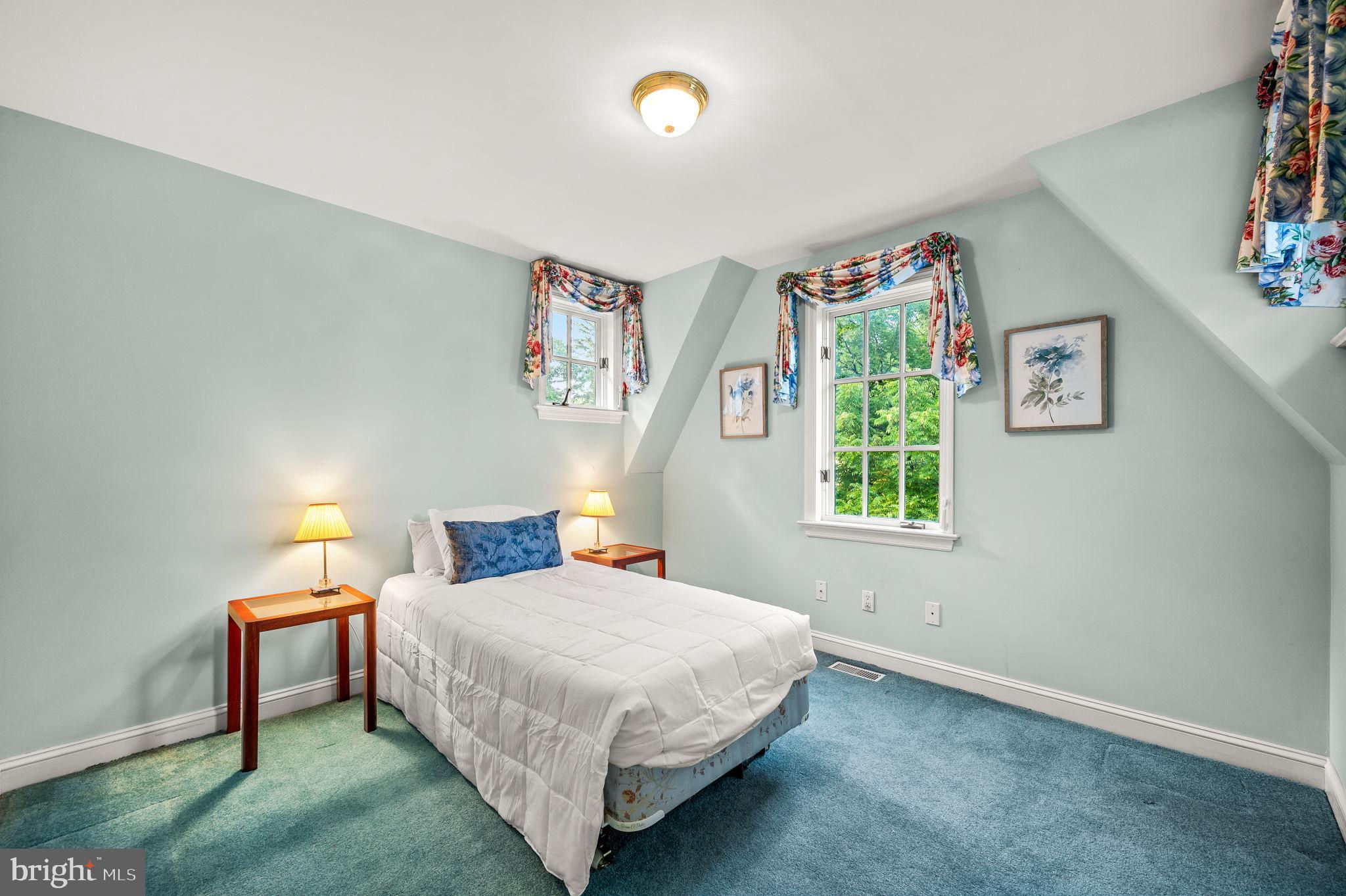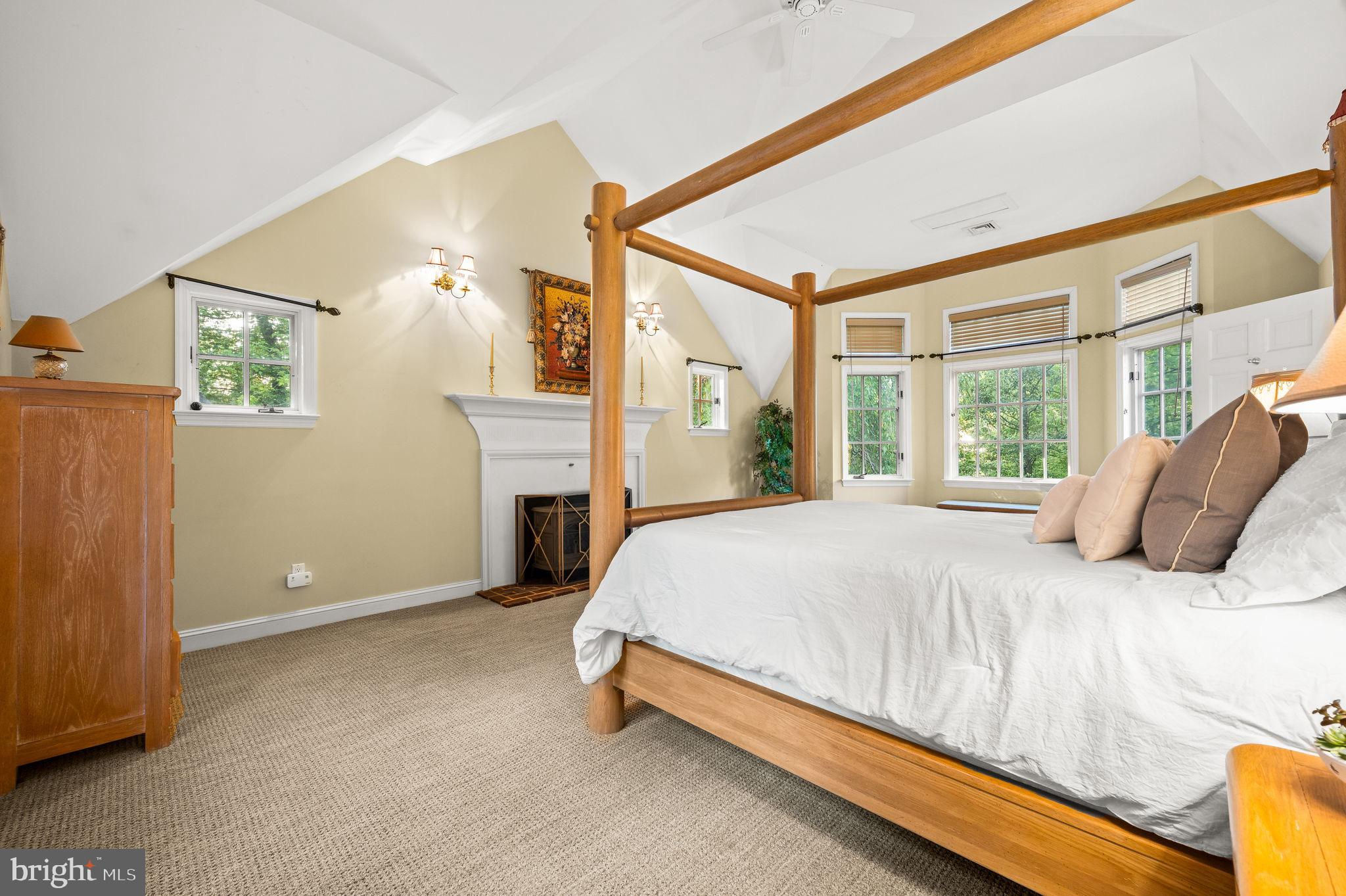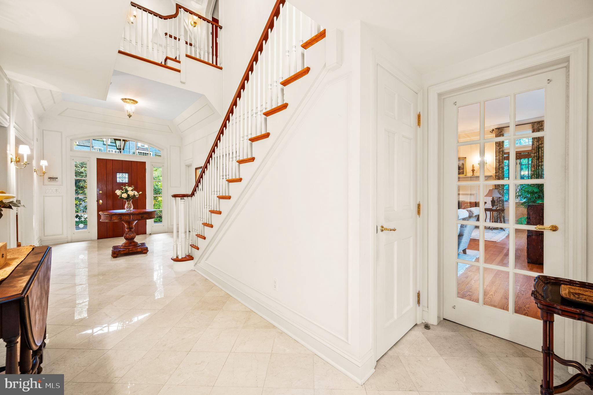 Impressive Tudor estate located on the quiet little segment of Old Gulph Road in a prestigious neighborhood on a picturesque 1.1-acre lot overlooking Mill Creek in Northside Bryn Mawr. Designed by Peter Batchelor and built by E. Allen Reeves in 1993, this architectural gem earned the Merit Shop Award of Excellence for superior craftsmanship and design. Arriving via the inviting circular driveway, you are greeted by the elegant front facade with stone and brick details. Enter through the grand wood front door,flanked by side panels and a transom, into a majestic center hall featuring marble floors, picture frame and crown molding, brass sconces, and a sweeping staircase with a large picture window and impressive chandelier. The grand center hall leads to the main areas of the home through double French doors. The spacious living room offers two large seating areas and a bay window overlooking the beautifully landscaped rear grounds—ideal for a piano. It includes an elegant crystal ceiling fixture, hardwood floors, crown and picture frame molding, and an exquisite gas fireplace with a marble surround and detailed mantel. A single French door leads to a cozy turret-shaped study with built-in bookcases, cabinetry, and a corner gas fireplace. On the opposite side of the center hall is the formal dining room, featuring a triple bay window, crown molding, chair rail, hardwood floors, and a butler's swing door leading to the kitchen. The stunning kitchen boasts a large center island with granite countertops, custom maple cabinetry, a tile backsplash, a bronze nickel sink and faucet, and striking pendant lighting. Top-of-the-line appliances include a newer Cafe by GE smart wall oven with convection, a separate microwave, a Thermador gas range with six burners, a Sub-Zero refrigerator and freezer, and an instant hot water dispenser. The kitchen opens to a charming breakfast area with door to the expansive wraparound deck and a comfortable family room with hardwood floors, an enclosed iron gas fireplace, built-in bookcases, a flat-screen TV, and a magnificent built-in fish tank. A large rear coat closet, a separate pantry room with cabinetry, and a private powder room with marble flooring and a Kohler pedestal sink complete this area. The second floor features a sizable primary suite with an inviting sitting area, arched ceiling, and a circular stained glass window at the top of the staircase. The primary bedroom includes a cathedral ceiling, a gas fireplace with a traditional wood mantel and brass sconces, a ceiling fan, and triple bay windows. The attached primary bath offers cathedral ceilings, double vanities, a glass door shower with windows, a large jacuzzi tub, and access to a dressing area with two large customized walk-in closets. The second floor also includes two generously sized bedrooms with ample closet space and a spacious hall bath with a tub and shower, vanity, and built-in cabinetry. A staircase from the rear hall leads to the third floor, which features two cozy bedrooms and a hall bath with a tub and shower combination. The finished daylight walkout lower level offers additional living space with a large recreation room, a door to the outside patio and rear grounds, a separate au pair suite with a full bath and stall shower (which could also serve as a home office), and a large laundry room with built-in cabinetry and sink. This level also provides access to the three-car garage. This exquisite home is offered at an exceptional price and is just minutes from the Bryn Mawr train station and the town of Bryn Mawr, known for its shopping and restaurants.