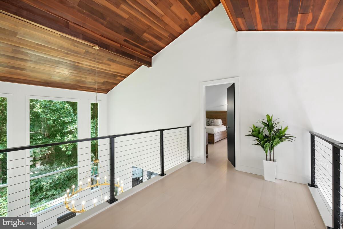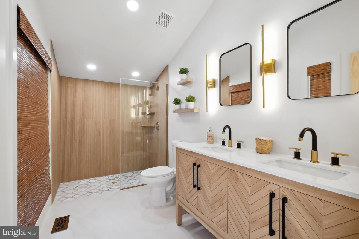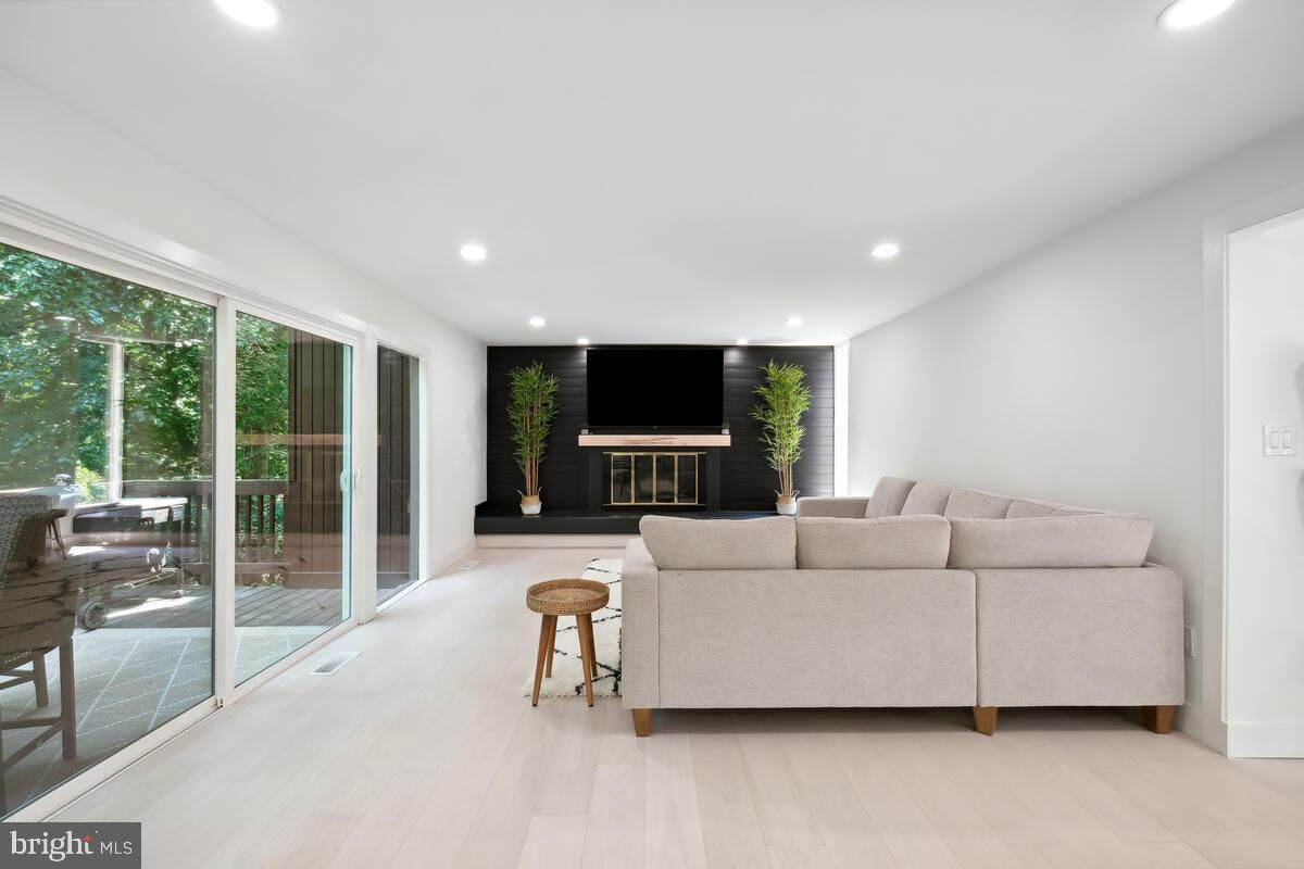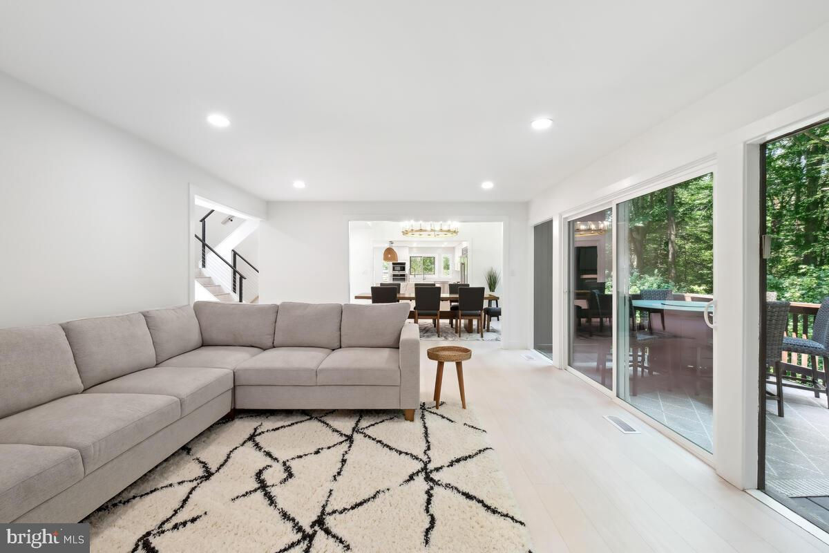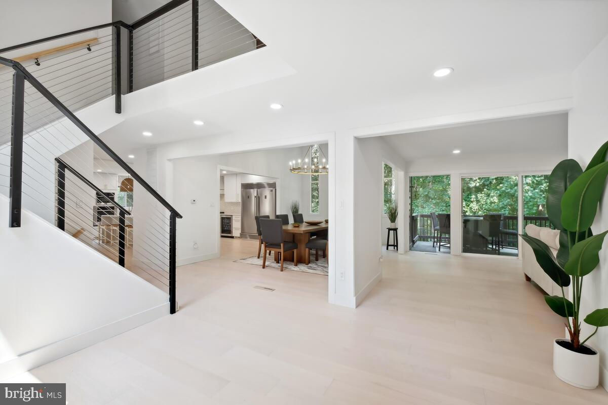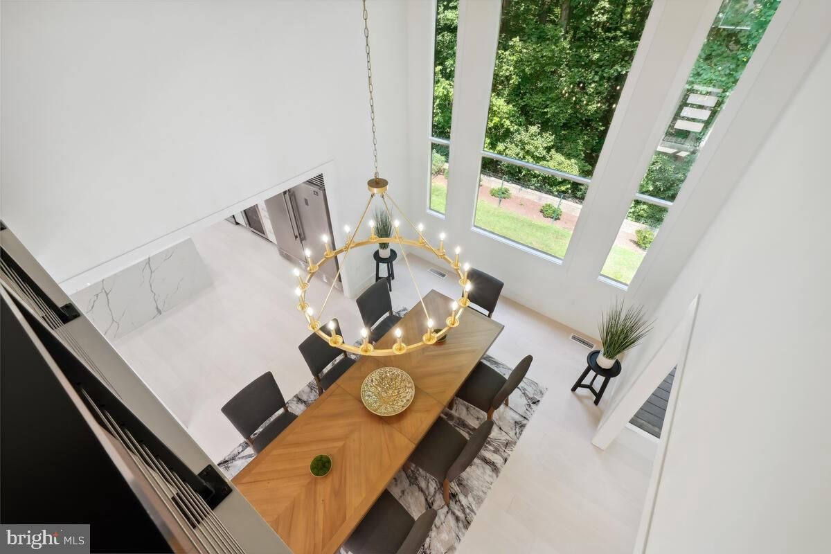 Welcome to 8509 Timber Hill Lane in Potomac, a true mid-century modern home nestled in the wooded setting of East Gate of Potomac. This stunning residence is situated on one of the best lots in the neighborhood, backing up to 110 acres of Buck Branch Stream Valley Park, offering breathtaking views of nature from your private balcony. All mechanicals in the house are less than one year old, ensuring modern efficiency and reliability. As you step inside, you are greeted by a gracious two-story entry foyer, filled with natural light and accented by a custom cable railing system. The main level boasts a large family room, a spacious dining room with two-story ceiling views of the wooded forest, a spacious den, a convenient laundry room, and a gorgeous powder room finished with mid-century appointments. The chef's dream kitchen is equipped with all new appliances, including luxury brand Forno microwave, oven, stove, two dishwashers, and an oversized commercial-grade refrigerator and freezer—all under manufacturer’s warranties. This kitchen is a masterpiece with a custom quartz waterfall center island, golden accented backsplash, counters, and range hood, and mid-century-like wicker medallion lights. Throughout the home, you'll find wide plank hardwood flooring, a custom backsplash, gold accents, upgraded lighting, and high-end finishes. The large primary suite is a luxurious retreat, featuring two spacious walk-in closets—one with a center island and chandelier, perfect for a fashion lover with room for 150 pairs of shoes. The suite also boasts soaring ceilings, providing an airy and elegant space. Additionally, the home includes two fireplaces, perfect for cozy evenings, and custom millwork that adds a touch of sophistication. The fully finished lower level is designed for multigenerational living, offering an expansive space with a private suite that includes a convenient kitchenette and a walkout to a private rear yard that backs to the woods. This level also provides dual zone heating and air conditioning for optimal comfort. Situated conveniently near the newly renovated Cabin John Village Shopping Center and Montgomery Mall, this home offers easy access to major roads, highways, and airports. It is just minutes to Bethesda national parks and so much more. 8509 Timber Hill Lane is a rare gem for those who appreciate the elegance and simplicity of mid-century modern style. This home is truly a work of art, offering a perfect blend of modern amenities and timeless design.