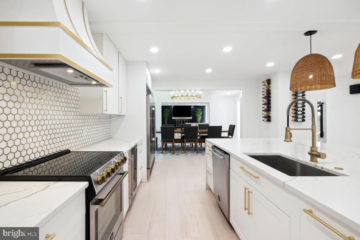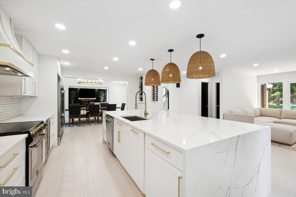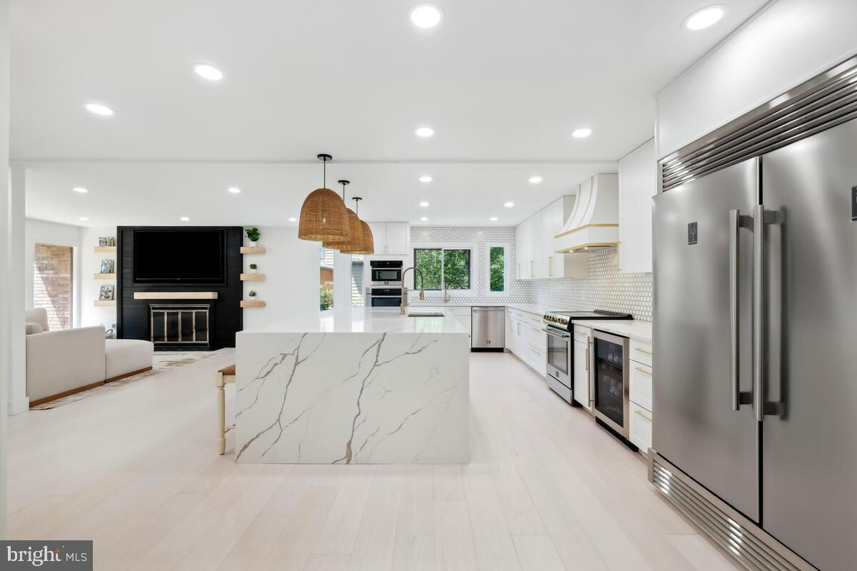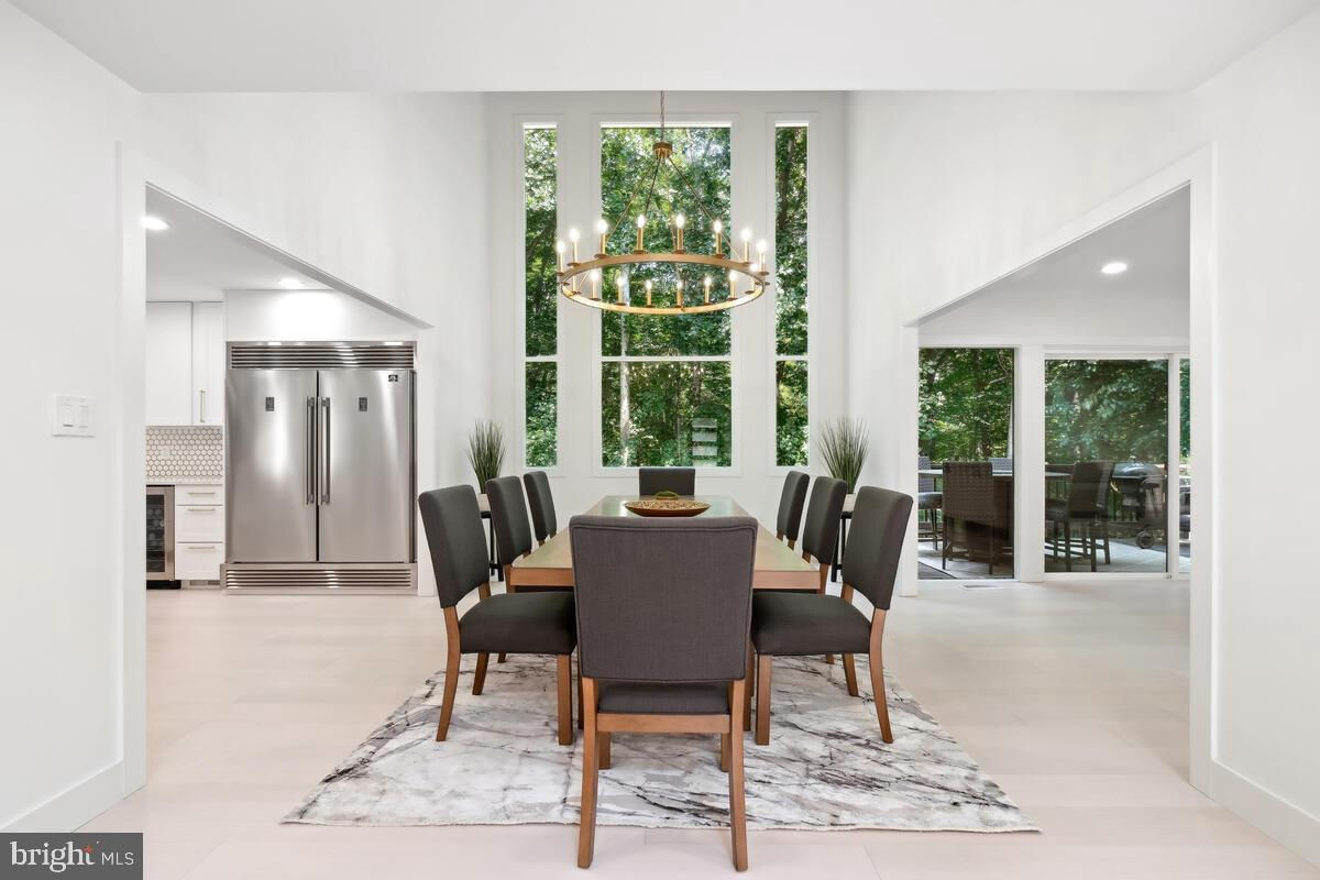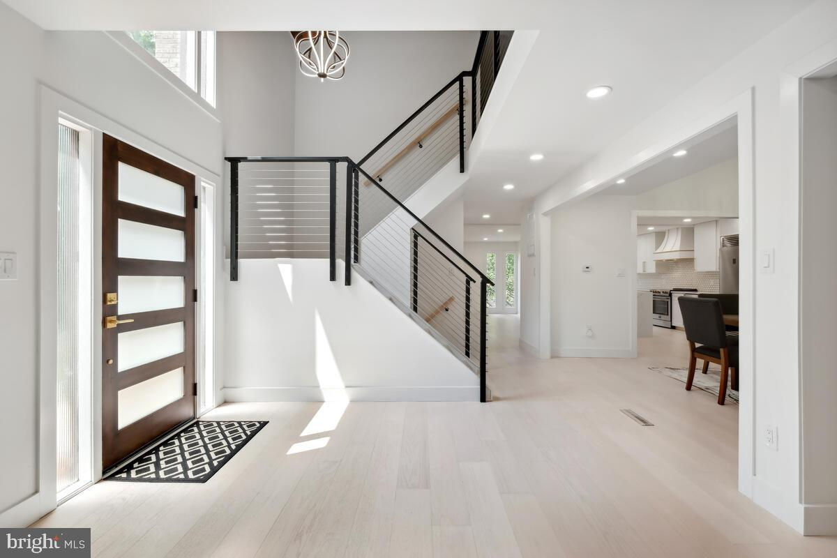 Welcome to 8509 Timber Hill Lane in Potomac, a true mid-century modern home nestled in the wooded setting of East Gate of Potomac. This stunning residence is situated on one of the best lots in the neighborhood, backing up to 110 acres of Buck Branch Stream Valley Park, offering breathtaking views of nature from your private balcony. All mechanicals in the house are less than one year old, ensuring modern efficiency and reliability. As you step inside, you are greeted by a gracious two-story entry foyer, filled with natural light and accented by a custom cable railing system. The main level boasts a large family room, a spacious dining room with two-story ceiling views of the wooded forest, a spacious den, a convenient laundry room, and a gorgeous powder room finished with mid-century appointments. The chef's dream kitchen is equipped with all new appliances, including luxury brand Forno microwave, oven, stove, two dishwashers, and an oversized commercial-grade refrigerator and freezer—all under manufacturer’s warranties. This kitchen is a masterpiece with a custom quartz waterfall center island, golden accented backsplash, counters, and range hood, and mid-century-like wicker medallion lights. Throughout the home, you'll find wide plank hardwood flooring, a custom backsplash, gold accents, upgraded lighting, and high-end finishes. The large primary suite is a luxurious retreat, featuring two spacious walk-in closets—one with a center island and chandelier, perfect for a fashion lover with room for 150 pairs of shoes. The suite also boasts soaring ceilings, providing an airy and elegant space. Additionally, the home includes two fireplaces, perfect for cozy evenings, and custom millwork that adds a touch of sophistication. The fully finished lower level is designed for multigenerational living, offering an expansive space with a private suite that includes a convenient kitchenette and a walkout to a private rear yard that backs to the woods. This level also provides dual zone heating and air conditioning for optimal comfort. Situated conveniently near the newly renovated Cabin John Village Shopping Center and Montgomery Mall, this home offers easy access to major roads, highways, and airports. It is just minutes to Bethesda national parks and so much more. 8509 Timber Hill Lane is a rare gem for those who appreciate the elegance and simplicity of mid-century modern style. This home is truly a work of art, offering a perfect blend of modern amenities and timeless design.