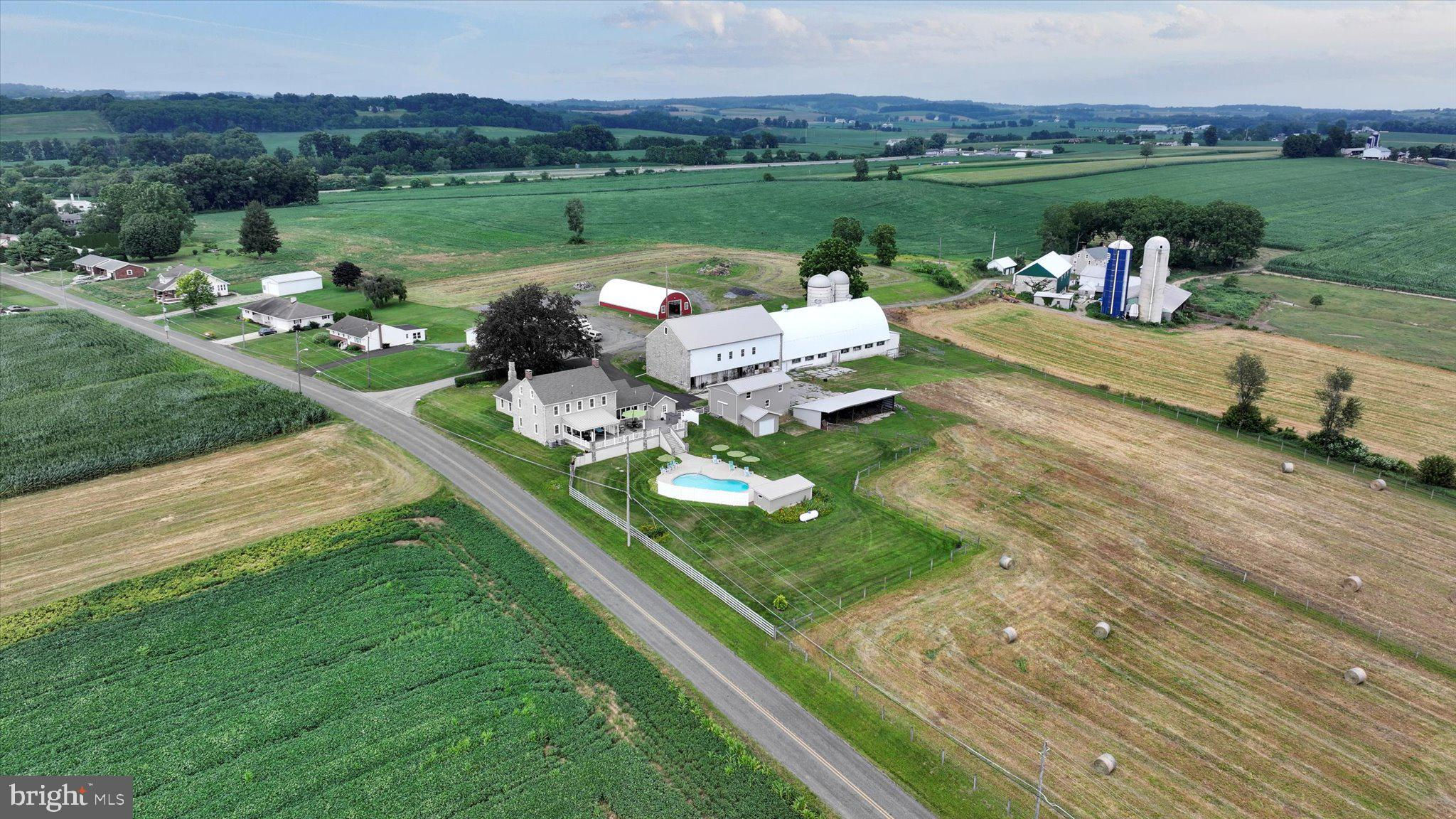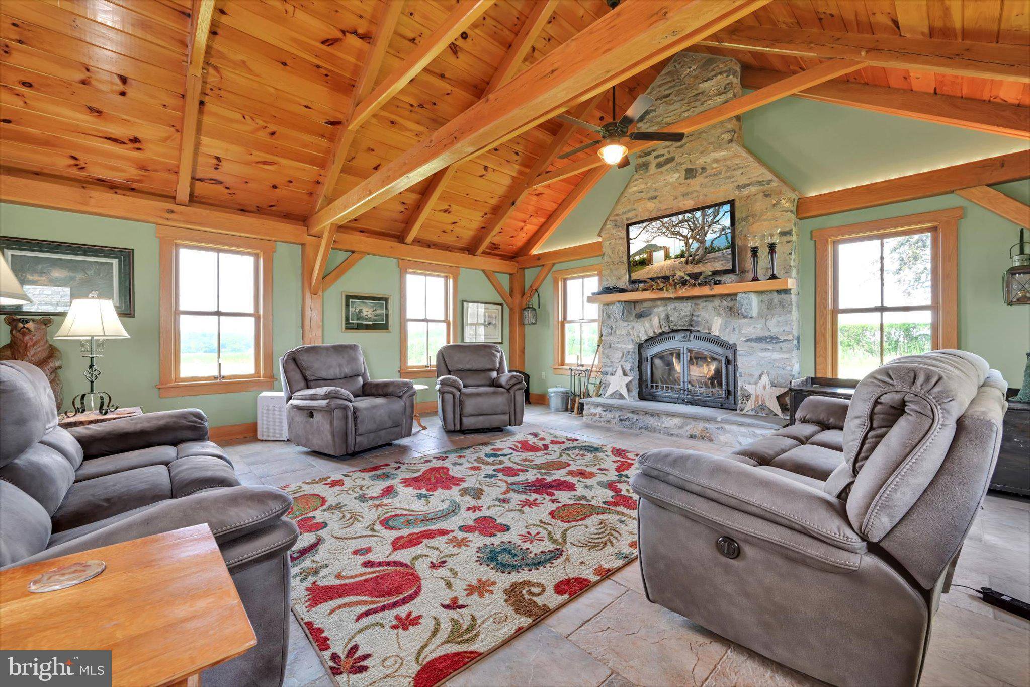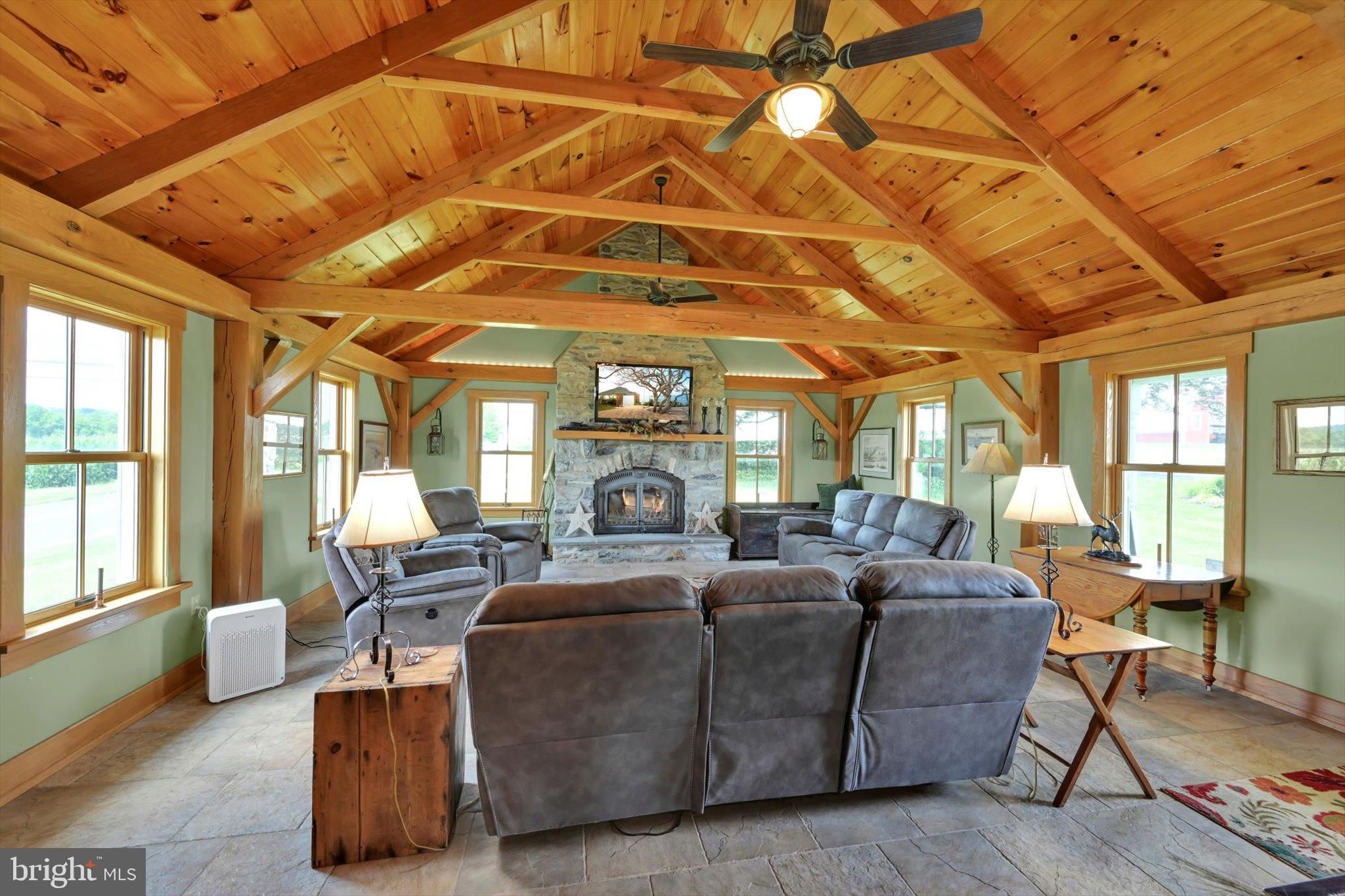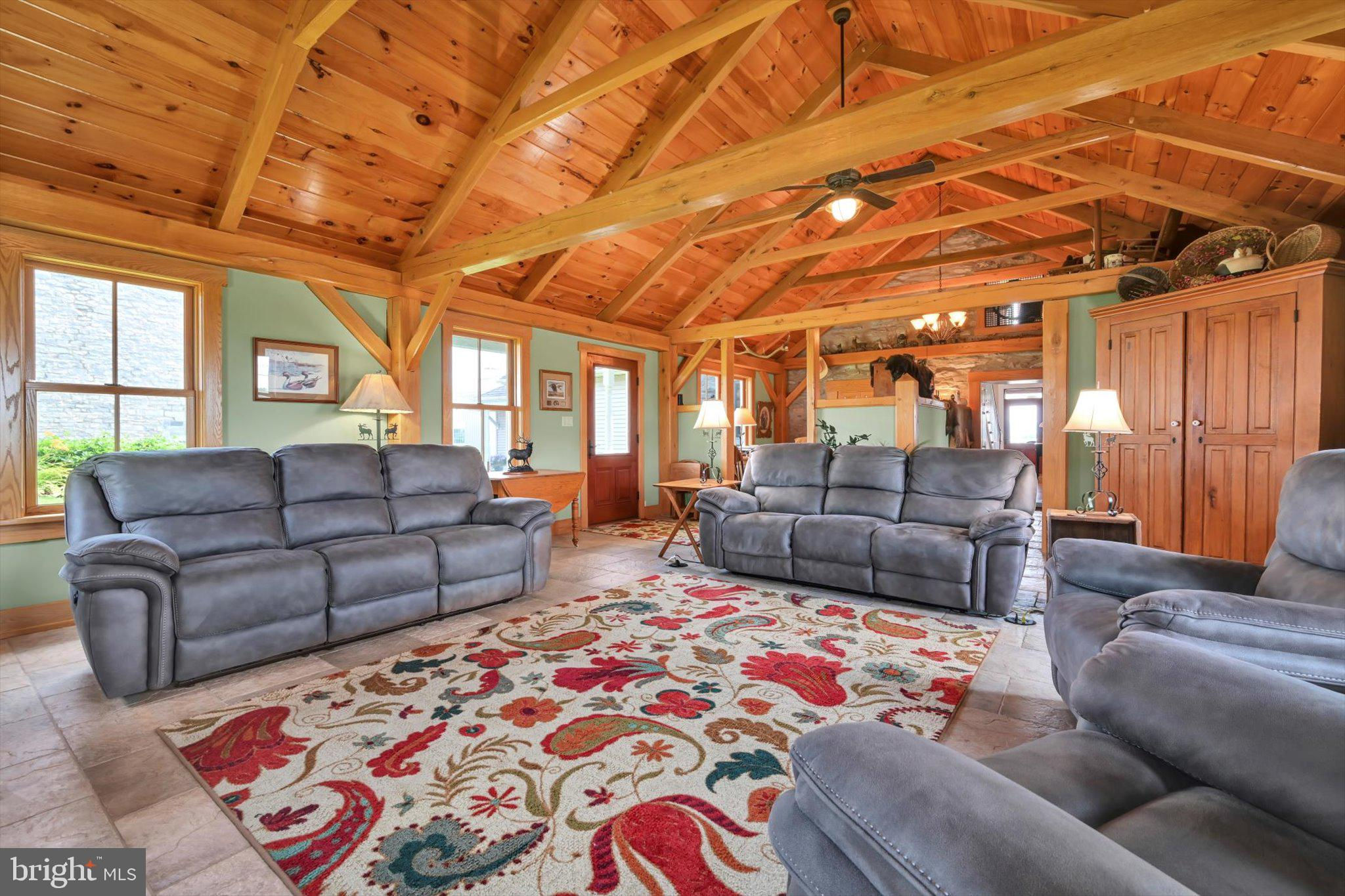 Step into timeless elegance at this masterfully restored 1830 Pennsylvania Dutch Farmhouse nestled on 13 pristine acres. This 6-bedroom, 3.5-bath historic estate has very recently been fully renovated down to the studs using reclaimed materials from the original property and local stone — blending heritage with luxury country living. The entry of the home not only welcomes guests — it tells a story of tradition, refinement, and enduring charm. Thru the solid wood doors, tile flooring underfoot, detailed millwork, and high ceilings offer a blend of timeless craftsmanship and understated elegance. To your left, a hall that leads to a half bath , lunch nook and entryway to the backyard oasis. Lined with built-in custom cabinetry, a commercial size refrigerator and full laundry creates the amazing butlers pantry. The chef's kitchen is the centerpiece, showcasing custom cherry cabinetry, soapstone countertops, a Dacor 6-burner gas range, and a one-of-a-kind wood-fired oven that is often used for the most fabulous home cooked meals. Anchored by warm hardwood floors and framed with deep-sill windows, the expansive dining room is designed to be both inviting and functional. Perfectly positioned between the kitchen and living areas, it features an open-concept layout that encourages effortless flow — ideal for everyday family meals or entertaining guests. Natural light fills the space, while the windows offer scenic views of the pool and horse pastures, creating a picturesque backdrop to every meal. Bathed in natural light and warmed by rich hardwood floors, the formal living room on the main floor is a cozy yet elegant retreat. Oversized windows frame postcard-perfect views of the surrounding hay fields. At the center of the room, a gas fireplace with brick surround adds warmth and charm, complemented by handcrafted wood beam supports that honor the home’s historic architecture. When your guests get a little too cozy, a thoughtfully designed main-floor guest or in-law suite offers a private bedroom and full bathroom, ideal for multi-generational living. At the heart of the home lies the breathtaking Great Room , a true showcase of traditional Germanic peg-built craftsmanship. Soaring vaulted ceilings and exposed wood beams create an open, cathedral-like atmosphere, while the rich knotty pine finishes bring warmth and rustic elegance. A striking floor-to-ceiling stone fireplace with a wood burning stove not only anchors the space with historic character, but also provides radiant heat that rises to warm the second floor. Bathed in natural light from all sides, this room is both a gathering space and a sanctuary — ideal for cozy evenings by the fire or entertaining under the glow of its timberframed beauty. The charming home office featuring custom cabinetry and desk crafted from trees on the property, set against authentic stone walls and wood beams. The second floor features a spacious primary suite with a walk-in closet and a luxurious en-suite bath, complete with a full-body Jacuzzi shower. Two additional bedrooms each offer generous closets and picturesque views of the surrounding pastures from every deep-set window. A full bath with double vanity and tub/shower combo, along with a discreetly tucked-away laundry area, completes this level. Surprisingly, the third floor opens up to two oversized bonus rooms—ideal for bedrooms, hobby spaces, or guest quarters—each room showcases original wood overhead beams and gleaming hardwood floors. Step out onto the expansive back deck and take in panoramic views of the heated pool, charming pool house, and sweeping horse pastures beyond. A lighted stone staircase gracefully descends from the deck to the pool area, creating an inviting and elegant transition for both daytime enjoyment and evening entertaining. REMARKS CONTINUED BELOW :
