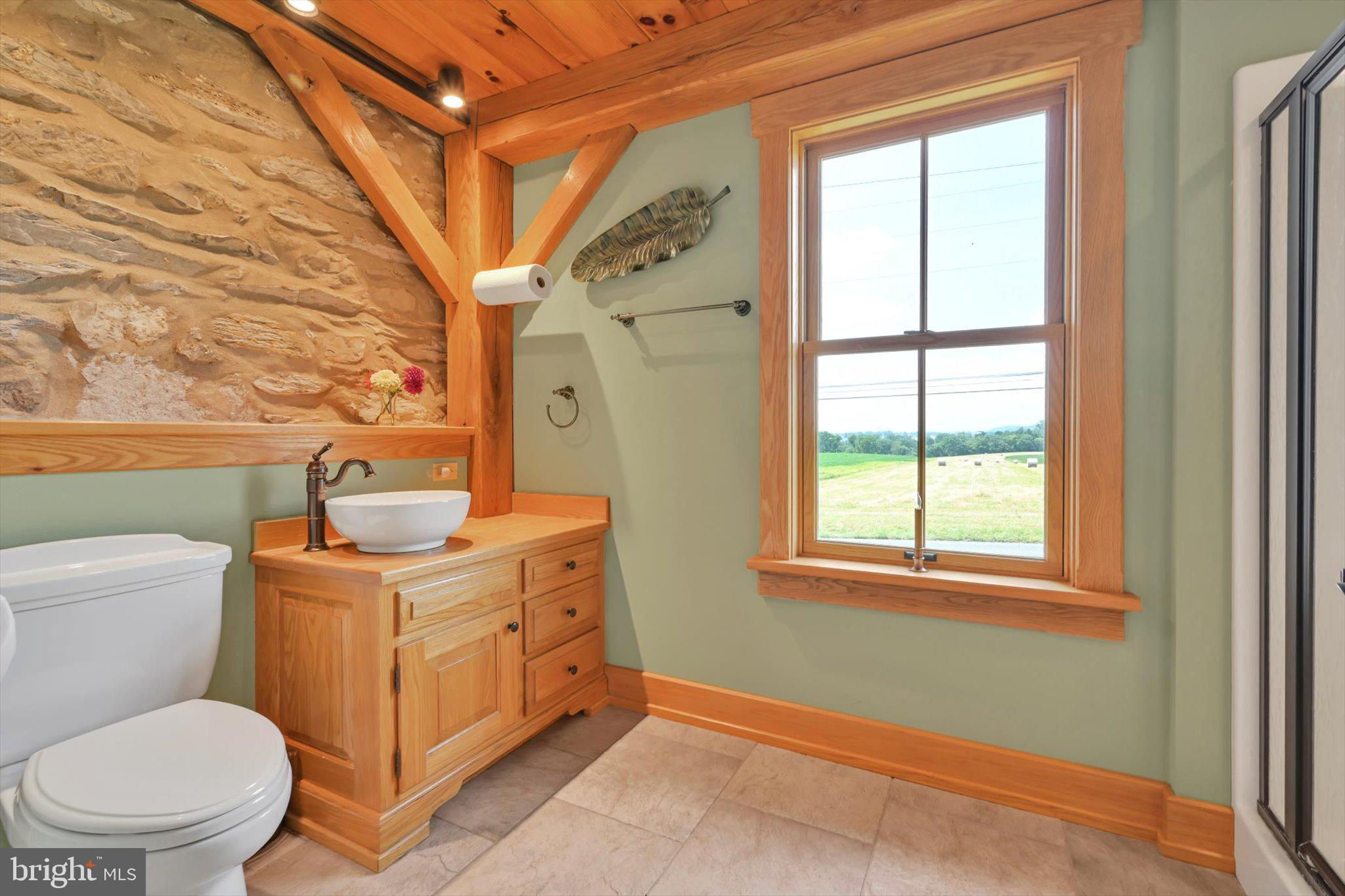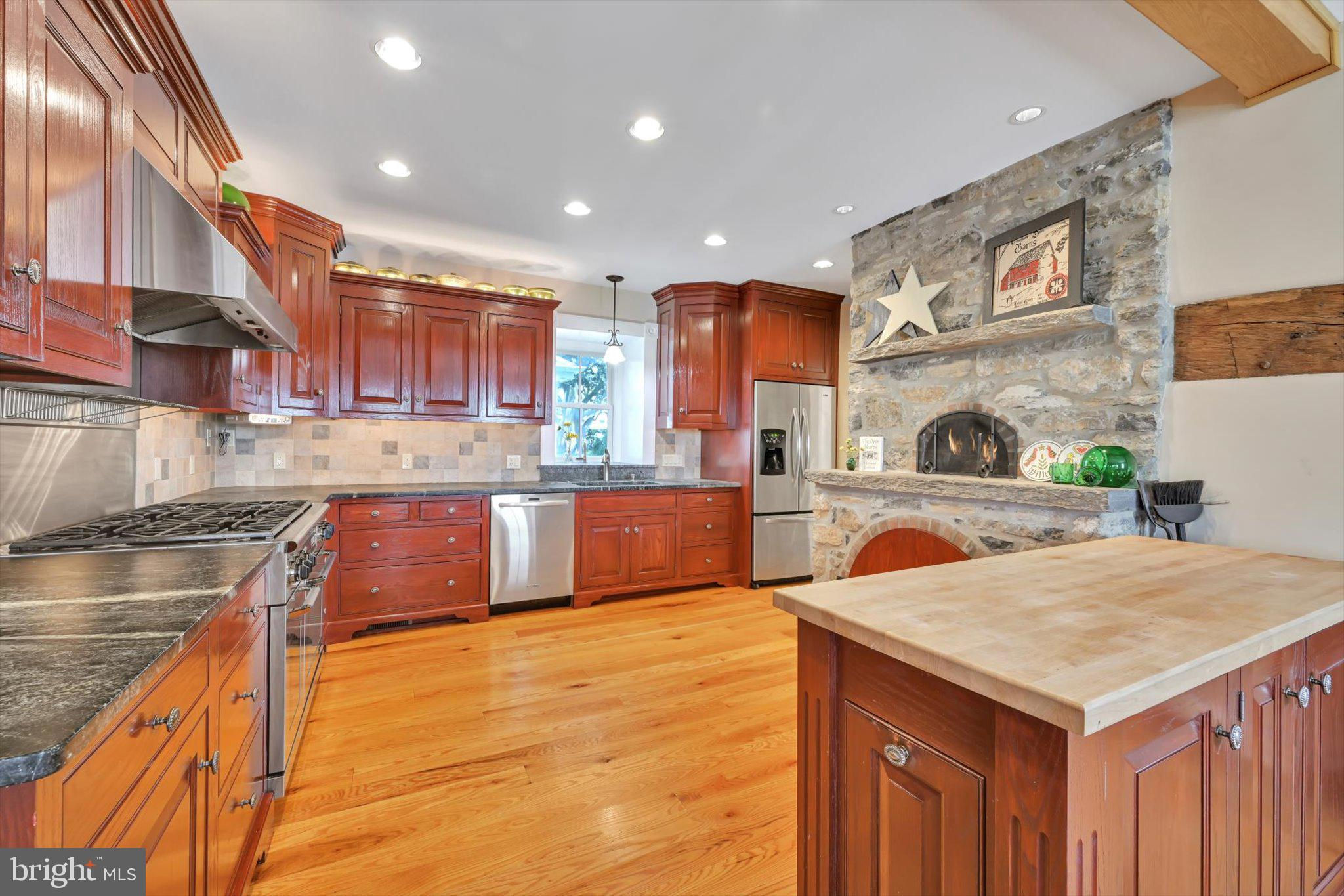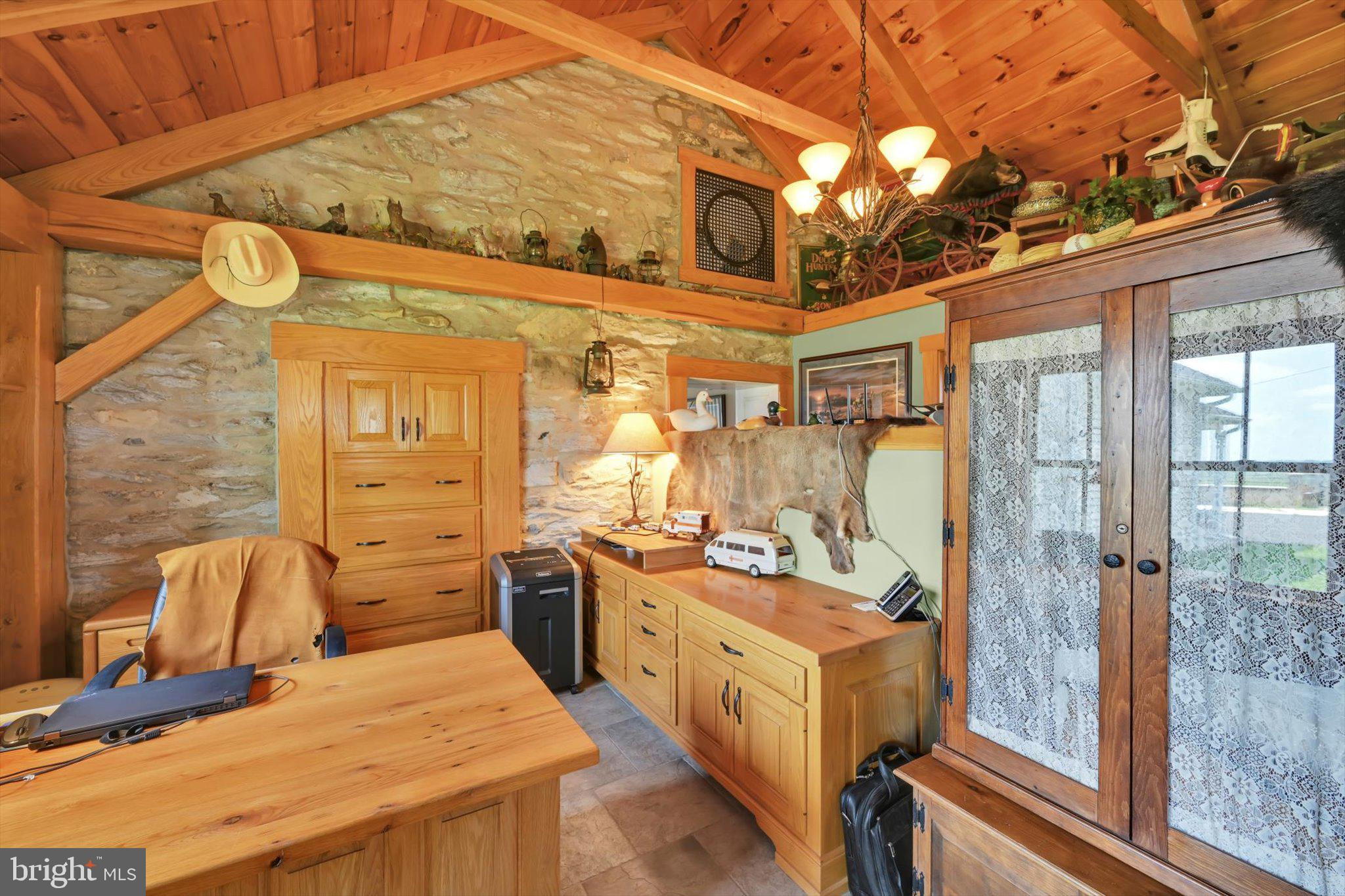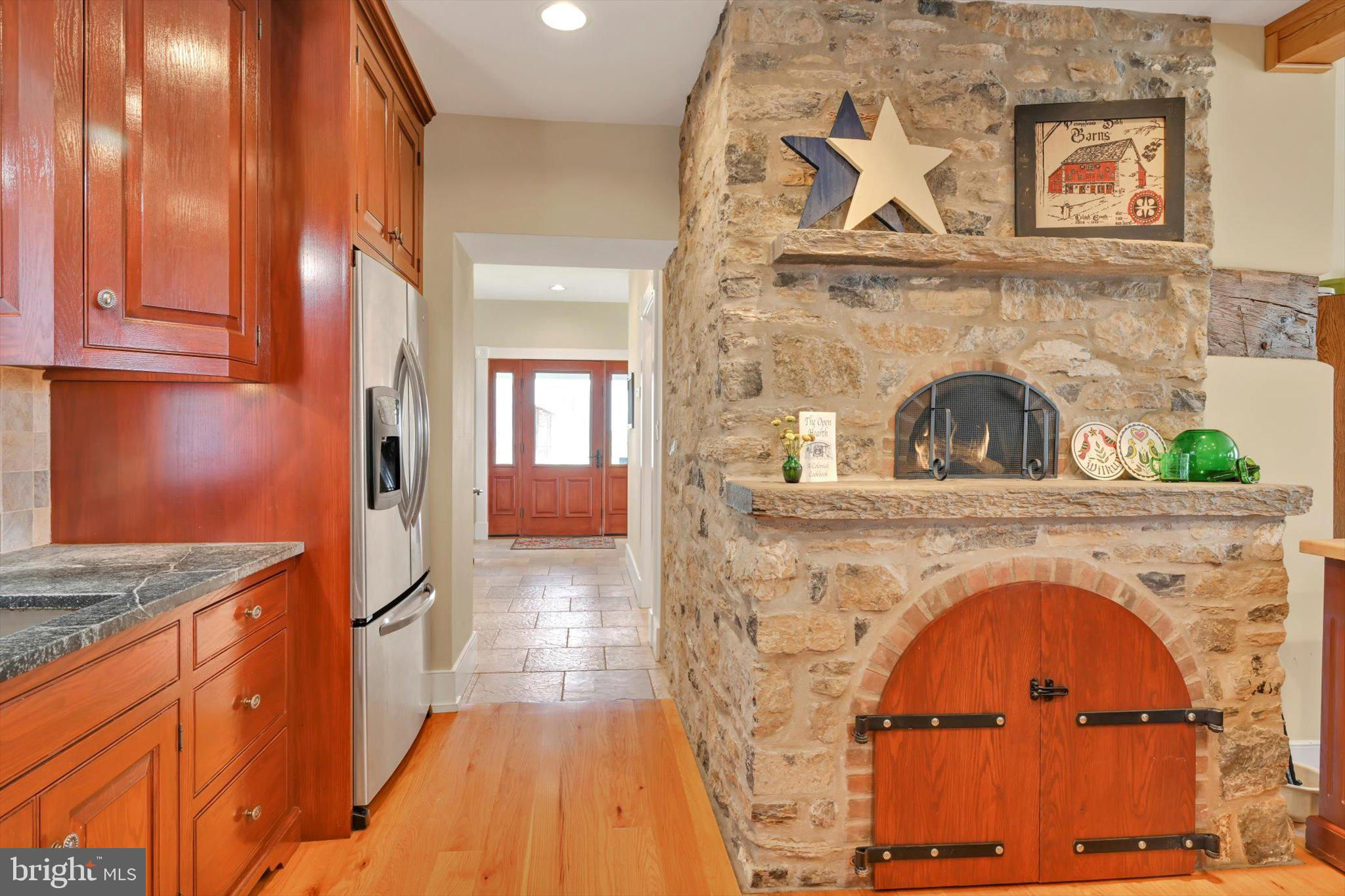 Step into timeless elegance at this masterfully restored 1830 Pennsylvania Dutch Farmhouse nestled on 13 pristine acres. This 6-bedroom, 3.5-bath historic estate has very recently been fully renovated down to the studs using reclaimed materials from the original property and local stone — blending heritage with luxury country living. The entry of the home not only welcomes guests — it tells a story of tradition, refinement, and enduring charm. Thru the solid wood doors, tile flooring underfoot, detailed millwork, and high ceilings offer a blend of timeless craftsmanship and understated elegance. To your left, a hall that leads to a half bath , lunch nook and entryway to the backyard oasis. Lined with built-in custom cabinetry, a commercial size refrigerator and full laundry creates the amazing butlers pantry. The chef's kitchen is the centerpiece, showcasing custom cherry cabinetry, soapstone countertops, a Dacor 6-burner gas range, and a one-of-a-kind wood-fired oven that is often used for the most fabulous home cooked meals. Anchored by warm hardwood floors and framed with deep-sill windows, the expansive dining room is designed to be both inviting and functional. Perfectly positioned between the kitchen and living areas, it features an open-concept layout that encourages effortless flow — ideal for everyday family meals or entertaining guests. Natural light fills the space, while the windows offer scenic views of the pool and horse pastures, creating a picturesque backdrop to every meal. Bathed in natural light and warmed by rich hardwood floors, the formal living room on the main floor is a cozy yet elegant retreat. Oversized windows frame postcard-perfect views of the surrounding hay fields. At the center of the room, a gas fireplace with brick surround adds warmth and charm, complemented by handcrafted wood beam supports that honor the home’s historic architecture. When your guests get a little too cozy, a thoughtfully designed main-floor guest or in-law suite offers a private bedroom and full bathroom, ideal for multi-generational living. At the heart of the home lies the breathtaking Great Room , a true showcase of traditional Germanic peg-built craftsmanship. Soaring vaulted ceilings and exposed wood beams create an open, cathedral-like atmosphere, while the rich knotty pine finishes bring warmth and rustic elegance. A striking floor-to-ceiling stone fireplace with a wood burning stove not only anchors the space with historic character, but also provides radiant heat that rises to warm the second floor. Bathed in natural light from all sides, this room is both a gathering space and a sanctuary — ideal for cozy evenings by the fire or entertaining under the glow of its timberframed beauty. The charming home office featuring custom cabinetry and desk crafted from trees on the property, set against authentic stone walls and wood beams. The second floor features a spacious primary suite with a walk-in closet and a luxurious en-suite bath, complete with a full-body Jacuzzi shower. Two additional bedrooms each offer generous closets and picturesque views of the surrounding pastures from every deep-set window. A full bath with double vanity and tub/shower combo, along with a discreetly tucked-away laundry area, completes this level. Surprisingly, the third floor opens up to two oversized bonus rooms—ideal for bedrooms, hobby spaces, or guest quarters—each room showcases original wood overhead beams and gleaming hardwood floors. Step out onto the expansive back deck and take in panoramic views of the heated pool, charming pool house, and sweeping horse pastures beyond. A lighted stone staircase gracefully descends from the deck to the pool area, creating an inviting and elegant transition for both daytime enjoyment and evening entertaining. REMARKS CONTINUED BELOW :